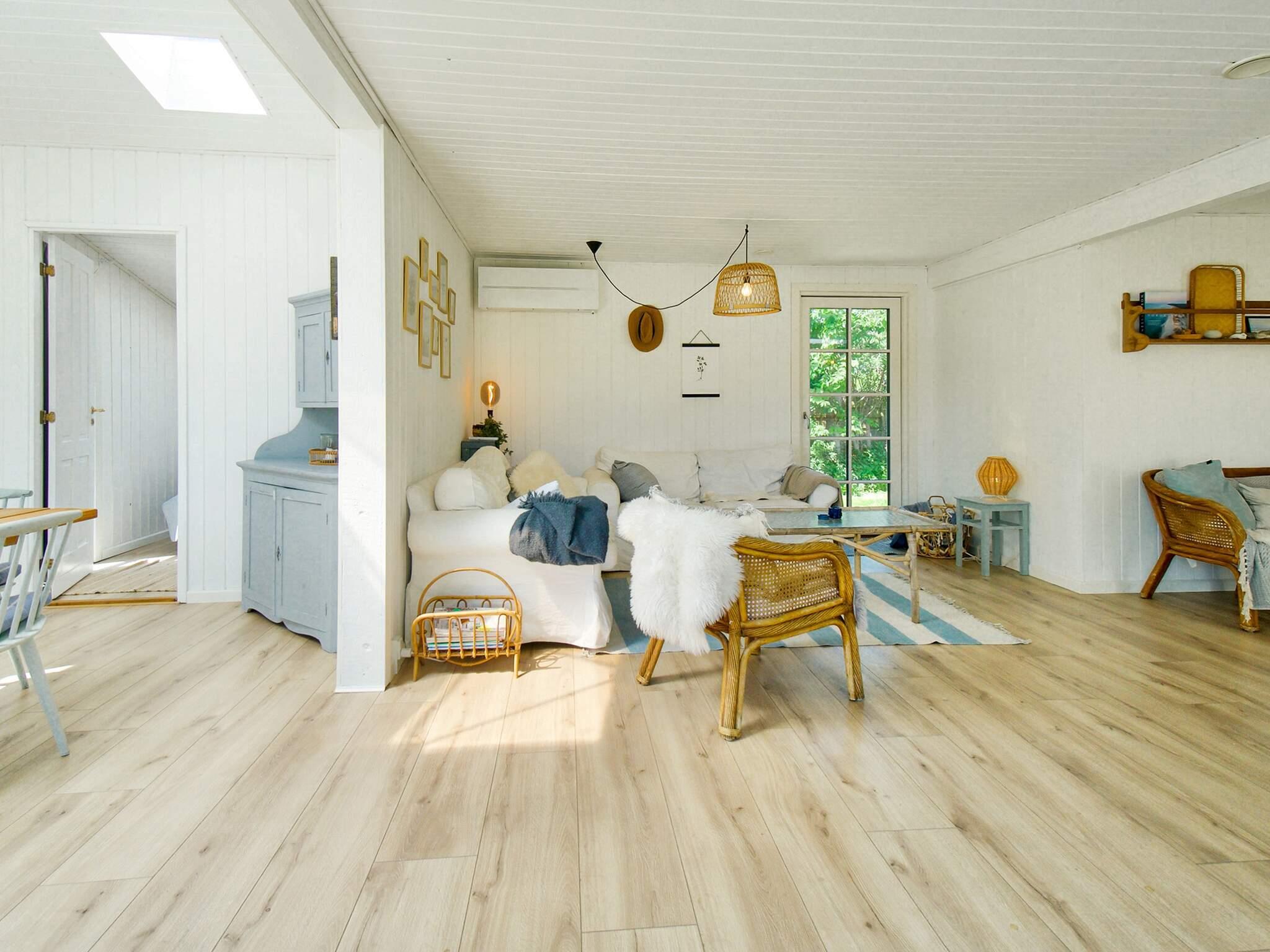 Indvendigt byder huset på tre soveværelser og et åbent køkken i forbindelse med stuen, hvilket skaber et naturligt samlingsrum for familielivet. Opholdsstuen er lys og rummelig med franske døre, der åbner ud til en stor terrasse, hvor du kan nyde måltider, solbade eller slappe af med en bog. En hyggelig brændeovn og en klimavenlig varmepumpe giver varme på køligere dage.
