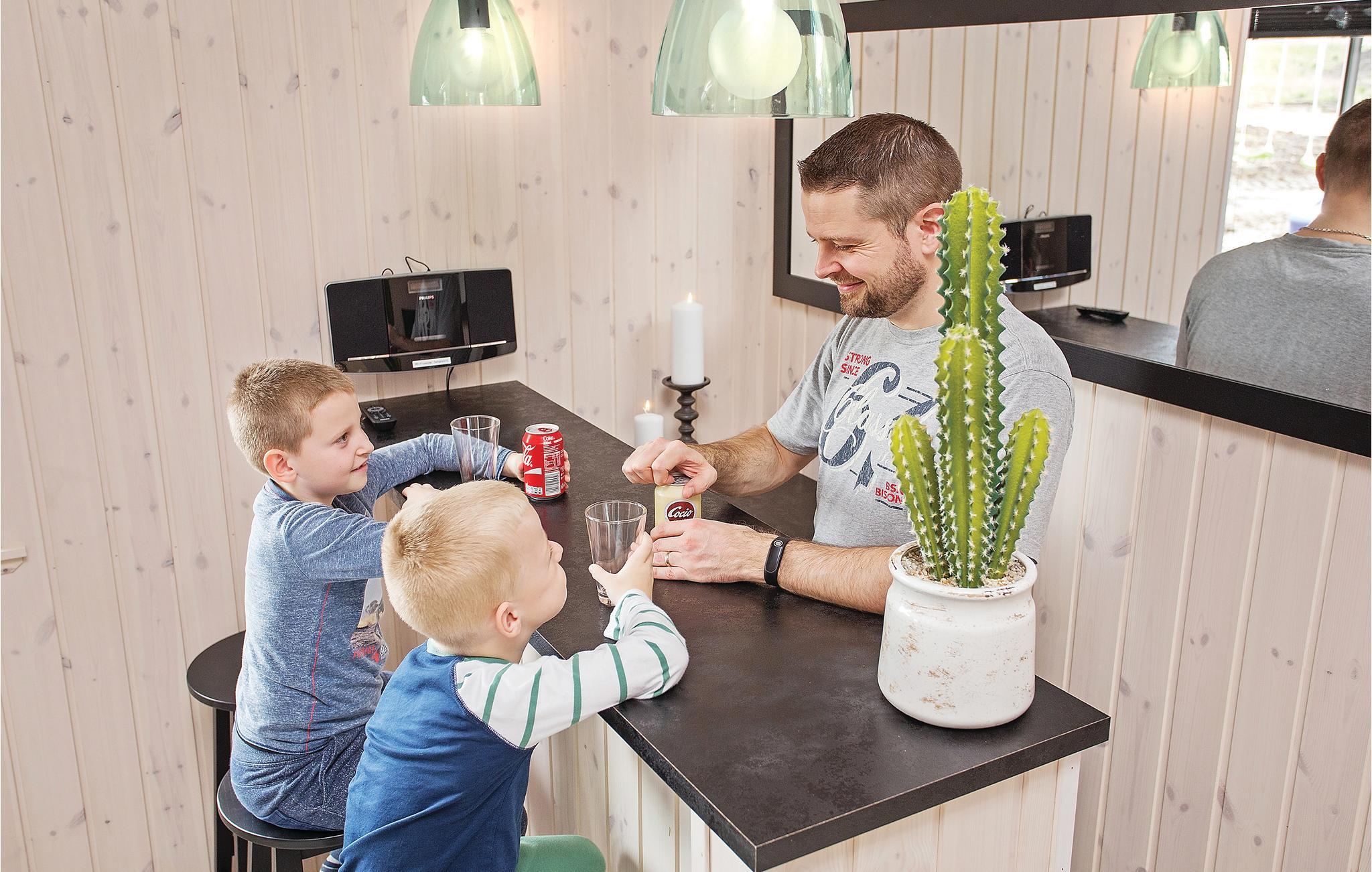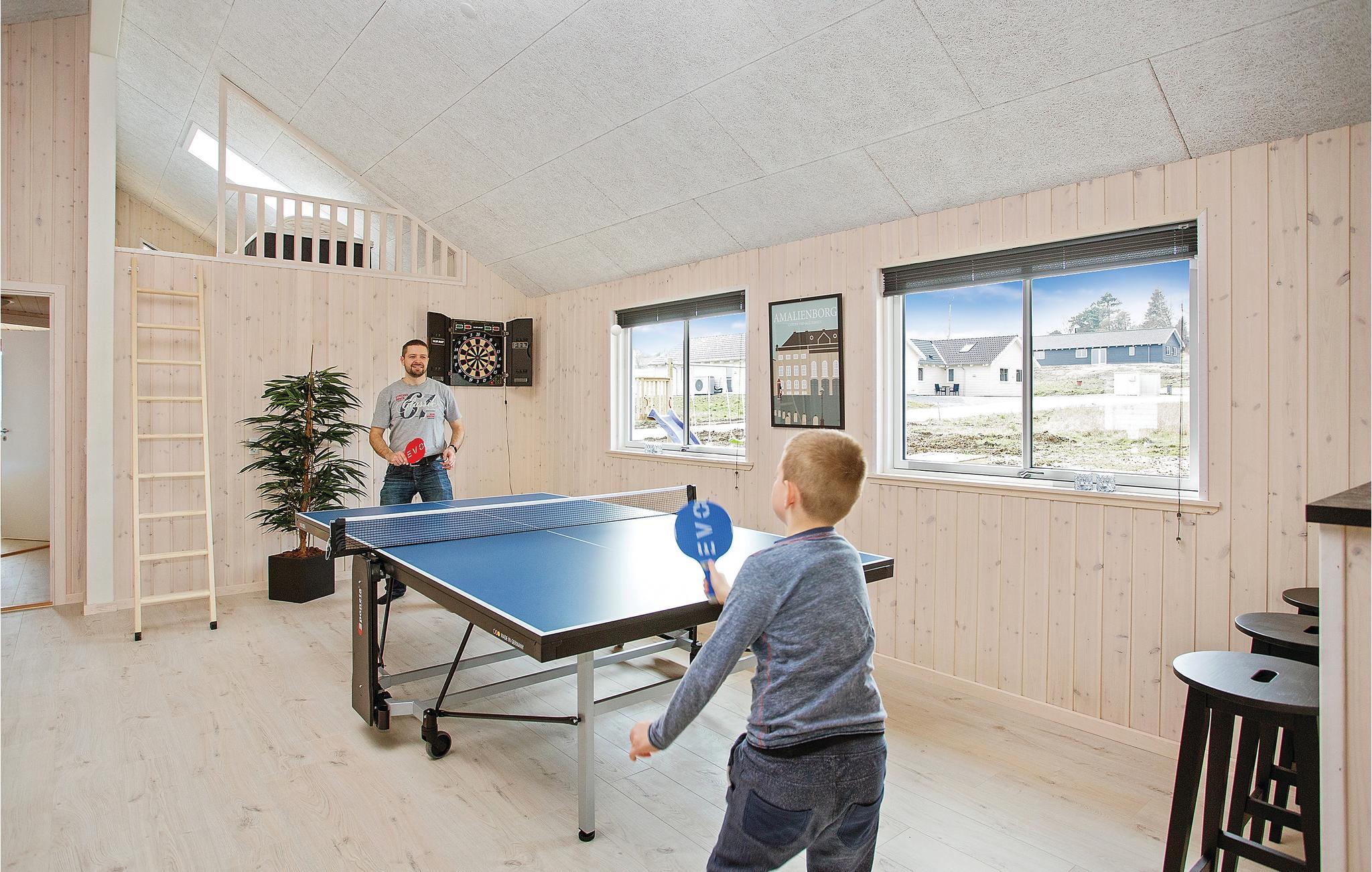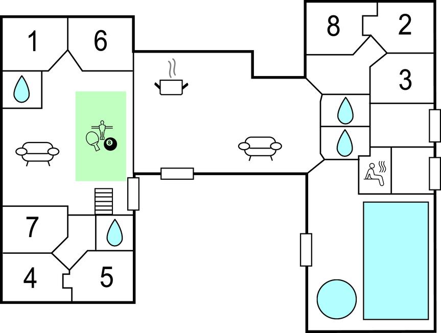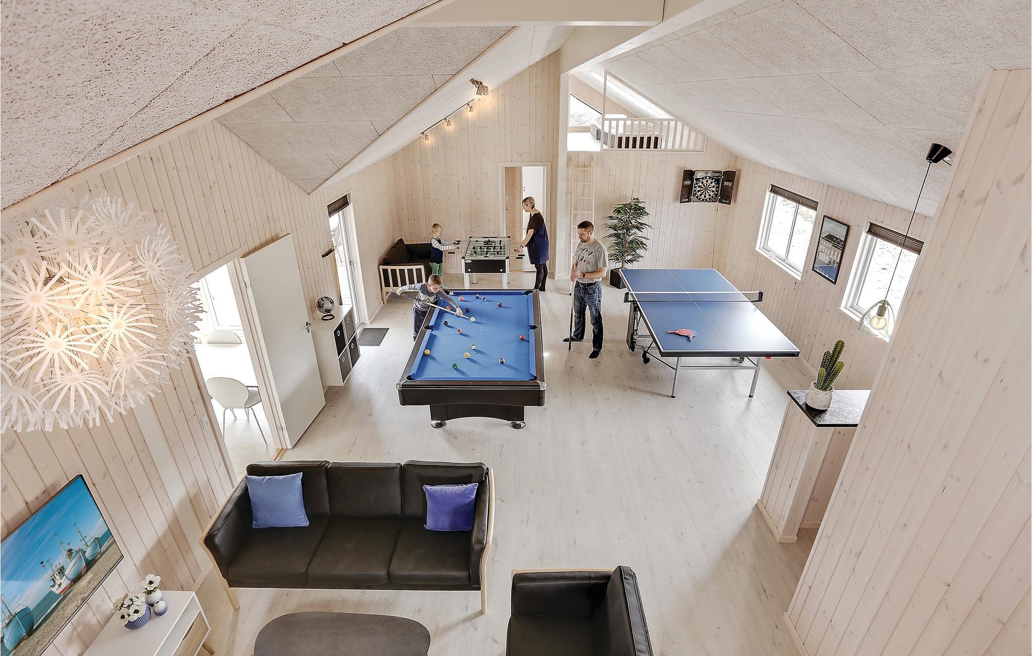 Her er rammerne skabt for en dejlig ferie med aktiviteter for hele familien. Det arkitekttegnede luksusferiehus har mange gode soveværelser fordelt på tre sektioner; hver sektion har et separat badeværelse, så flere familier kan nyde ferien sammen. Hertil kommer et aktivitetsrum med bordfodbold, billard, bordtennis og dart. Aktivitetsrummet ligger lige ved siden af den store stue med direkte adgang til køkkenet. I poolrummet kan I boltre jer både i poolen og i det fire personers spabad. Herfra er også adgang til saunaen. Adgang til poolrummet er børnesikret med et håndtag, der er placeret højt på døren samt en lås, således at husets yngste gæster ikke kan komme alene ud i rummet.