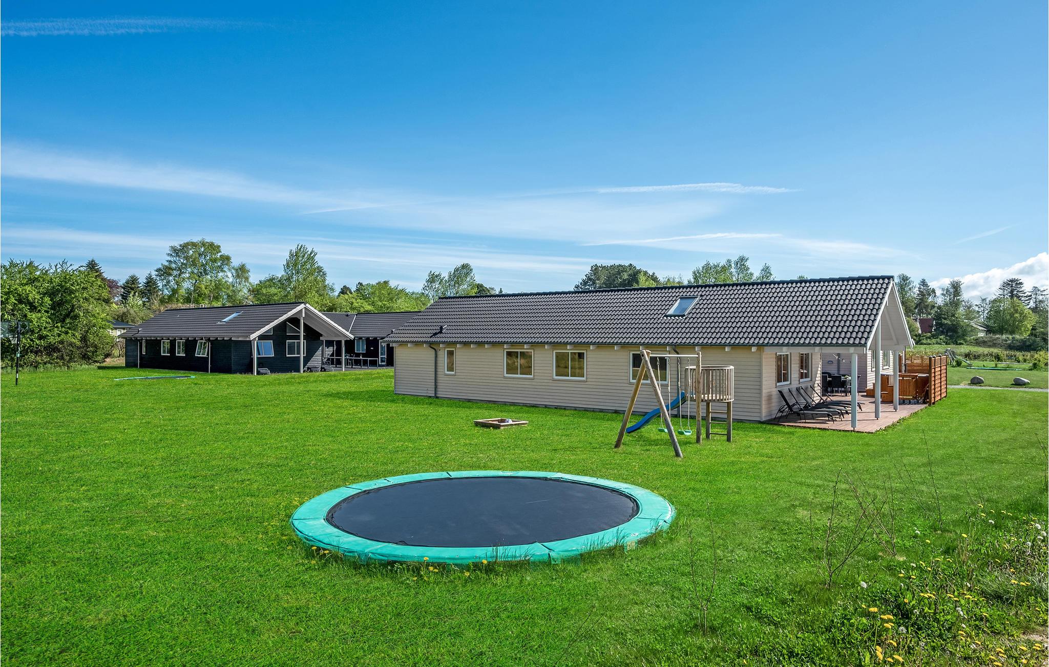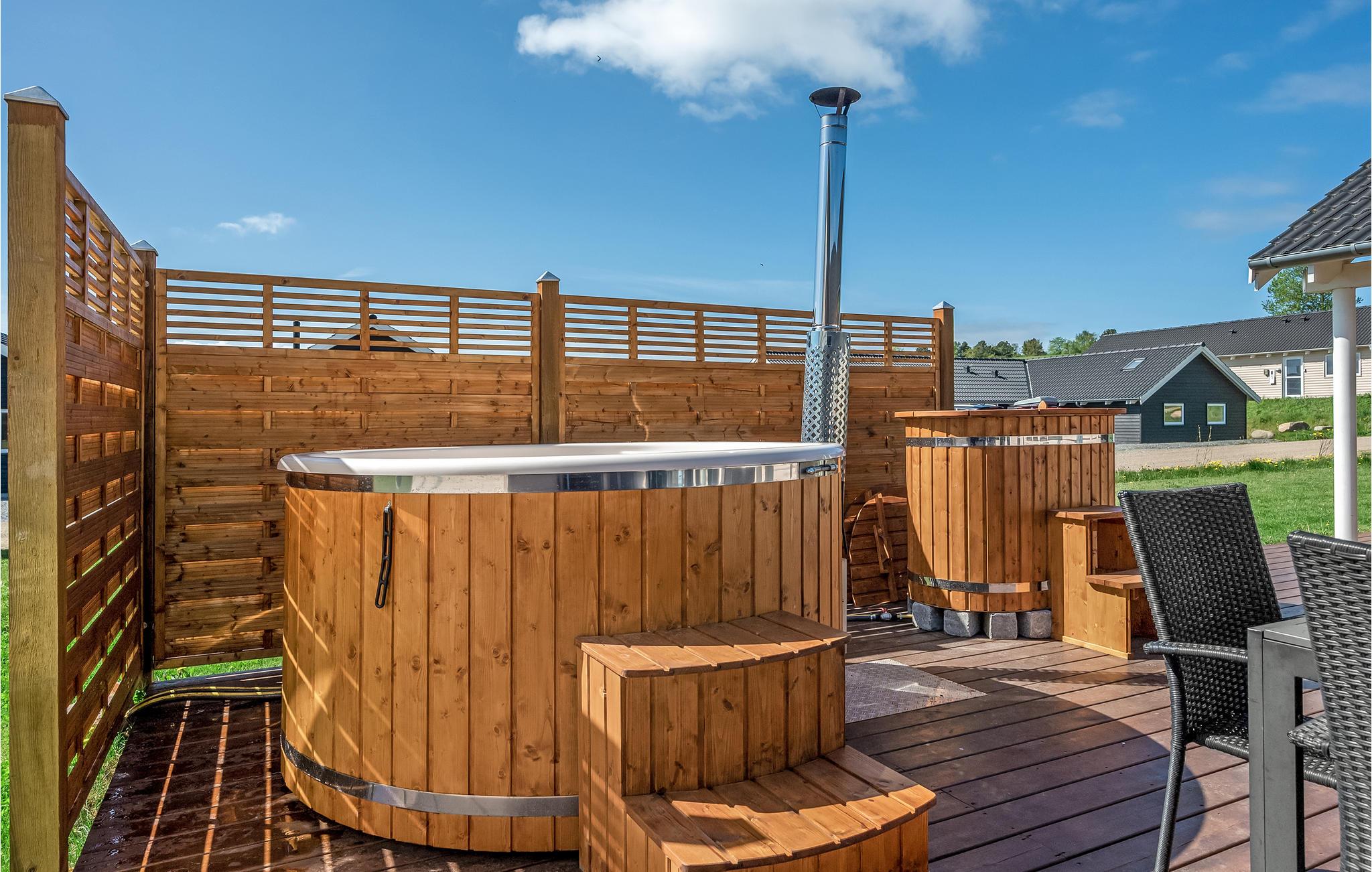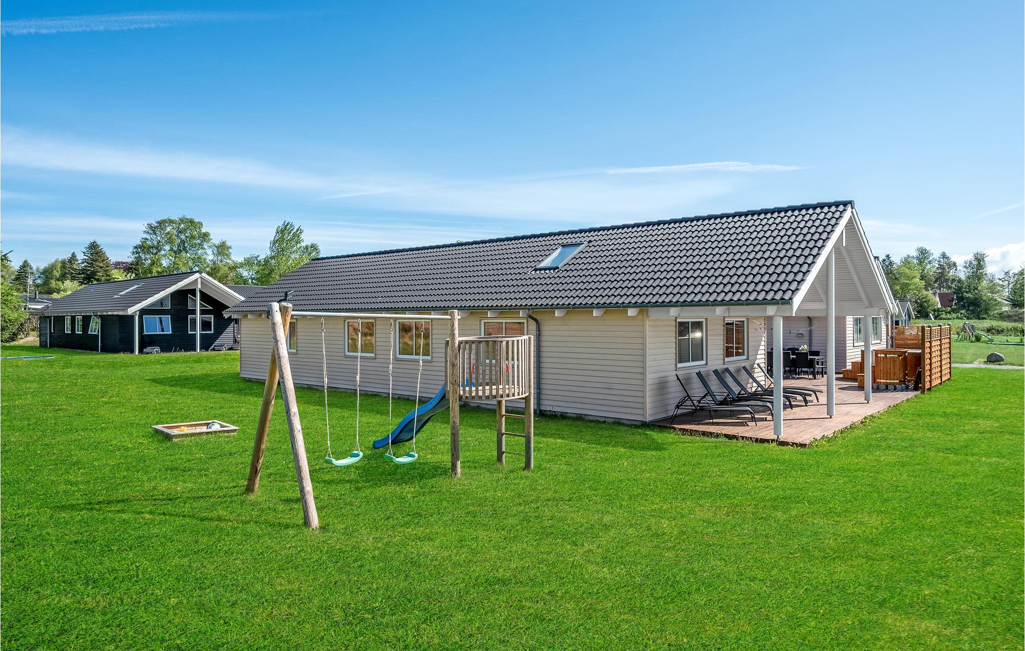 Udendørs byder naturgrunden også på mange muligheder for aktiviteter og leg. Her er gynger, legetårn med rutsjebane og sandkasse. Terrassen er veludstyret med lækre havemøbler og solsenge. Udenfor finder I også vildmarksbad og koldtvandskar, som inviterer til forfriskende afslapning i det fri.