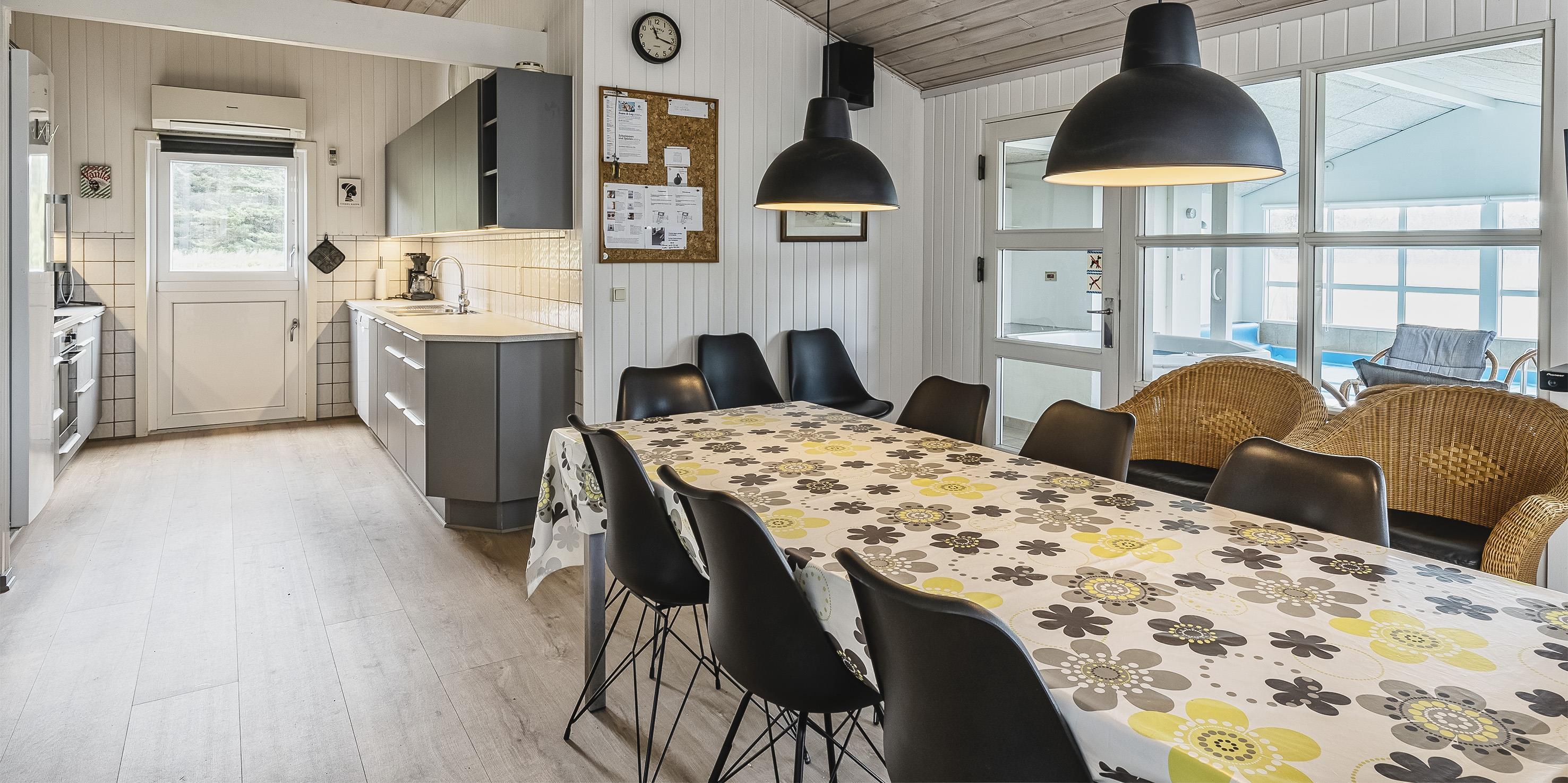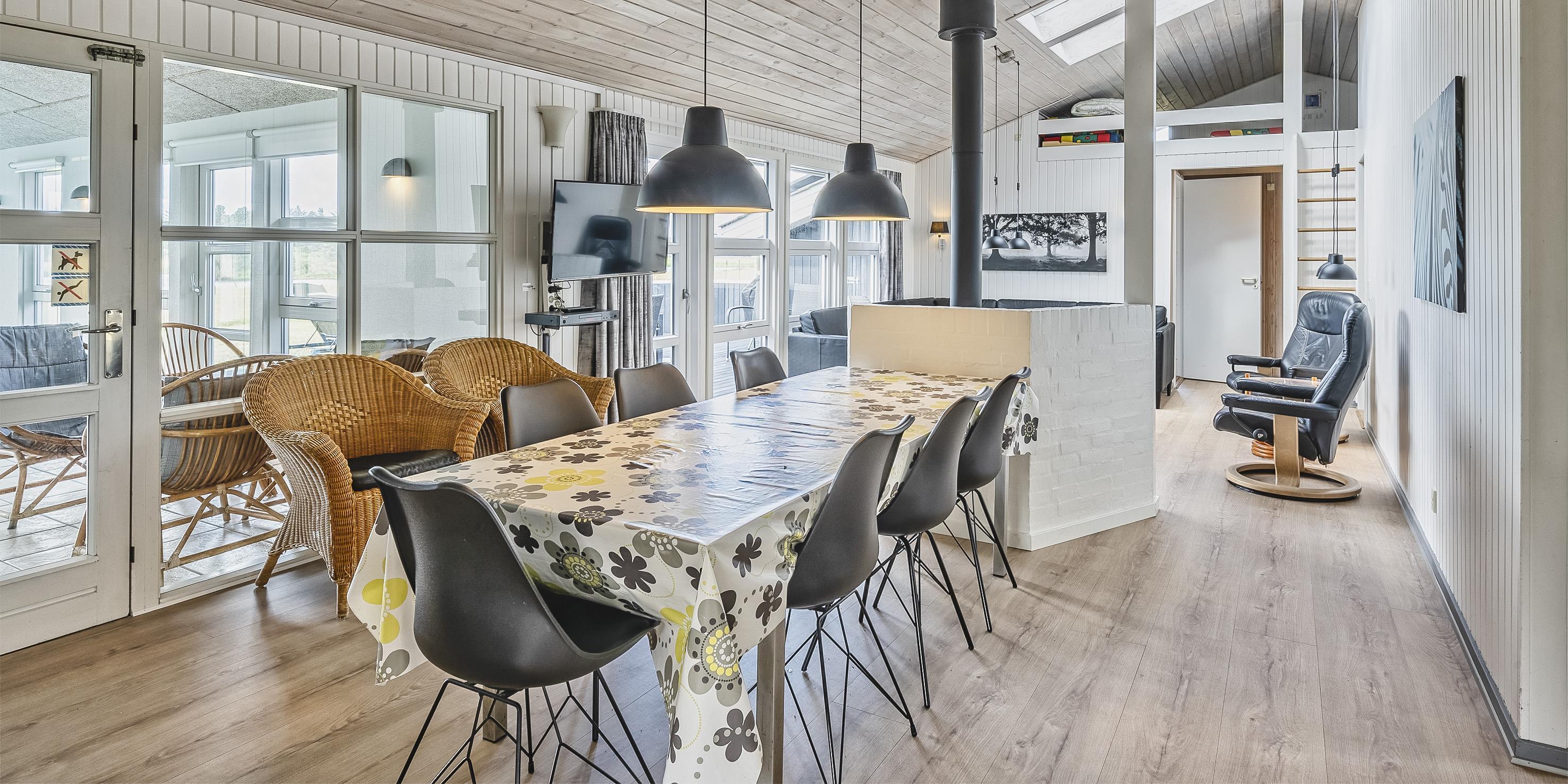 Huset indeholder: Indgangsparti med plads til garderoben og vaskesøjle med vaskemaskine og tørretumbler. Fra indgangspartiet er der adgang til et badeværelse med bruser, wc og vaskearrangement. Værelse med Day bed som kan benyttes til legerum, læsekrog, TV og med udsigt mod skov. Fra indgangspartiet kommer man ind til husets opholdsrum, med nyt åbent køkken med køleskab, indbygningsovn, induktionskogeplade, opvaskemaskine og mikroovn. Fra køkkenet er der udgang til østvendt terrasse hvor morgenmaden kan nydes til udsigt mod skovområdet. Den store opholdsstue er med loft til kip, stue fremstår med hjørnesofa med kig til brændeovn, drejbar fjernsyn (mod spisestue afdelingen og mod sofahjørnet), radio med bluetooth adgang, der er kan ses DR programmer, TV 2 i stuen chrome cast i den lille soveværelset og i stuen og udgang til sydvestvendt terrasse med en fantastisk udsigt til søen. Spisestueafdelingen er i åben forbindelse med køkkenet og med kig til poolrummet. Der er desuden fibernet internetadgang (200/200) og varmepumpe. Hems med 2 madrasser, opgang fra stuen. Der forefindes 4 soveværelser: DS + DS + DS + DS Alle topmadrasser er i fuld størrelse. Lille hjemmearbejdsplads med skrivebord og stol. Ydermere et badeværelse med bruser/wc og vask med underskabe. Dejlig poolafdeling med yderligere et gæstetoilet separat bruser og sauna. Standvandsspa med plads til 6 personer samt et ca. 5, x 4 x 1,1 meter ( L X B X D) stort bassin. Lavere energiforbrug grundet varmeveksler.