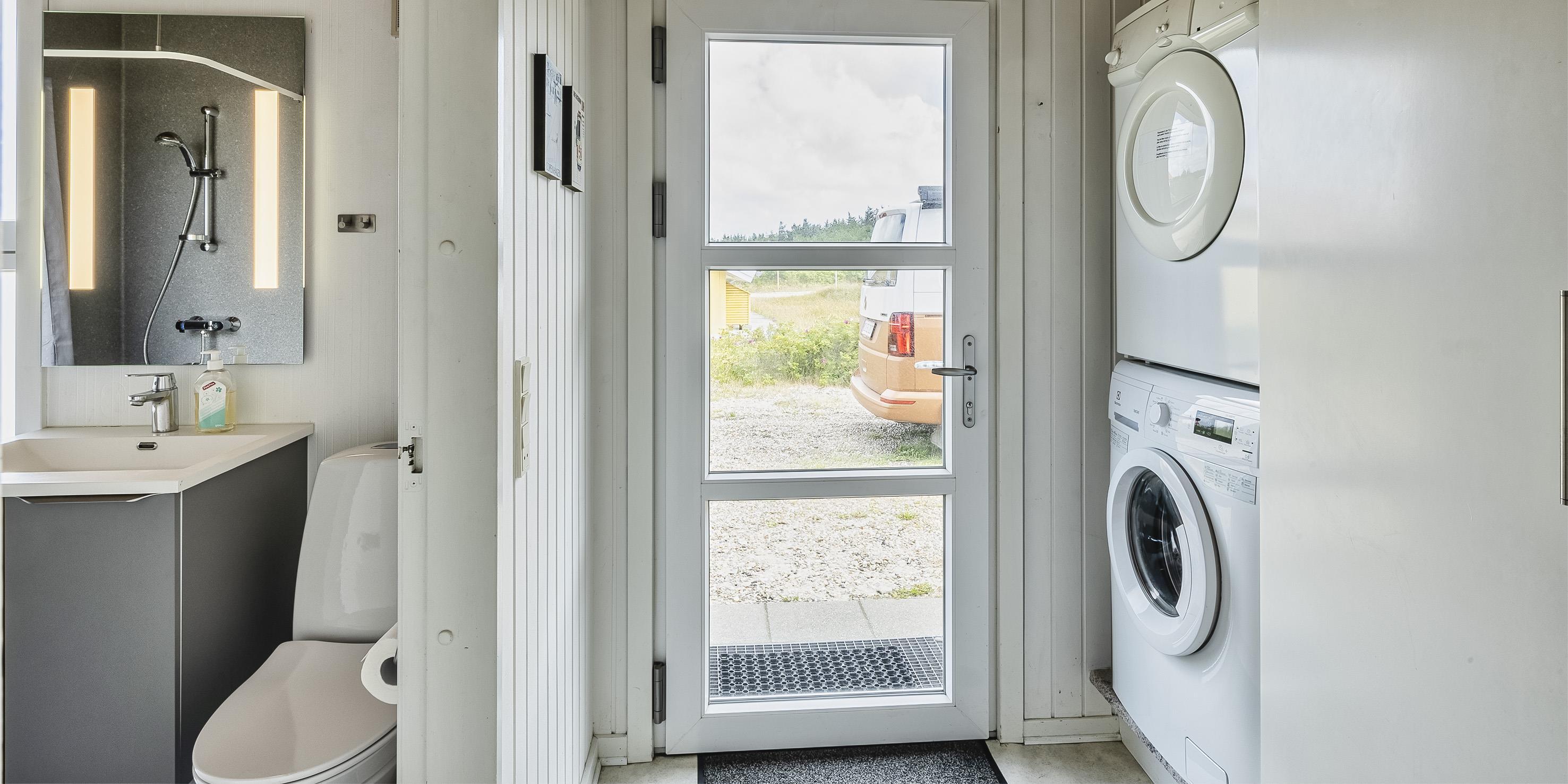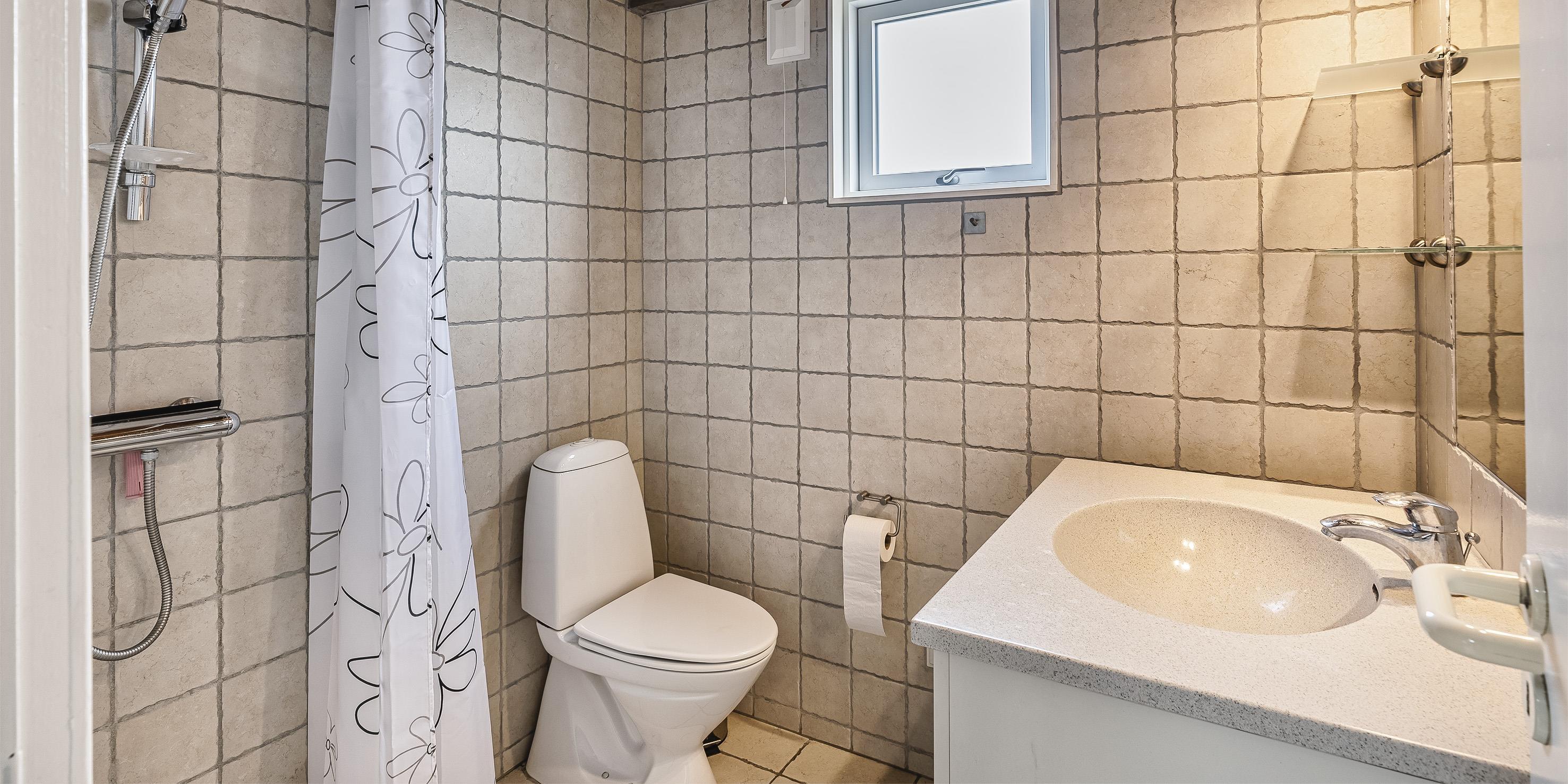 Bad med toilet, bruser og vask