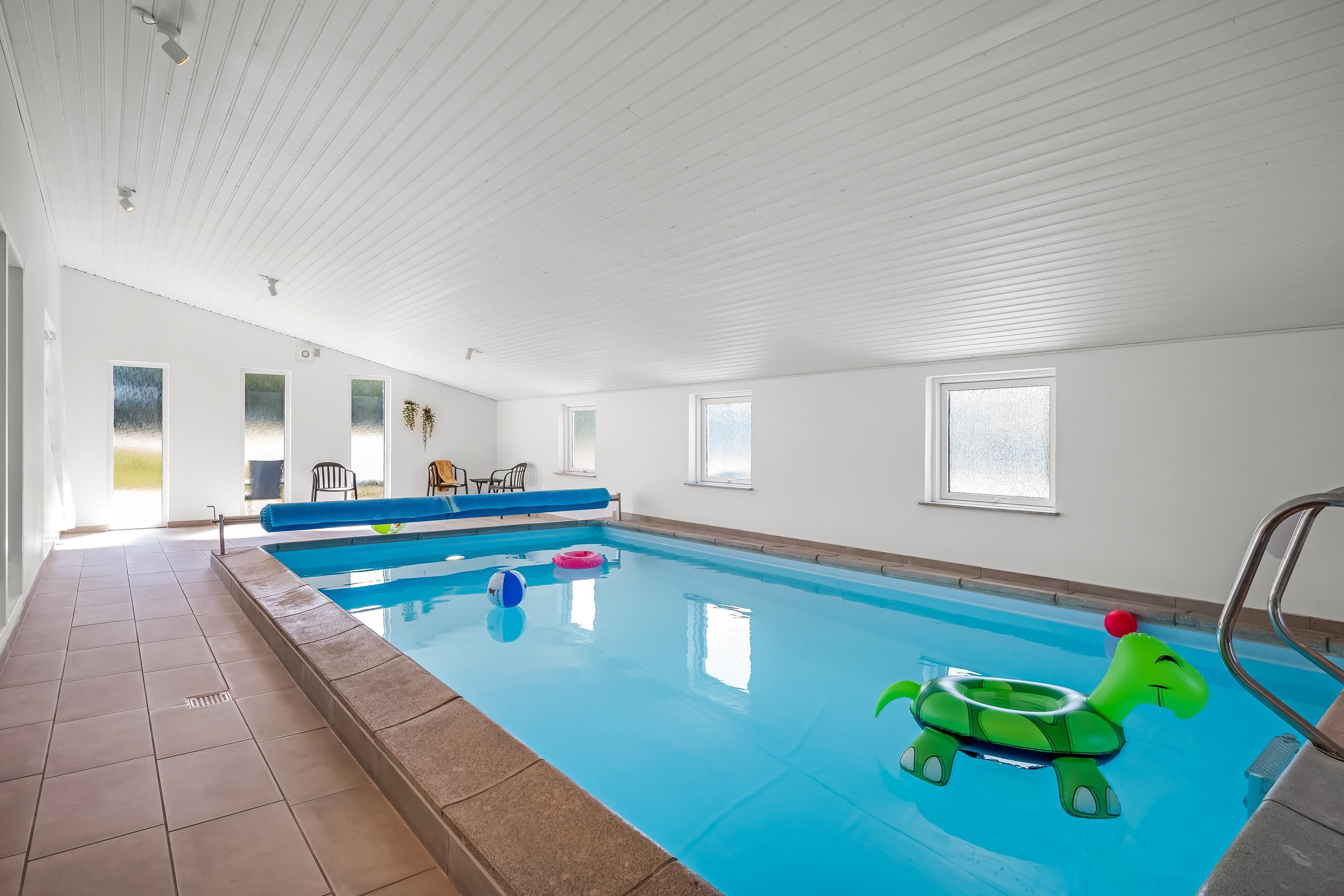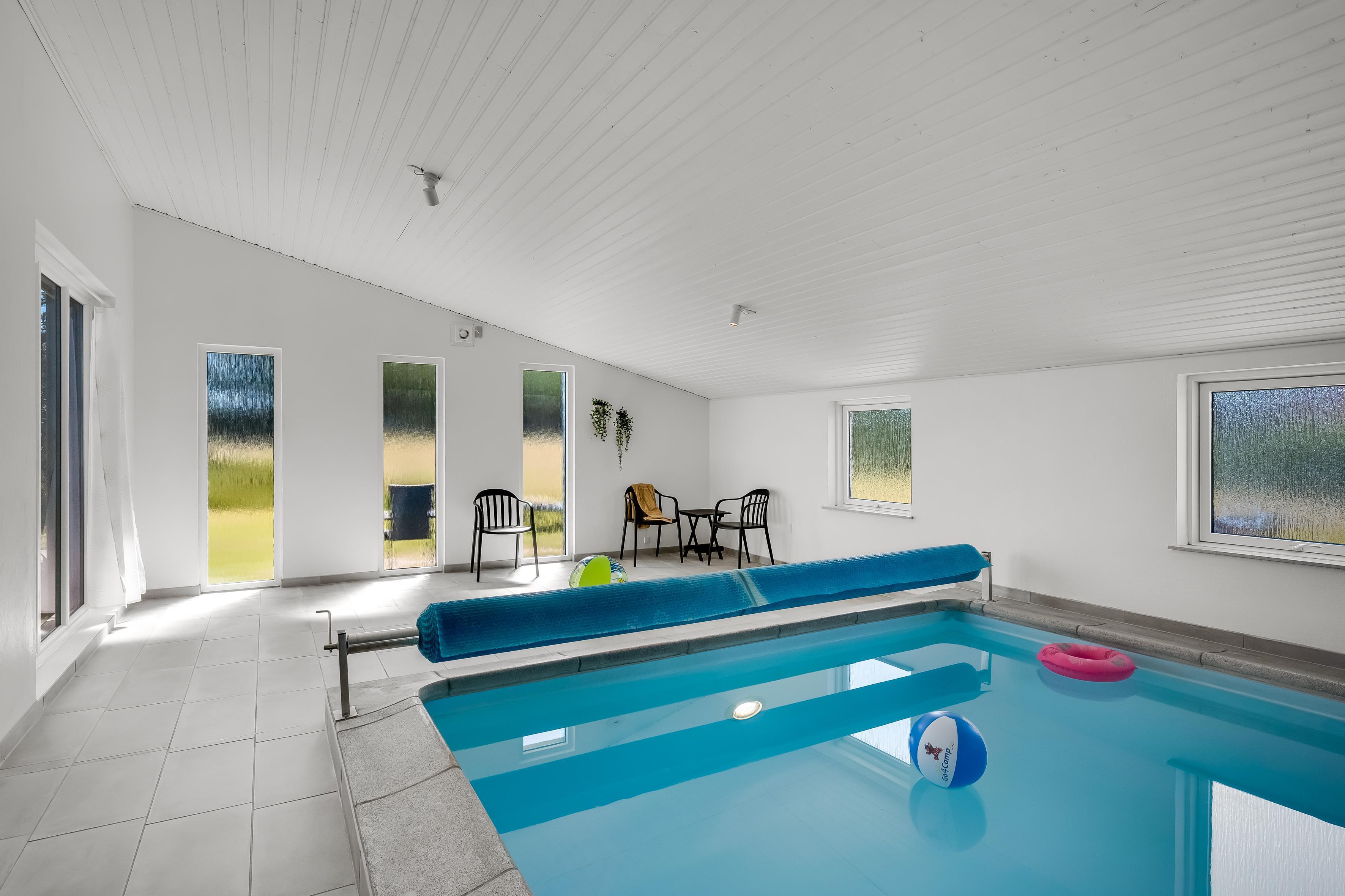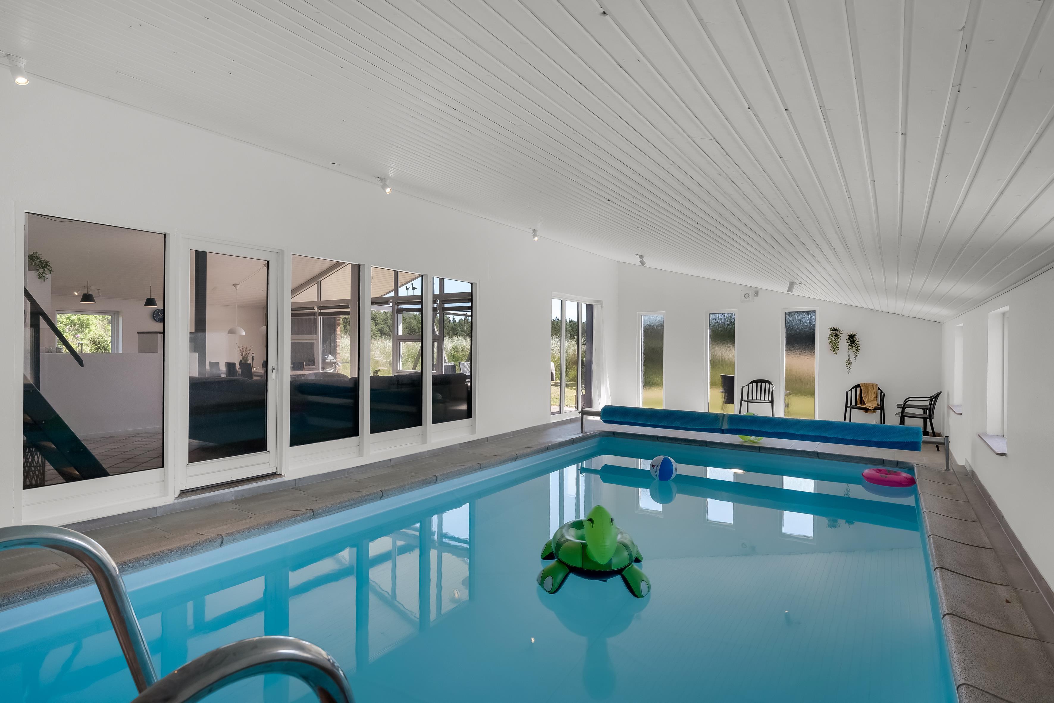 Huset indeholder: Indgang/fordelingsgang med garderobe der ligger i åben forbindelse med opholdsrummet. Det store opholdsrum er med loft til kip og med et stort vinduesparti mod øst. Stuen er med en hjørnesofa, hvorfra udsigten over mod skov kan nydes fra det store vinduesparti. Stuen har Smart TV med parabolantenne og DR-programmer, trådløs internet (100/100), varmepumpe, brændeovn samt en hems, og er et godt opholdsrum for børnene for uforstyrret leg og hygge. Nyt køkken i åben forbindelse med stuen. Køkkenet har køleskab, indbygningsovn, induktionskogeplade, emhætte 80 L skabsfryse. I forbindelse med køkkenet, er der en åben spiseplads med kig til skoven, fra det store vinduesparti og udgang til den delvis overdækkede terrasse. Fra stuen er der adgang til det store poolrum, poolen er ca. 6,5 x 3,5 x 1,3 (længde x brede x dybde), der er et hjørnespa og flere hyggekroge med kurvemøbler, samt badeværelse med bruser/wc, vaskearrangement og sauna. Hele herligheden kan nydes fra stuen igennem det store vinduesparti. 5 soveværelser: DS + DS + 2S + 2S + 2S. Fra fordelingsgangen forefindes 4 gode soveværelser, 2 soveværelser med hver en dobbeltseng og garderobeskabe, samt 2 soveværelser med hver 2 enkeltsenge. Ydermere er der 2 enkeltsenge på hemsen, hvorfra der adgang via en trappe fra stuen. Badeværelse med bruser/wc og vaskearrangement samt vaskemaskine og tørretumbler. 2 terrasse med gode havemøbler, grill, og et gyngestativ. Grunden er udlagt i græs som giver rig mulighed for boldspil, kroket m.m. Husdyr og rygning er ikke tilladt. Ladestation til El biler, stick Type 2. Byggeår 1989. Renoveret 2020. Der afregnes ekstra for vand.