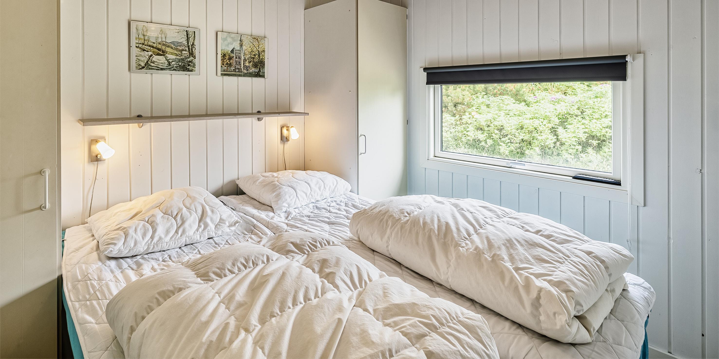 3 soveværelser. 1 med dobbeltseng 180x200 cm. 2 med 2 enkeltsenge (á 90x200 cm).
