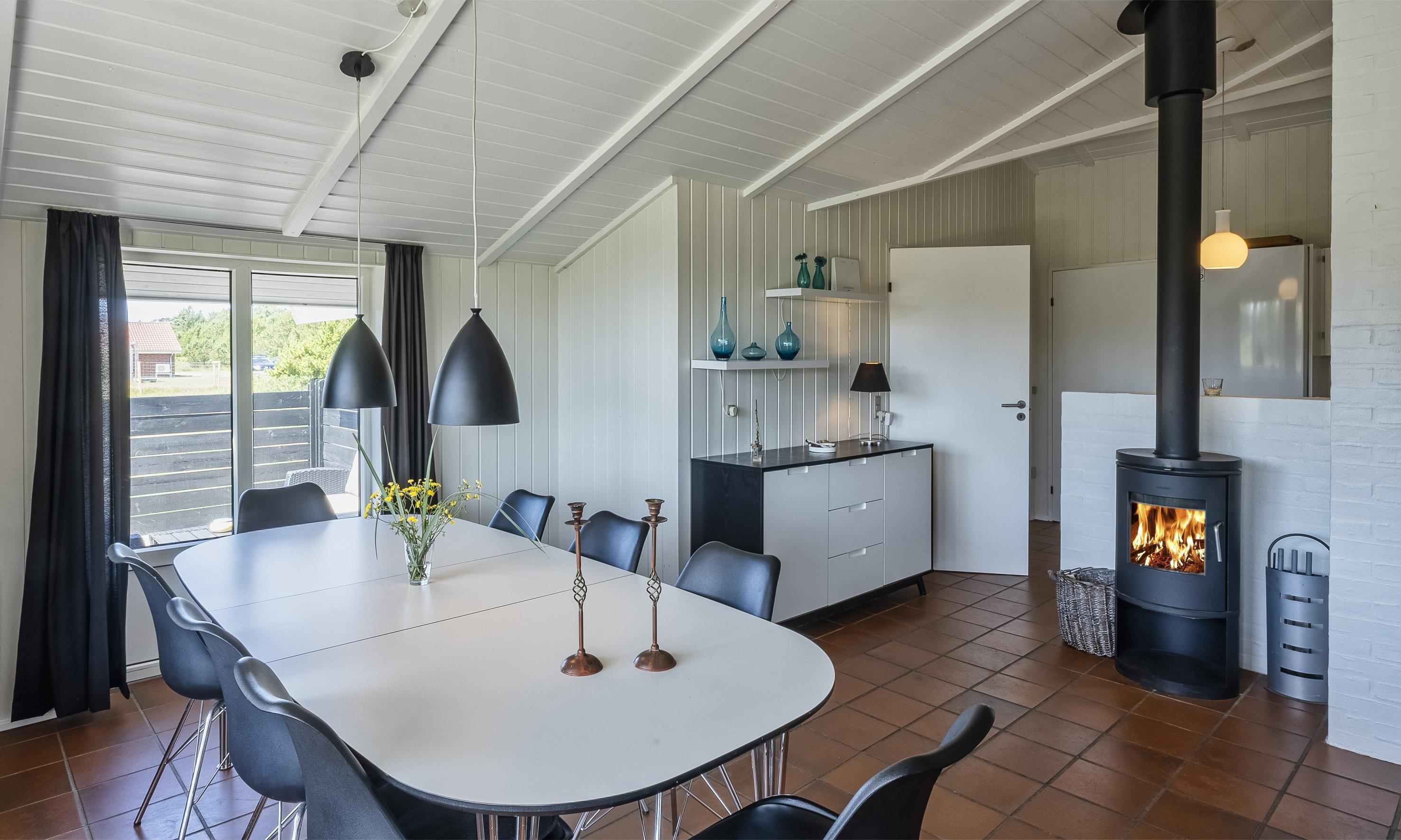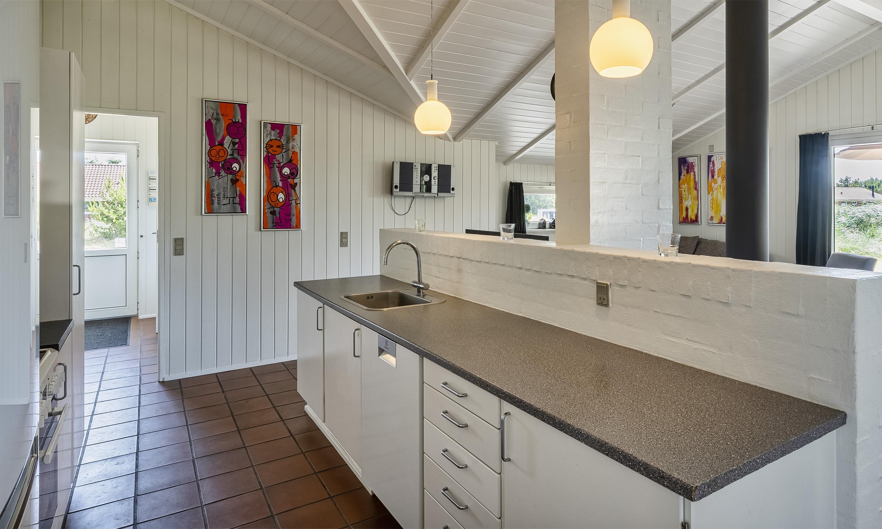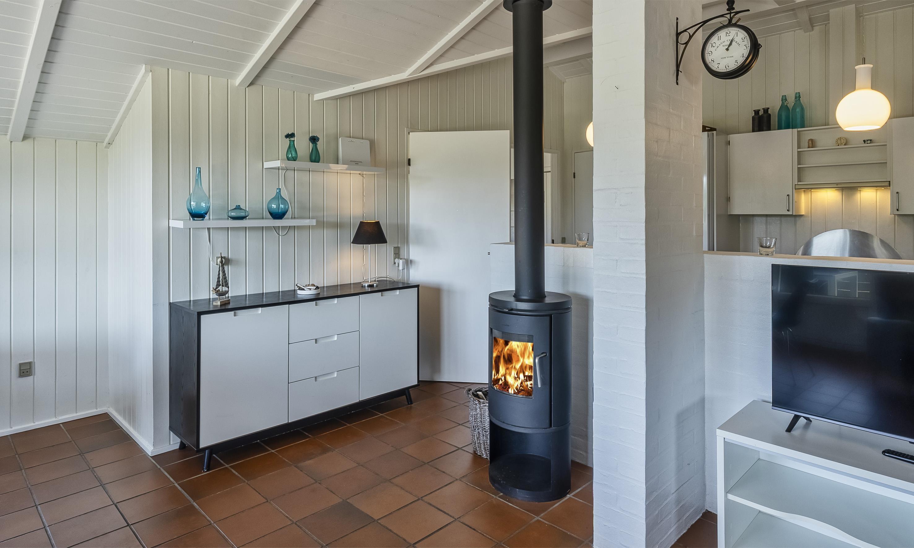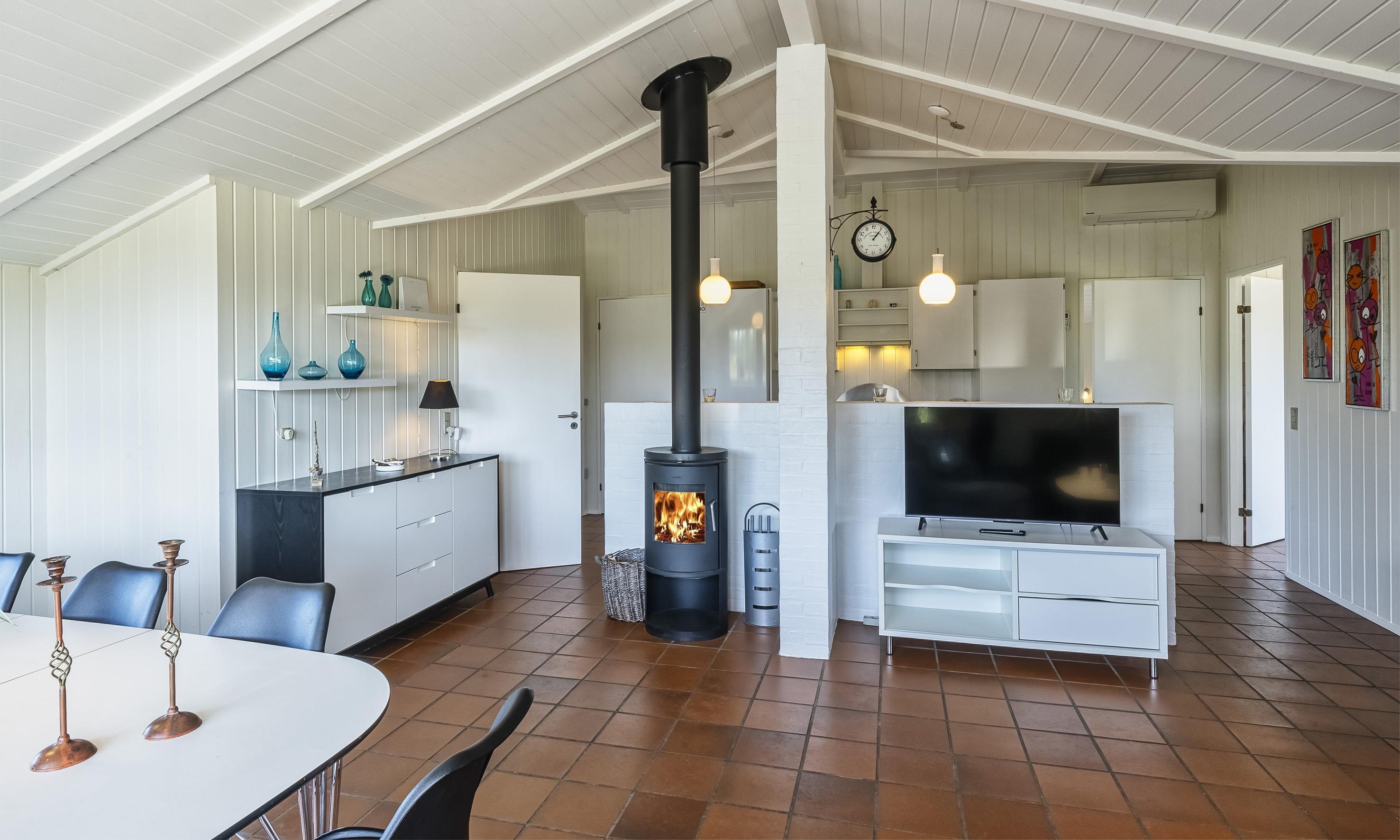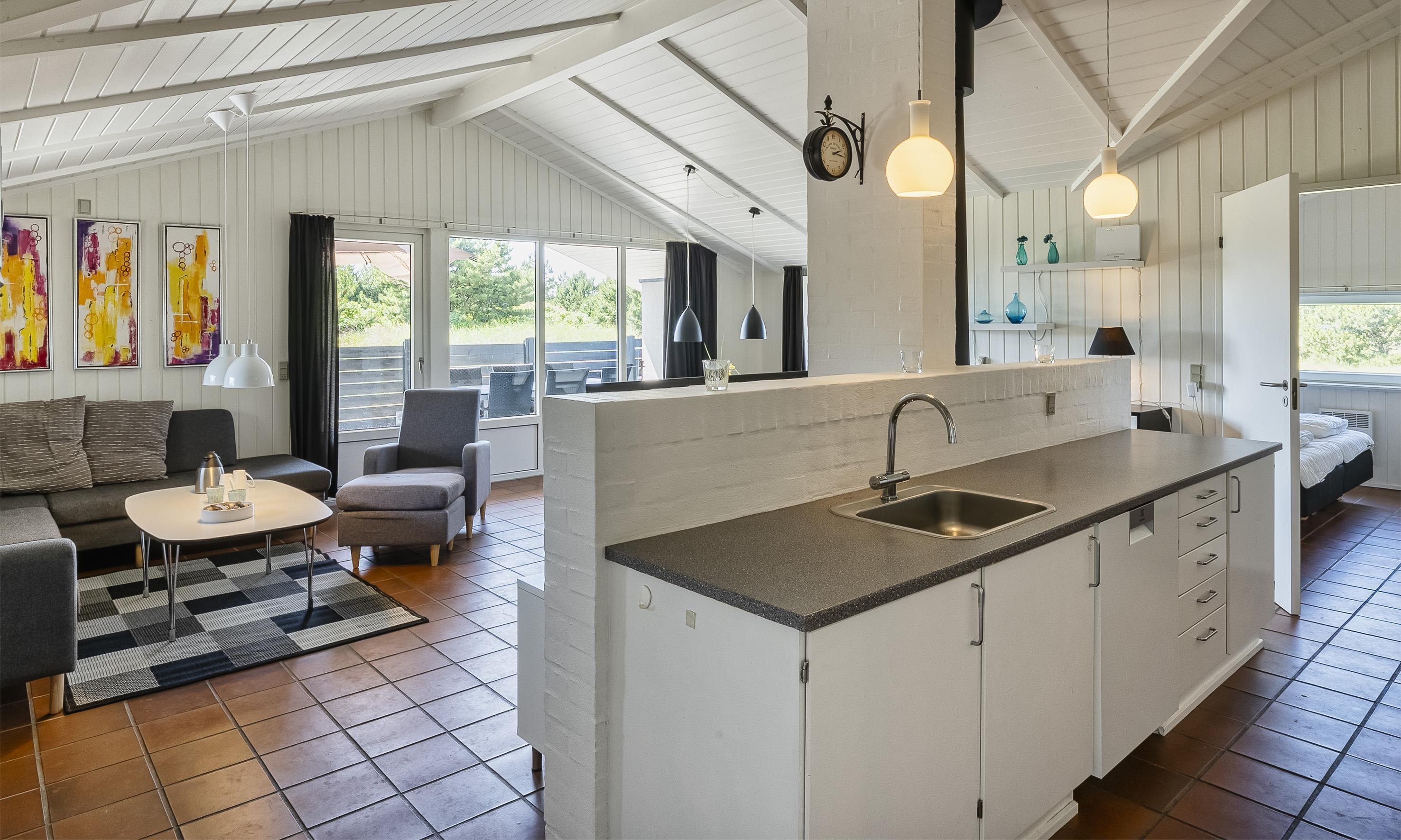 Indendørs venter et lyst og indbydende feriehus, hvor det centrale opholdsrum udgøres af det åbne køkkenalrum med stue. Her er loft til kip, store vinduer med flot lysindfald og klinkegulv. Fra stuen er der direkte udgang til en delvist overdækket og læfuld terrasse – perfekt til både solrige dage og hyggelige aftener under åben himmel.