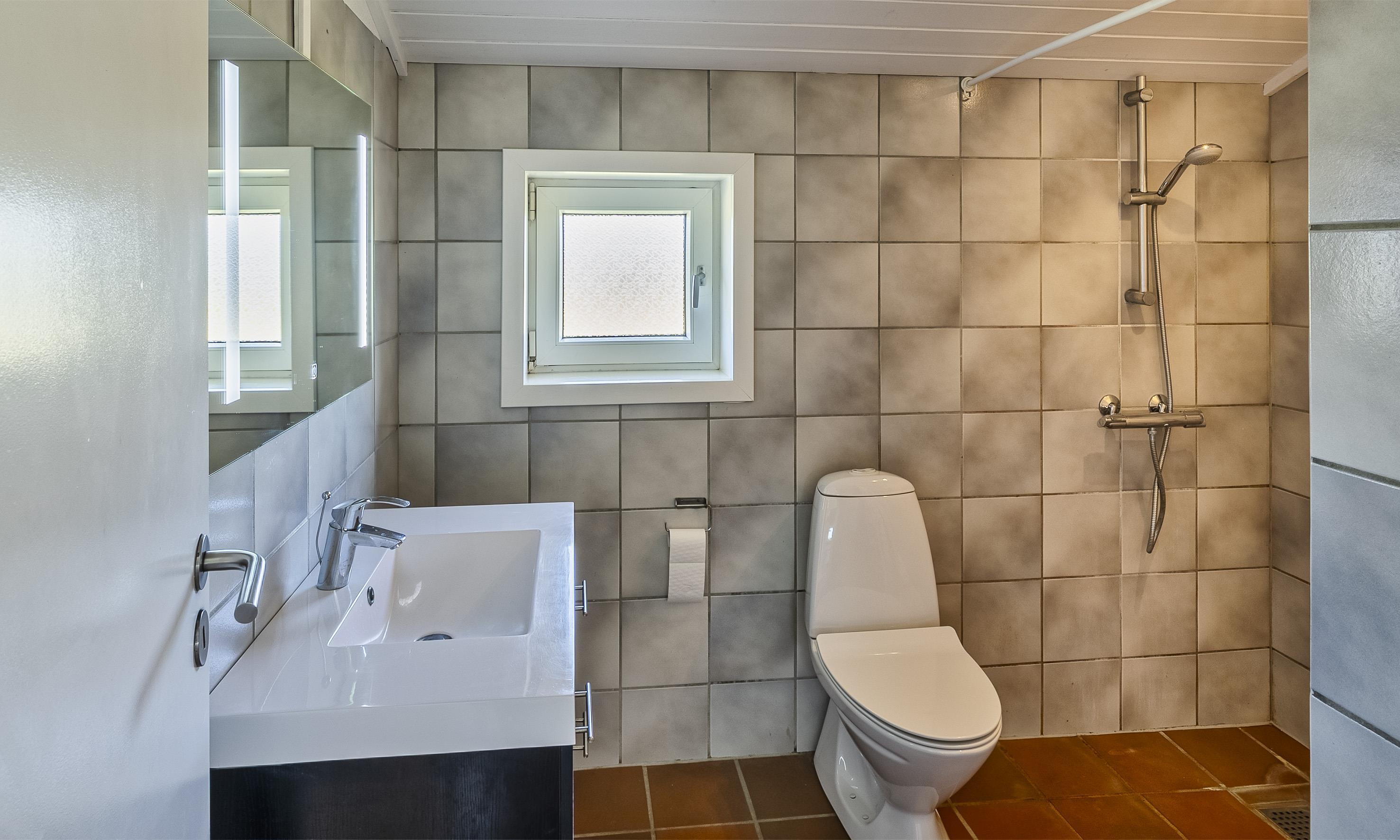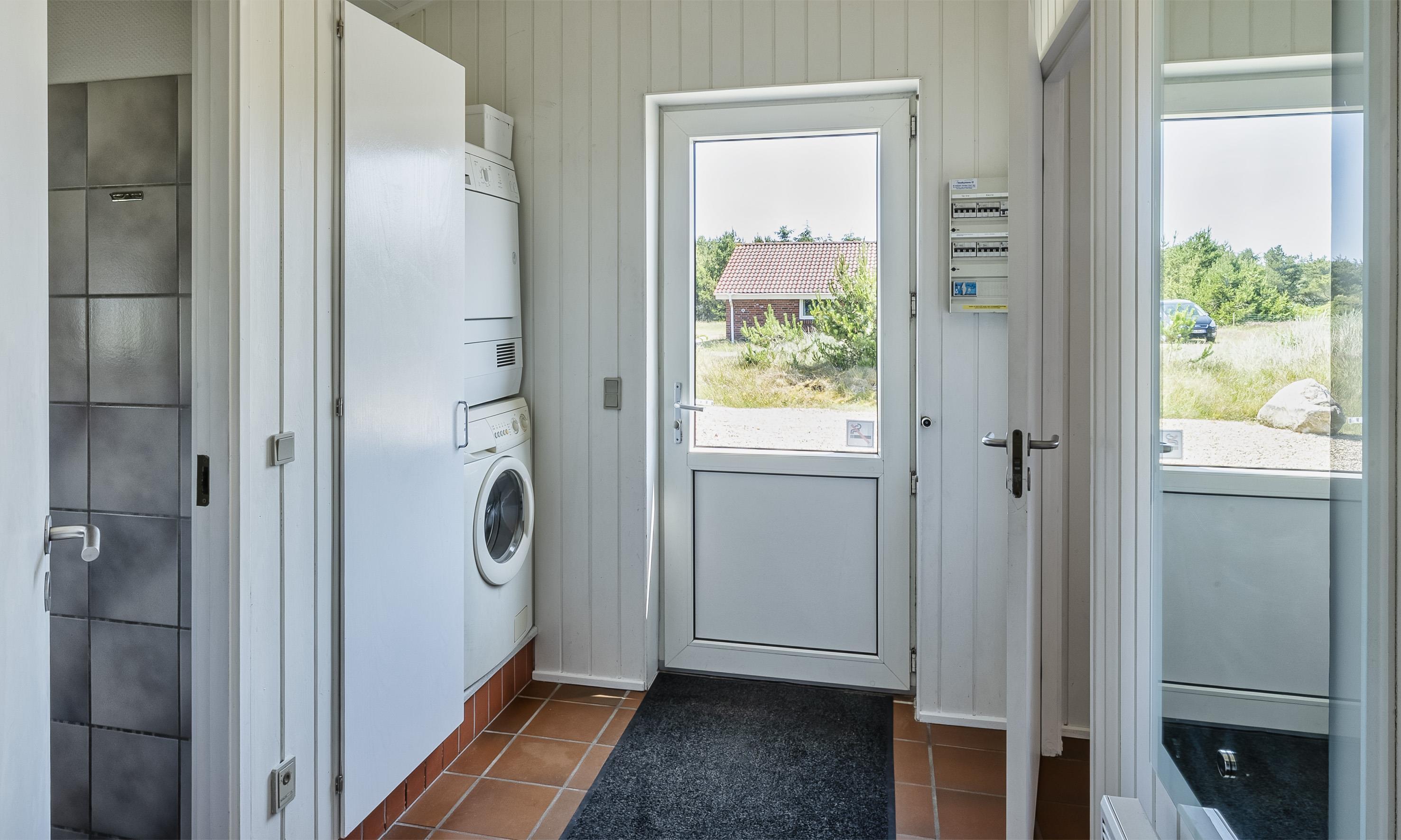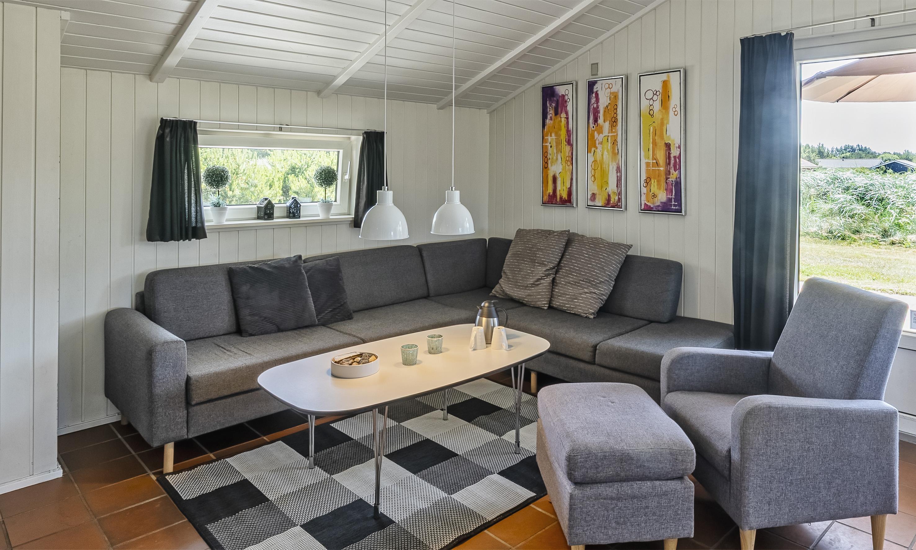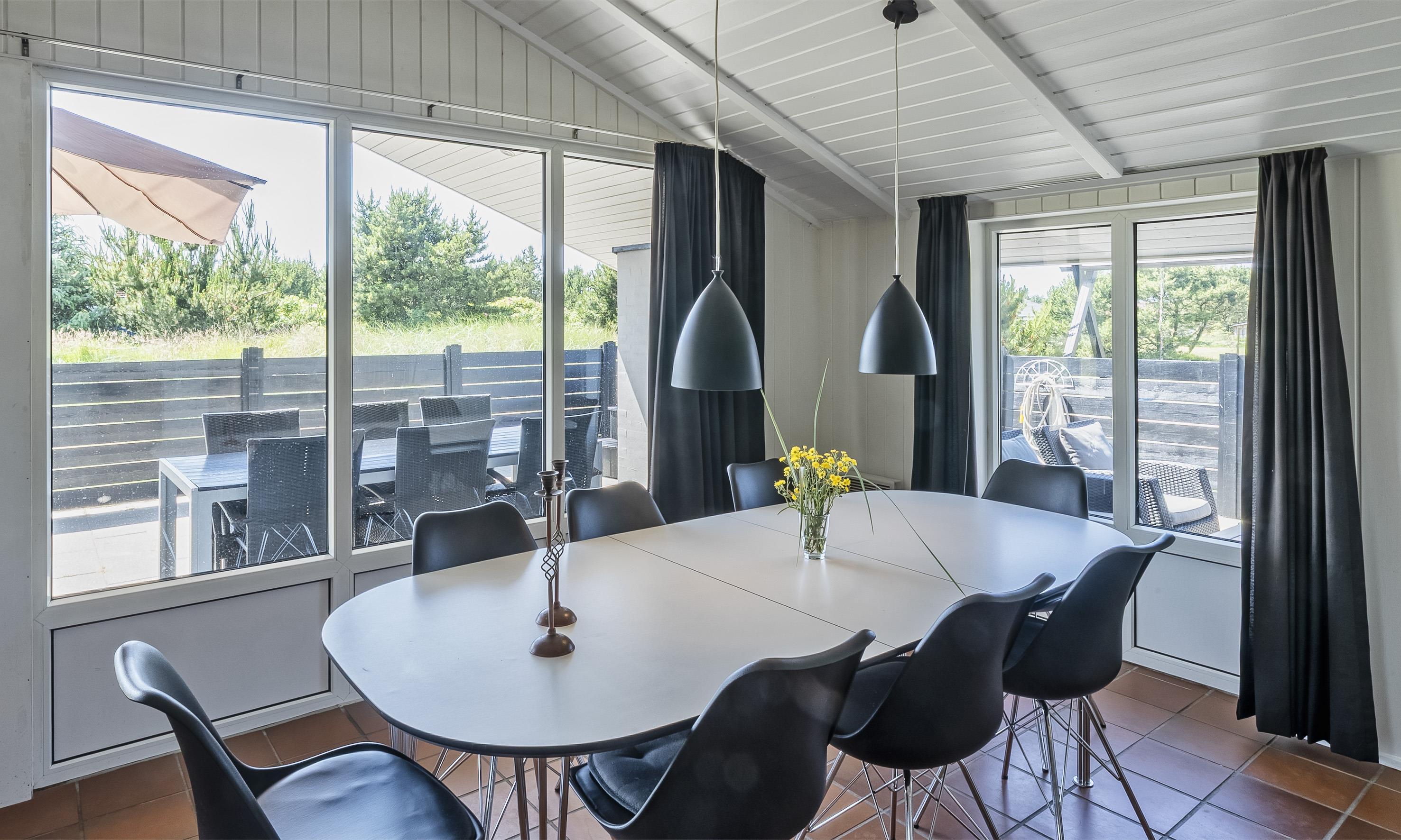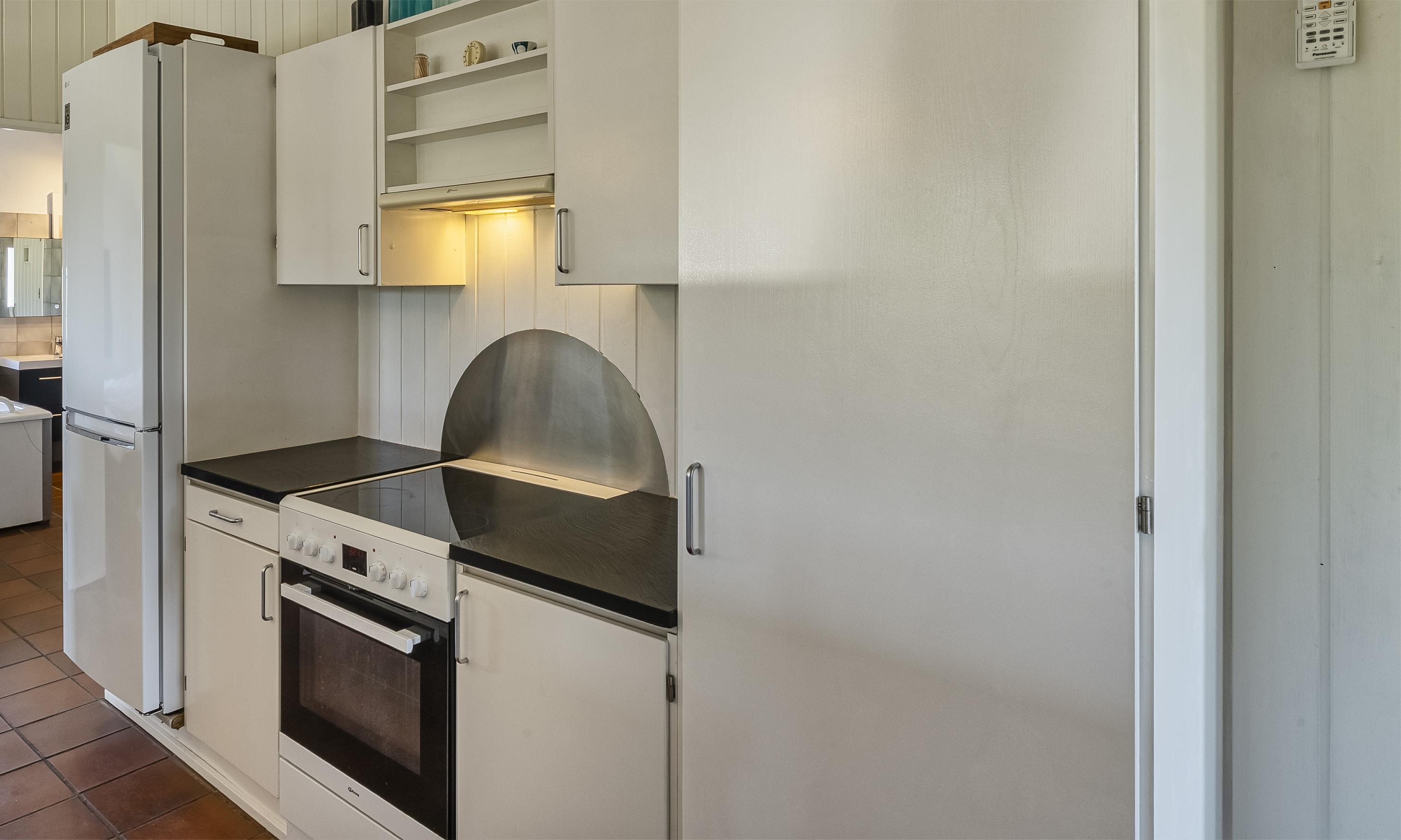 Indendørs venter et lyst og indbydende feriehus, hvor det centrale opholdsrum udgøres af det åbne køkkenalrum med stue. Her er loft til kip, store vinduer med flot lysindfald og klinkegulv. Fra stuen er der direkte udgang til en delvist overdækket og læfuld terrasse – perfekt til både solrige dage og hyggelige aftener under åben himmel.