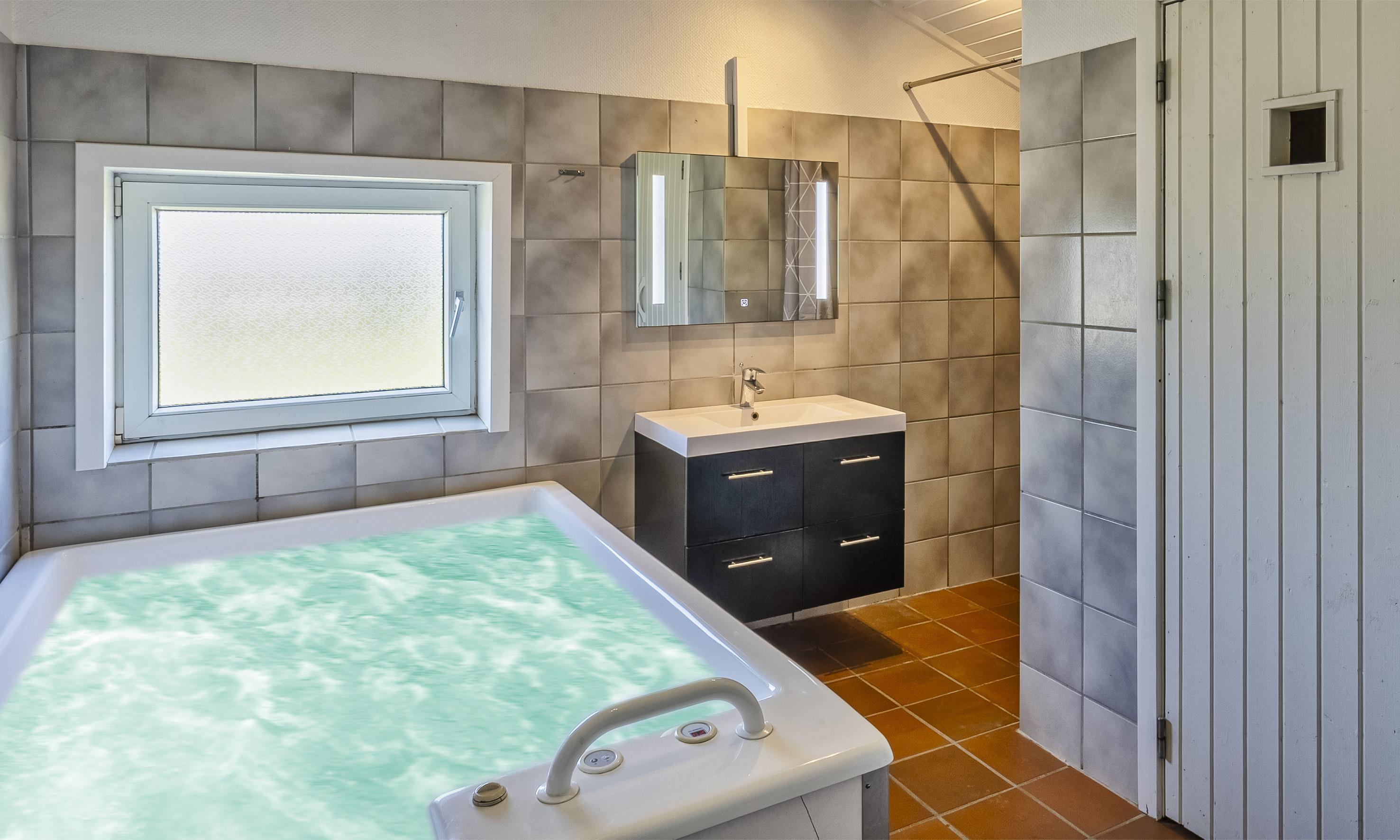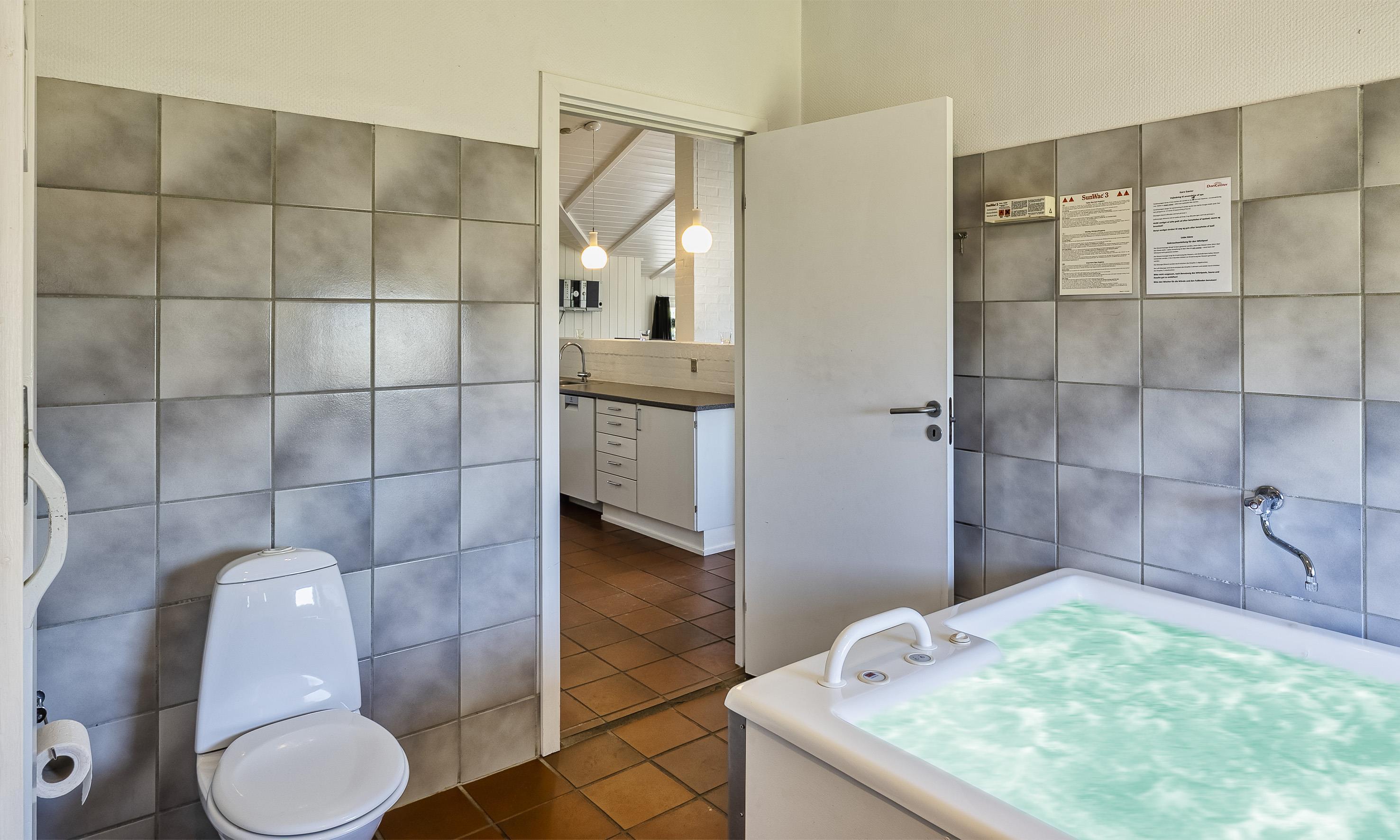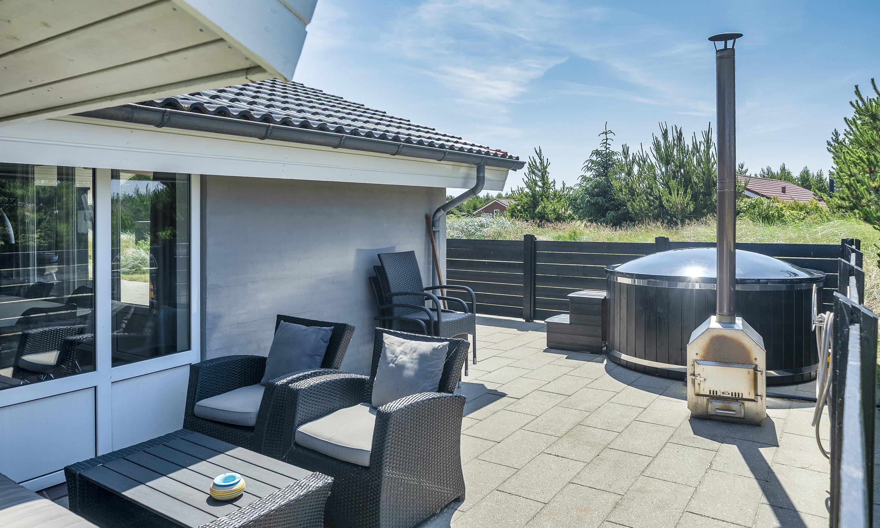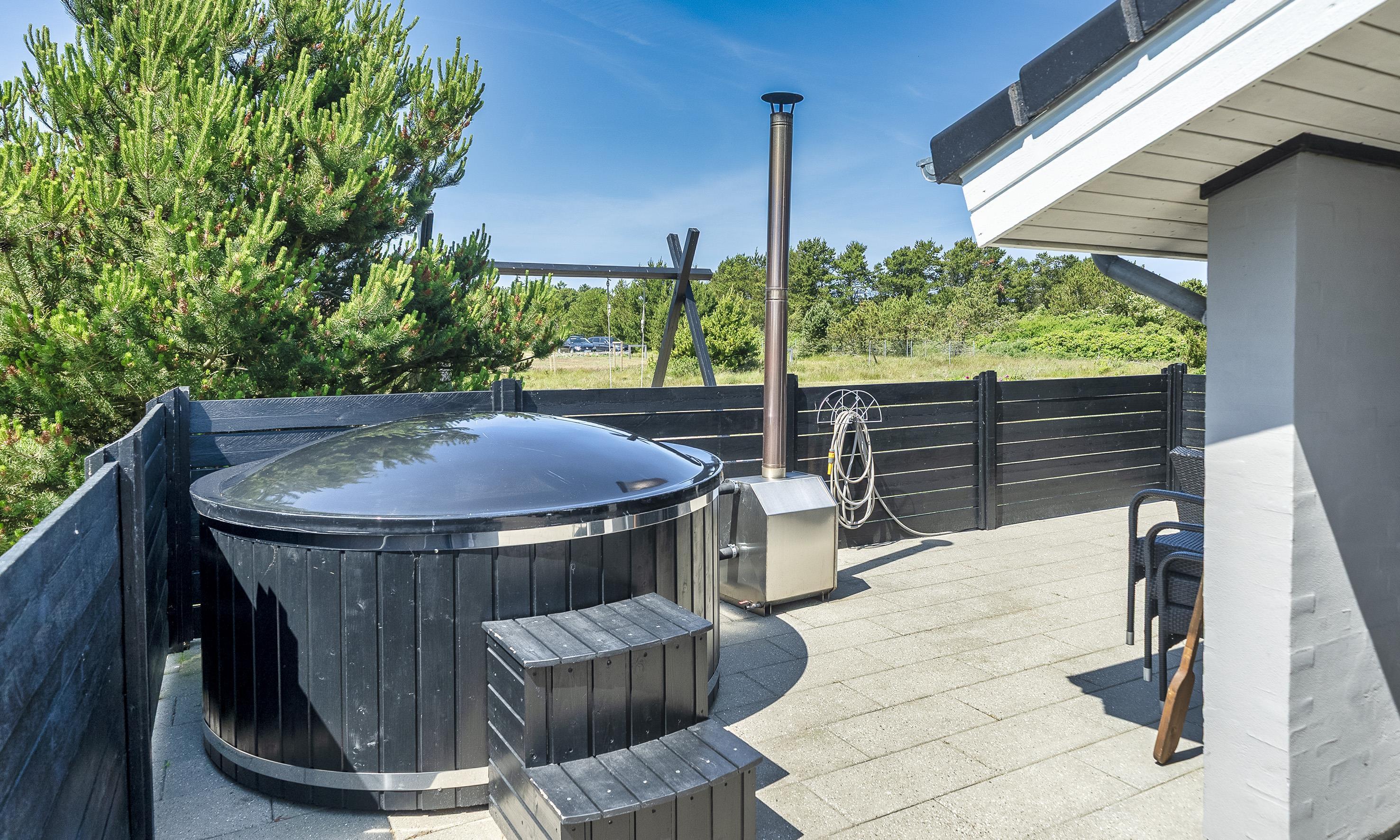 Udenfor finder I et skønt, afskærmet terrasseområde med adgang til et lækkert vildmarksbad, hvor dagens oplevelser kan nydes i varmt vand og under stjernerne. Den store græsplæne giver rig mulighed for leg og boldspil, og til de mindste er der gynge og sandkasse.