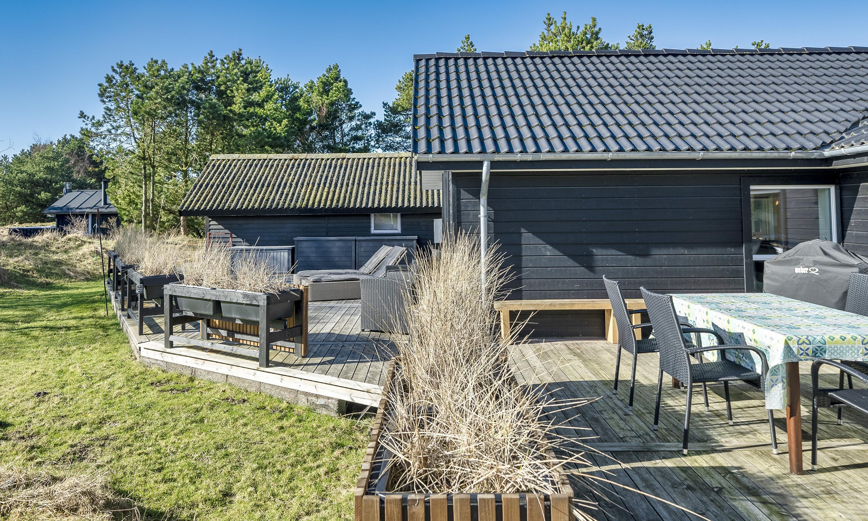 Dette charmerende og velindrettede sommerhus med et stort og læfuldt terrasseområde, er beliggende på en dejlig naturgrund i roligt og ugenert område, ca. 1500 meter fra Vesterhavet og Vejers Strand.