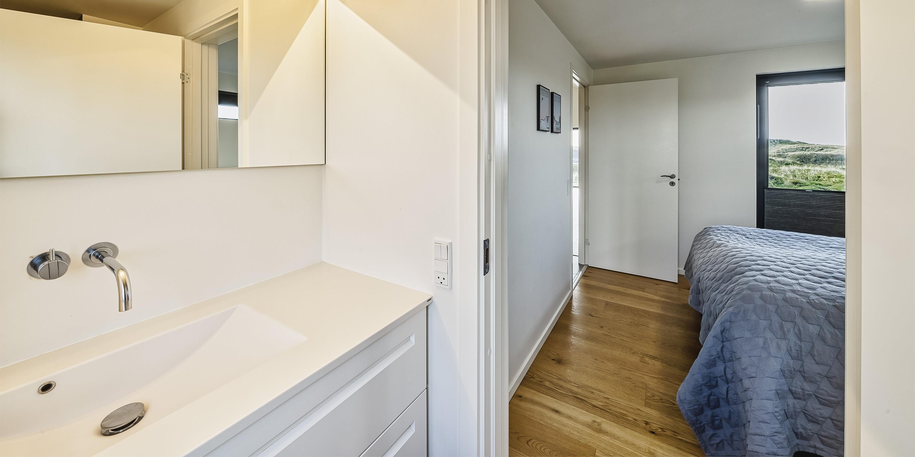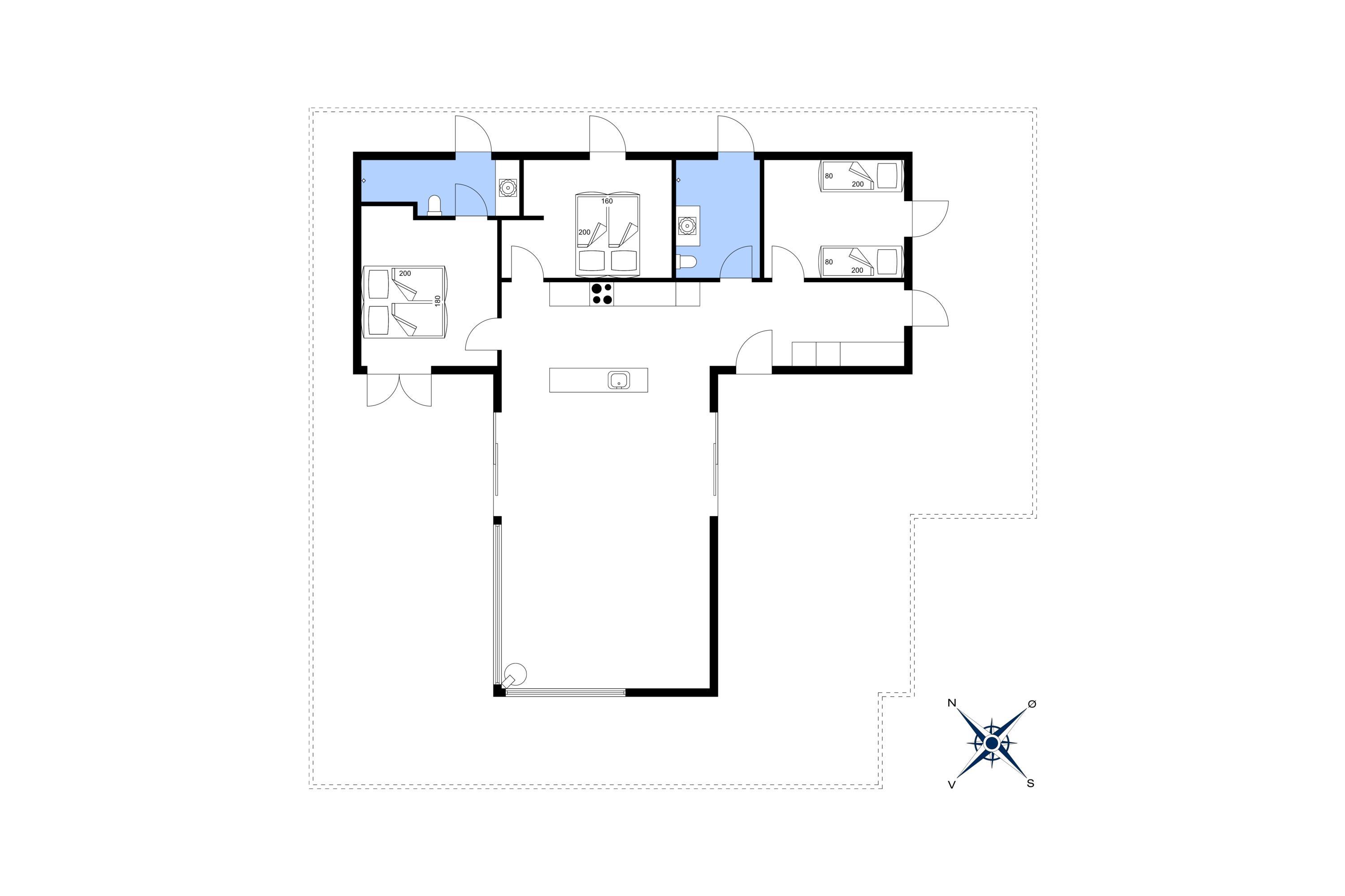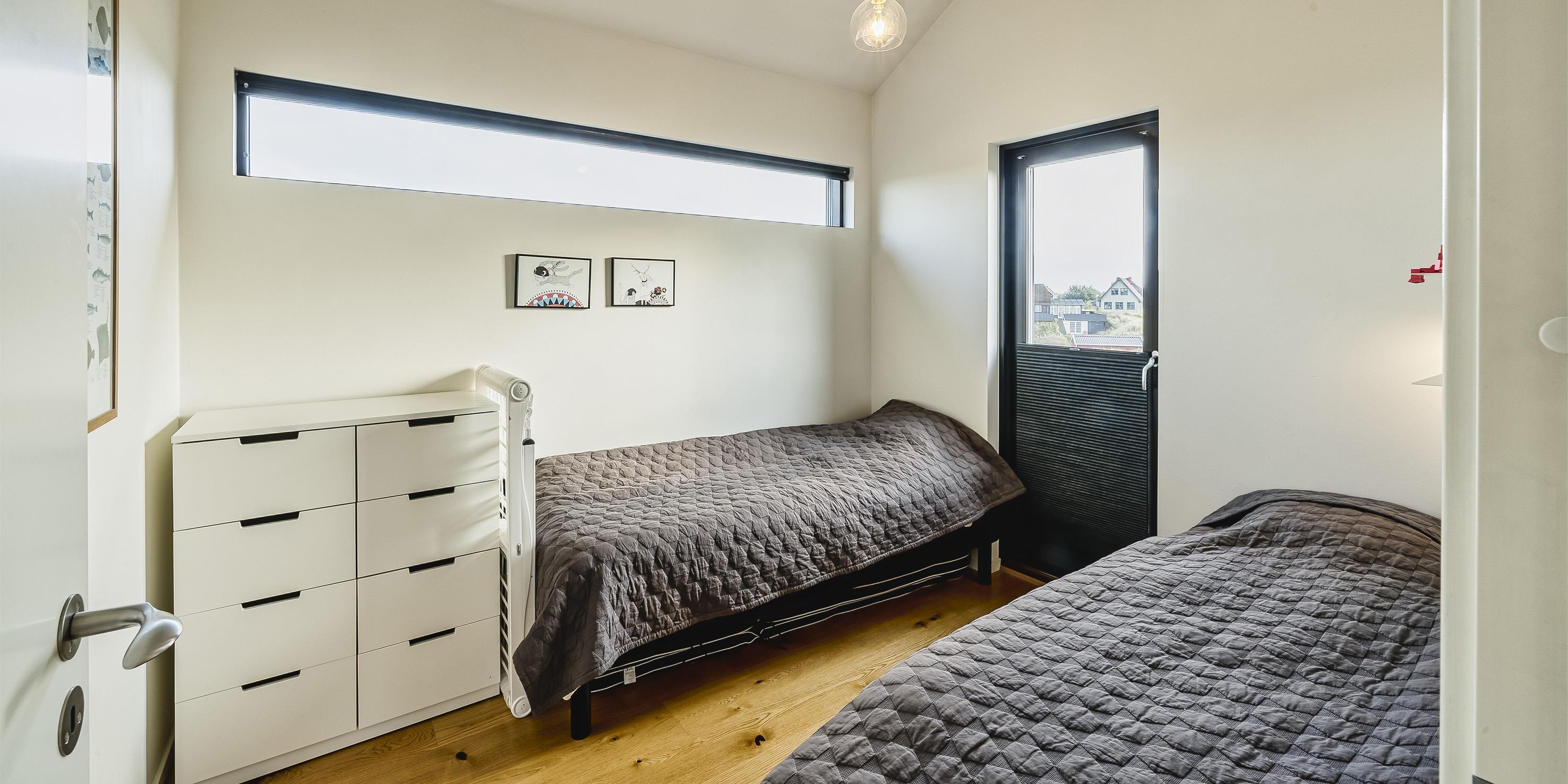 3 soveværelser. 2 med dobbeltseng 180x200 cm. 1 med 2 enkeltsenge (á 90x200 cm)