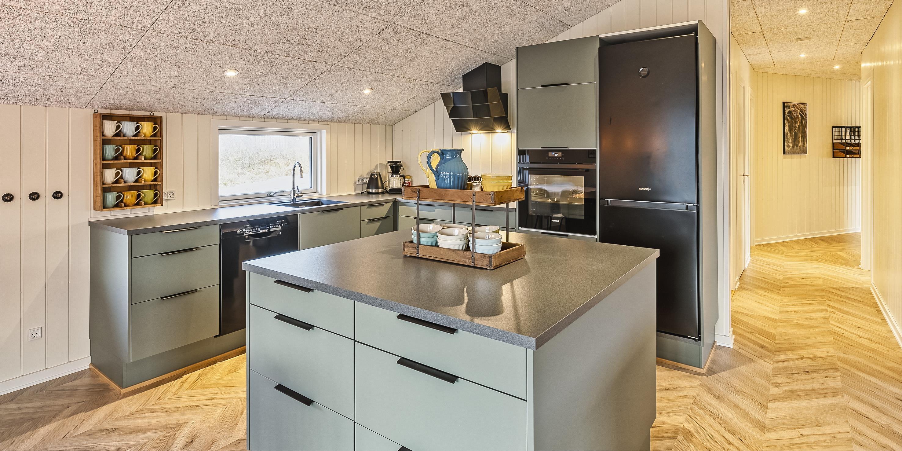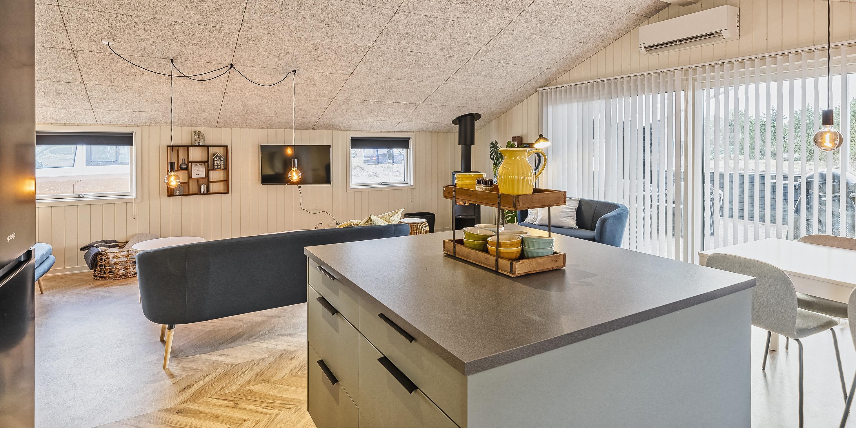 I indgangsområdet af huset er der rigelig plads til garderobe og sko samt en vaskemaskine og en tørretumbler. Med en samlet størrelse på 166 m² tilbyder feriehuset masser af plads og komfort. Opholdsstuen er forbundet med spisepladsen og det moderne køkken og skaber med de store vinduer en særlig venlig og hyggelig atmosfære. En brændeovn sørger for ekstra varme og hygge. En af de to energibesparende varmepumper er også placeret i stuen og hjælper med at reducere strømomkostningerne.