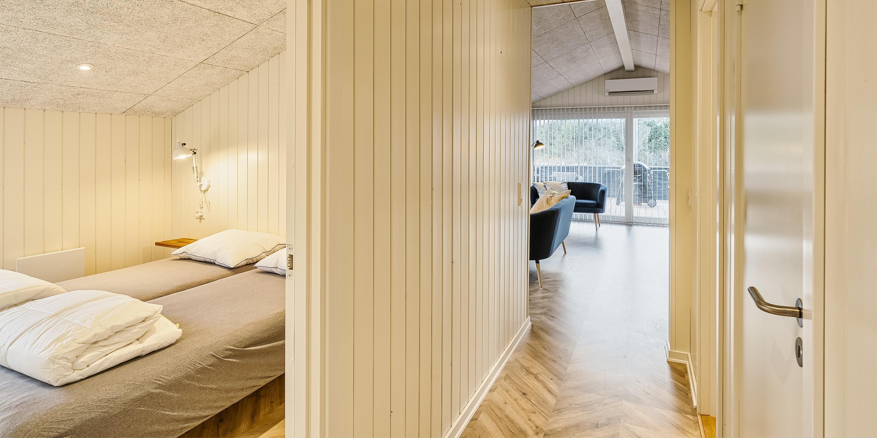 Huset har to moderne badeværelser, begge med gulvvarme, toilet, håndvask og bruser. I det ene badeværelse er der desuden en sauna. Der er i alt fire soveværelser, alle med dobbeltsenge (180 cm).