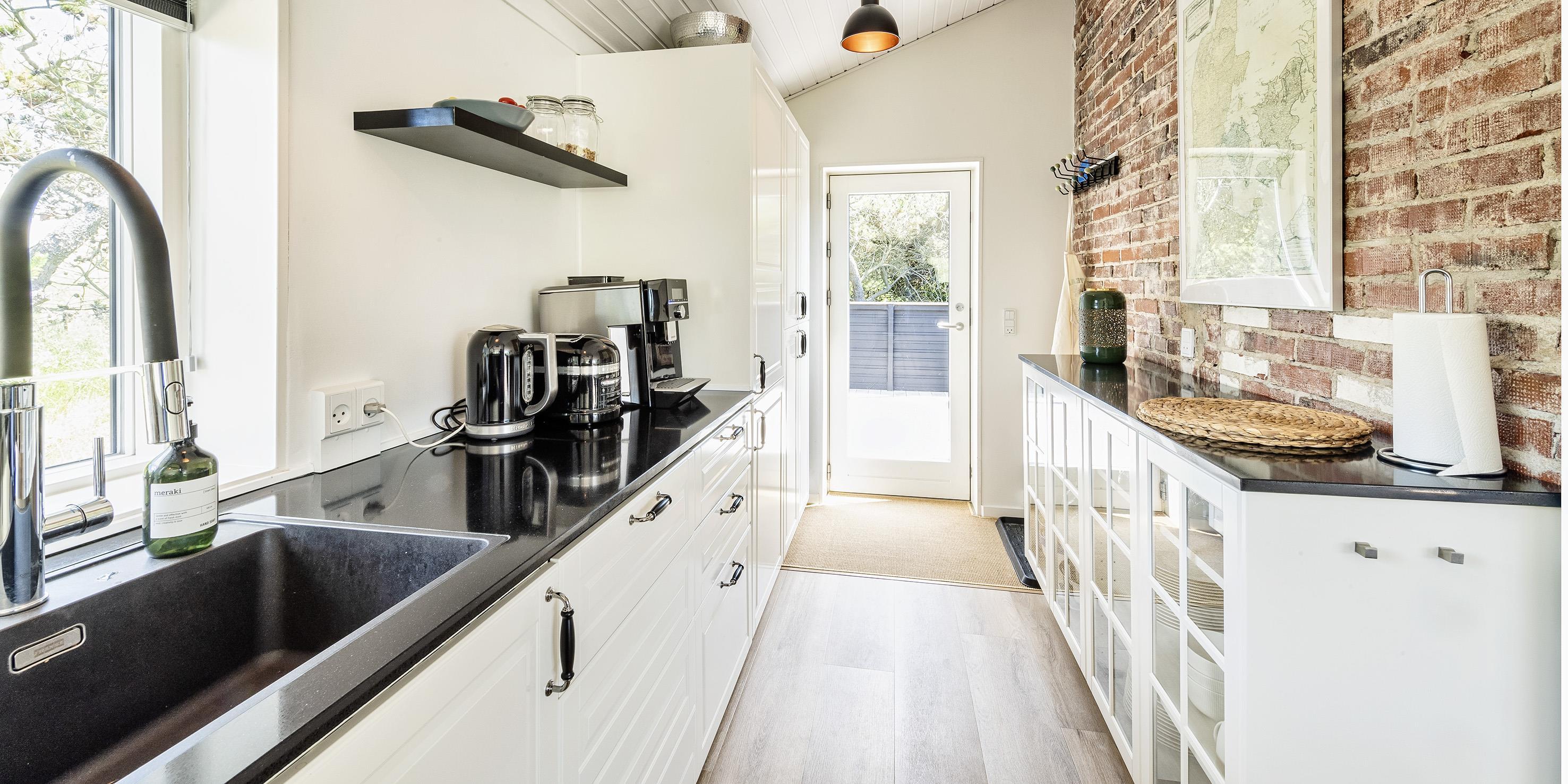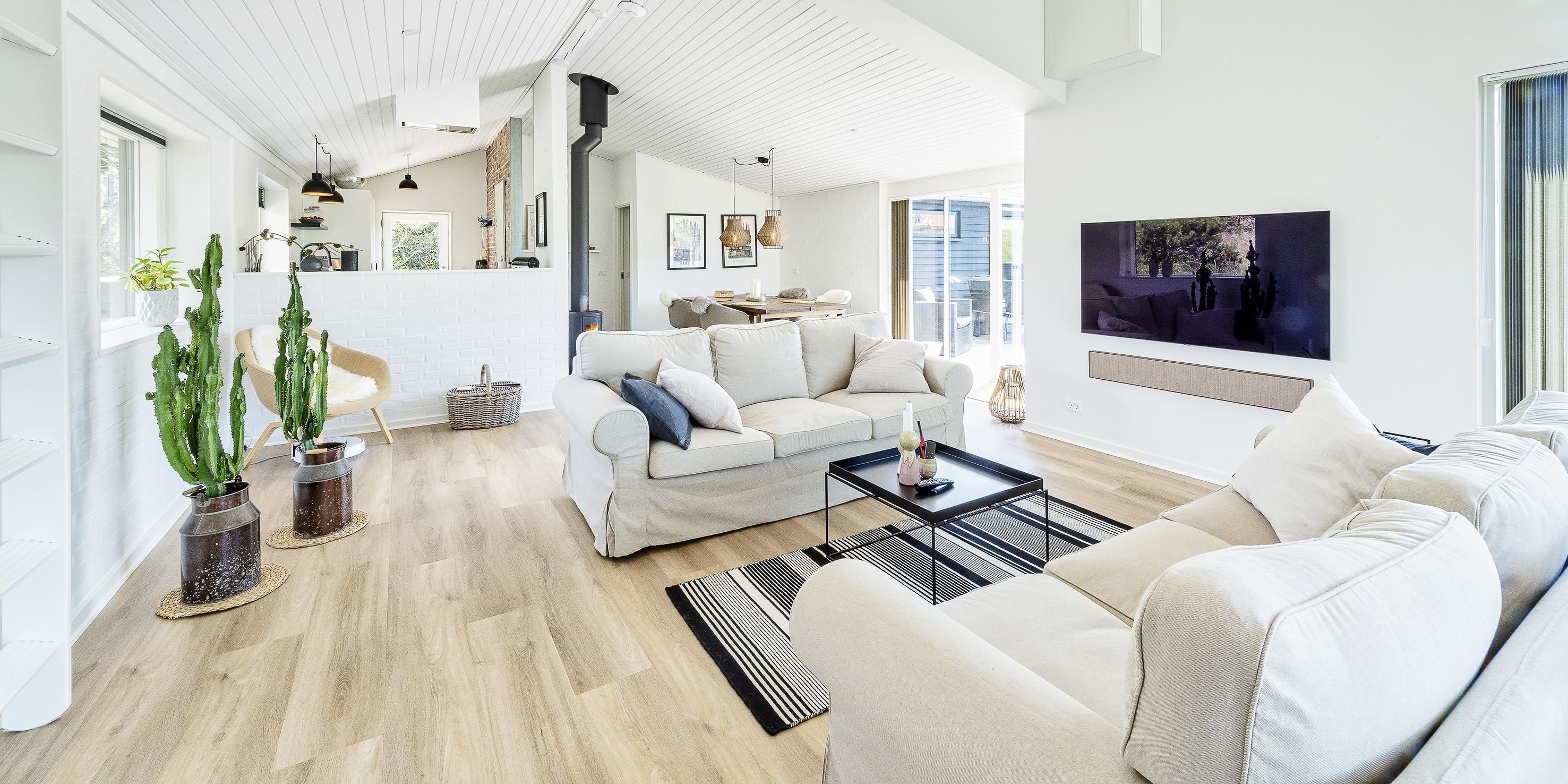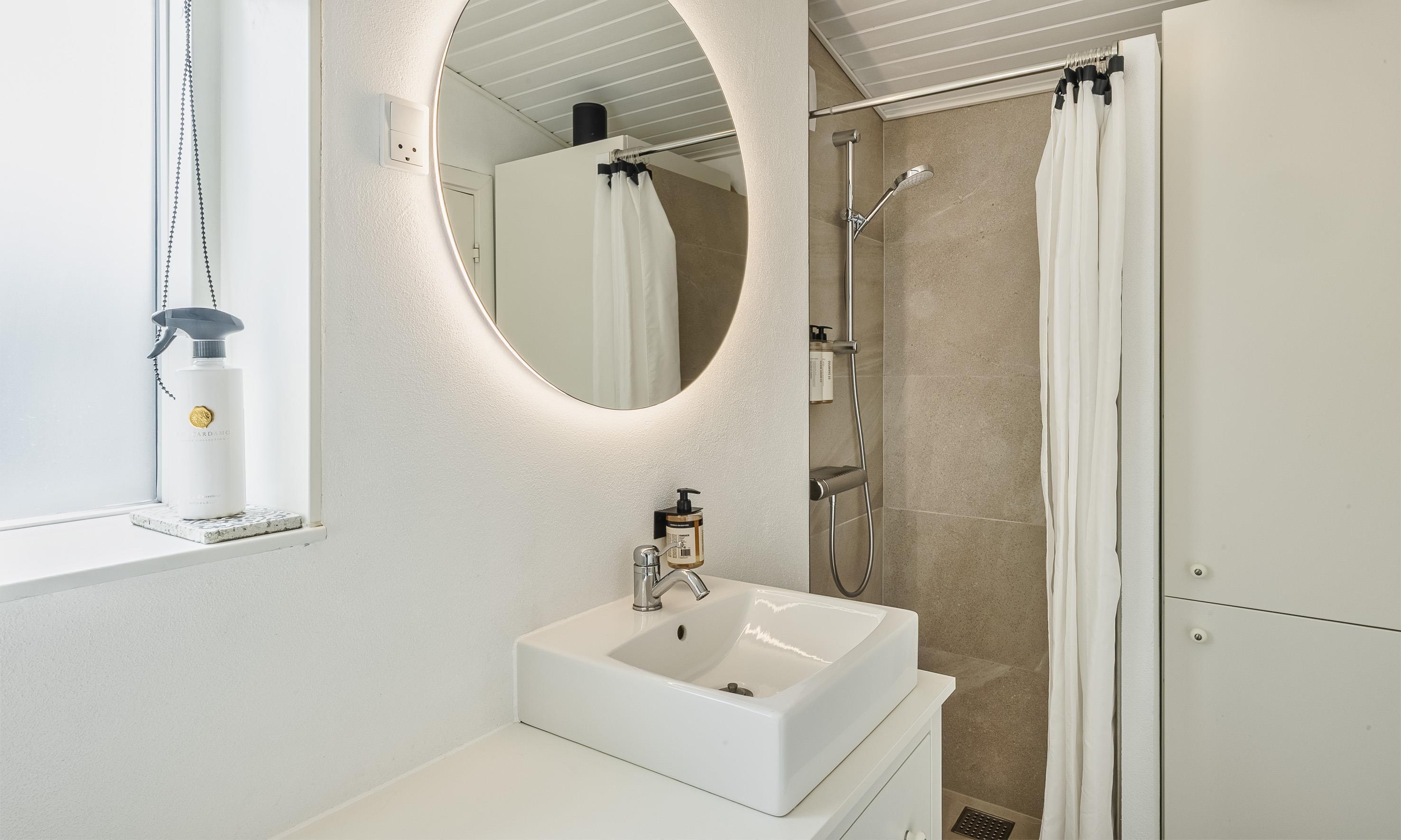 Sommerhuset: Indgangen til huset foregår fra bagsiden af huset indtil køkkenet. Herfra kommer man ind i huset opholdsrum med loft til kip. Køkkenet er i åbenforbindelse med opholdsstuen. Køkkenet er holdt i lyser toner og fremstår med alt komfort med bageovn, keramisk kogeplade, køle-fryseskab og opvaskemaskine. Fra køkkenet er der udgang til østvendt terrasse hvor morgenmaden kan nydes. Stor spisebord, hvorfra udsigten kan nydes fra de store panoramavinduer og aftensmåltidet kan indtages med varmen fra brændeovnen. Sofahjørnet byder på 2 store sofa-flyder, Tv med danske og udenlandske kanaler fra Stofa-tv pakken. Hyggekrog eller fordybningsplads med kig ud af det store vinduesparti. der er opgang til en hems fra stuen. Trådløs internet (30/30). 2 store soveværelser: DS + DS, dobbelt garderobeskabe og med udgang til terrassen. Wellness badeværelse med marmorfliser, stort vaskearrangement, garderobeskabe, væghængt toilet, stor bruseniche med glasvæg og udgang til saunahytte og udebruser. Vaskemaskine og tørretumbler. Ydermere et badeværelse med bruser/wc og vask.