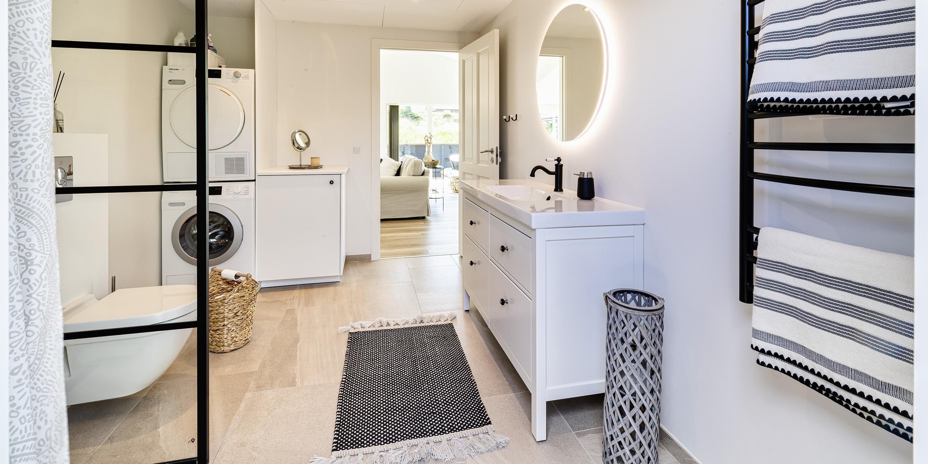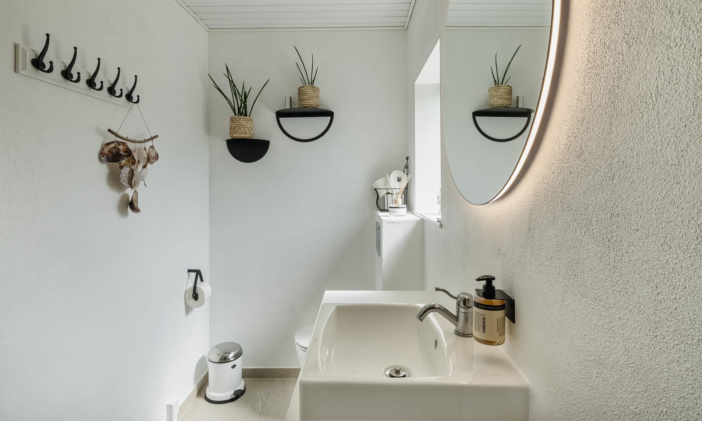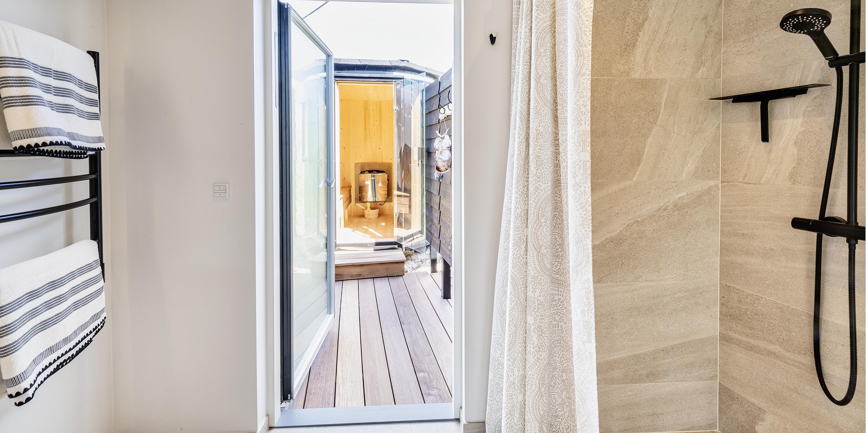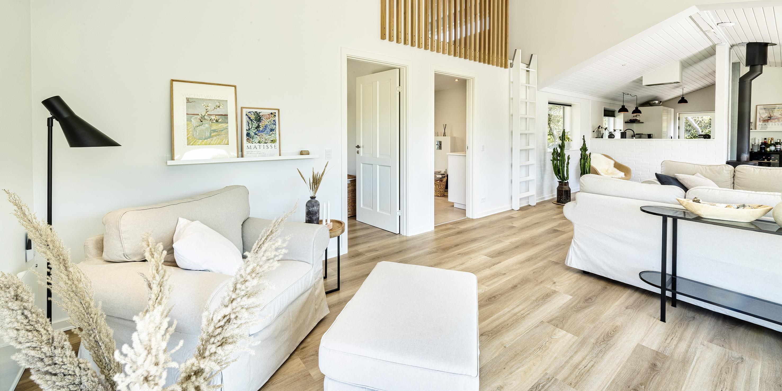 Sommerhuset: Indgangen til huset foregår fra bagsiden af huset indtil køkkenet. Herfra kommer man ind i huset opholdsrum med loft til kip. Køkkenet er i åbenforbindelse med opholdsstuen. Køkkenet er holdt i lyser toner og fremstår med alt komfort med bageovn, keramisk kogeplade, køle-fryseskab og opvaskemaskine. Fra køkkenet er der udgang til østvendt terrasse hvor morgenmaden kan nydes. Stor spisebord, hvorfra udsigten kan nydes fra de store panoramavinduer og aftensmåltidet kan indtages med varmen fra brændeovnen. Sofahjørnet byder på 2 store sofa-flyder, Tv med danske og udenlandske kanaler fra Stofa-tv pakken. Hyggekrog eller fordybningsplads med kig ud af det store vinduesparti. der er opgang til en hems fra stuen. Trådløs internet (30/30). 2 store soveværelser: DS + DS, dobbelt garderobeskabe og med udgang til terrassen. Wellness badeværelse med marmorfliser, stort vaskearrangement, garderobeskabe, væghængt toilet, stor bruseniche med glasvæg og udgang til saunahytte og udebruser. Vaskemaskine og tørretumbler. Ydermere et badeværelse med bruser/wc og vask.