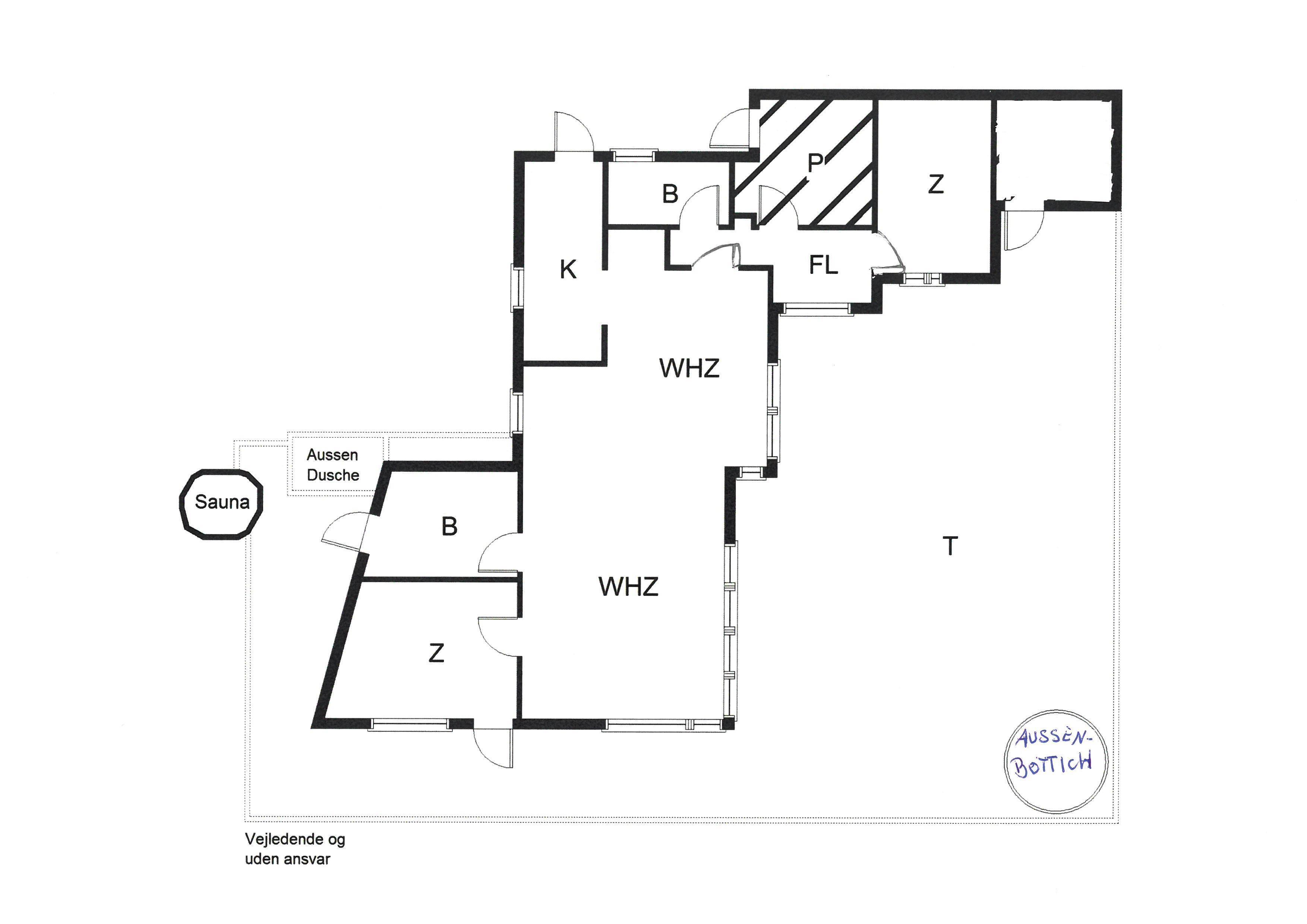 Huset opvarmes med gulvvarme samt der er en varmepumpe i stuen. Der er skydedøre fra stuen ud til en stor lukket terrasse med nedbygget vildmarksbad. Husdyr og rygning er ikke tilladt. Vand inkl. i lejen.