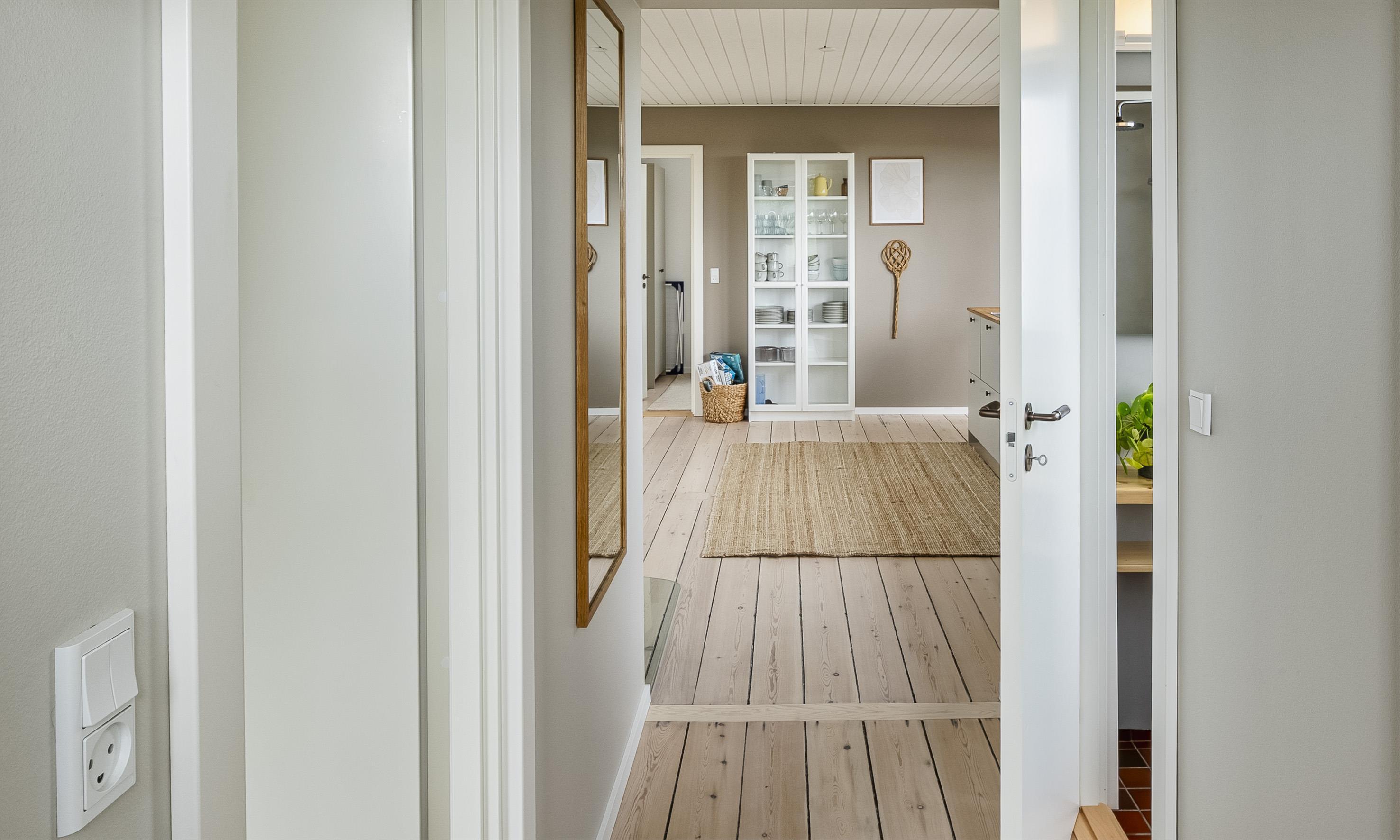 Huset er indrettet med entre. Stort opholdsrum med køkken, spiseplads og stue med udgang til terrasse. Separat rum med toilet, håndvask og gulvvarme. Separat rum med brusebad og gulvvarme. 4 soveværelser med 6 sovepladser i alt. DS+DS+ES+ES. Det ene soveværelse er gennemgangsværelse til et andet soveværelse.