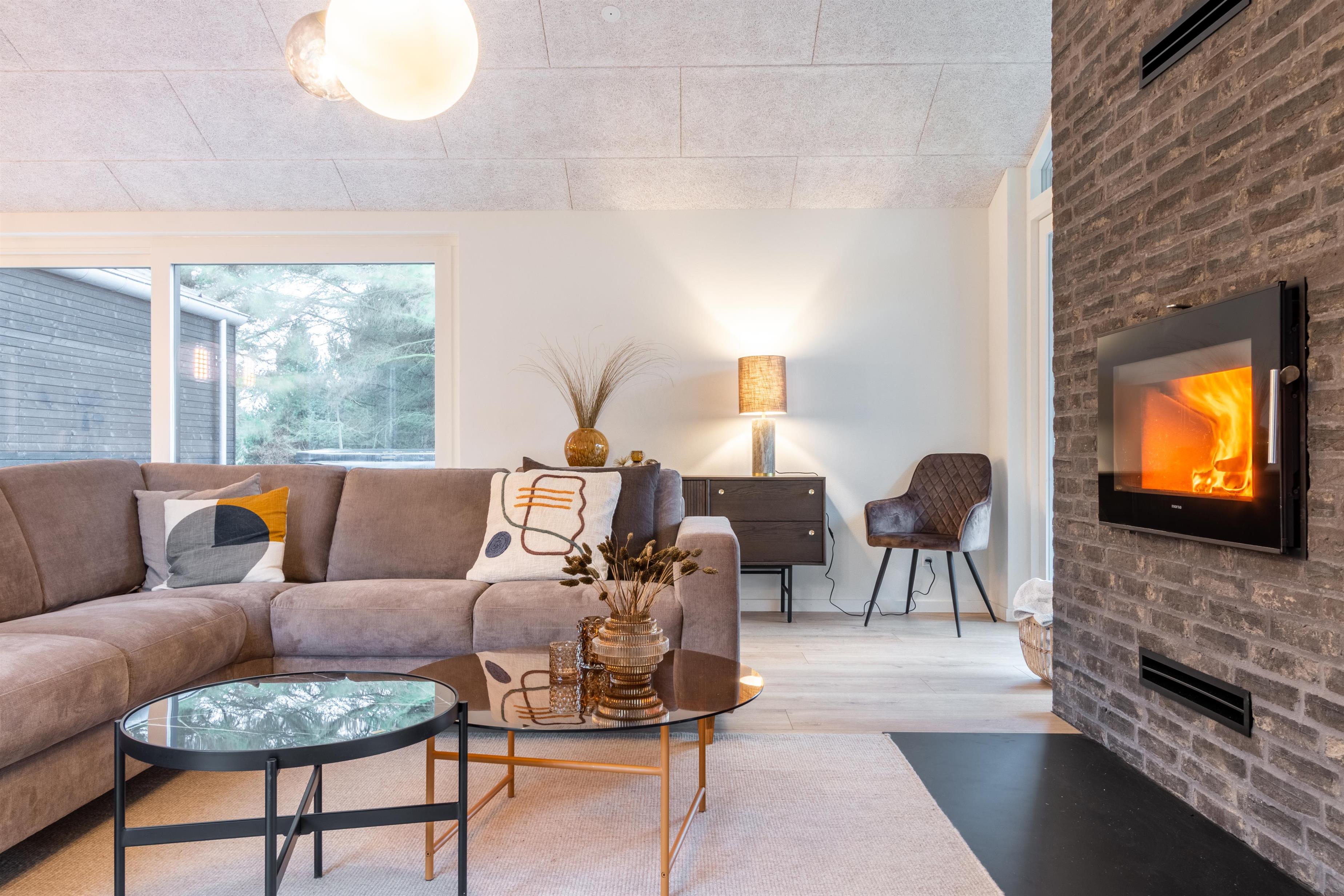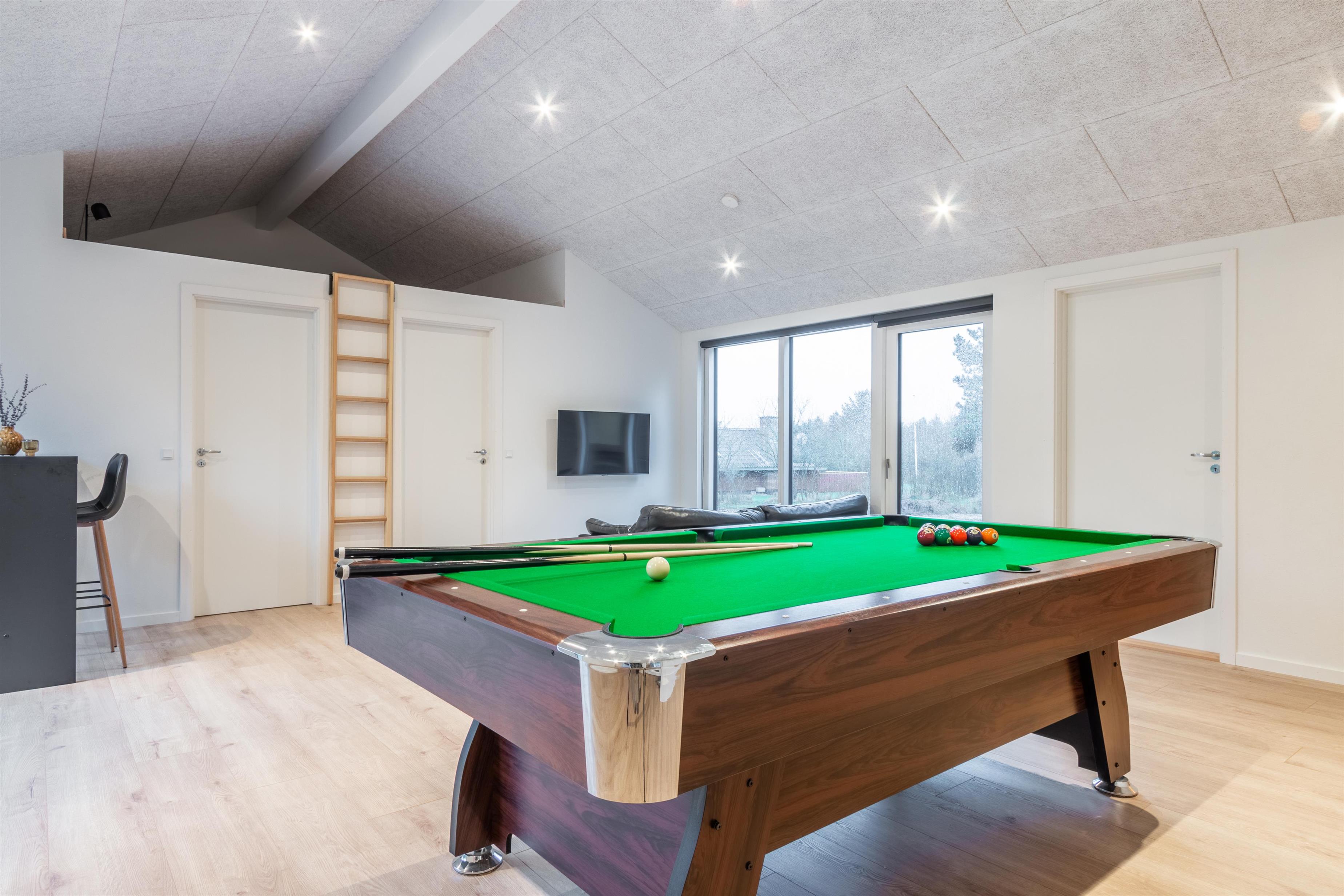 Sommerhuset: Entre indgangsparti med god plads til garderoben og ekstra opbevaring. Den store entre rummer desuden vaskemaskine og tørretumbler. Fra entreen kommer man over i huset rummelige aktivitetsrum med billardbord- /bordtennisbord i et. Der forefindes PlayStation (4) til fri benyttelse - vi garanterer dog ikke for tilstanden af spillekonsollen. Der er trådløst internet i huset. Rummeligt opholdsrum med loft til kip, rummet fremstår lyst og dejligt med åben planløsning med opholdsrum og køkken-alrum ud i et, store glaspartier hvorfra hele naturgrunden kan betragtes og det rige dyreliv i området. Køkkenet fremstår med alt komfort såsom opvaskemaskine, mikroovn, indbygningsovn, induktions kogeplade, køleskab, fryser med 70 L frysekapacitet og 1 vinkøleskab. Køkkenet er i åben forbindelse med spiseplads, dejlig opholdsstue med fjernsyn med google Chromecast og indbygget brændeovn, tv-pakke fra Stofa samt trådløst internetadgang. Lækker stor terrasse miljø omkring huset med overdækket terrasse på 20 kvm. Dagen kan nydes fra morgen til aften på de store terrasser. Der er 6 rummelige soveværelser: DS + DS + DS + DS + DS + 2ES god garderobeplads. 3 badeværelser med wc, vask med underskab og bruseniche.
