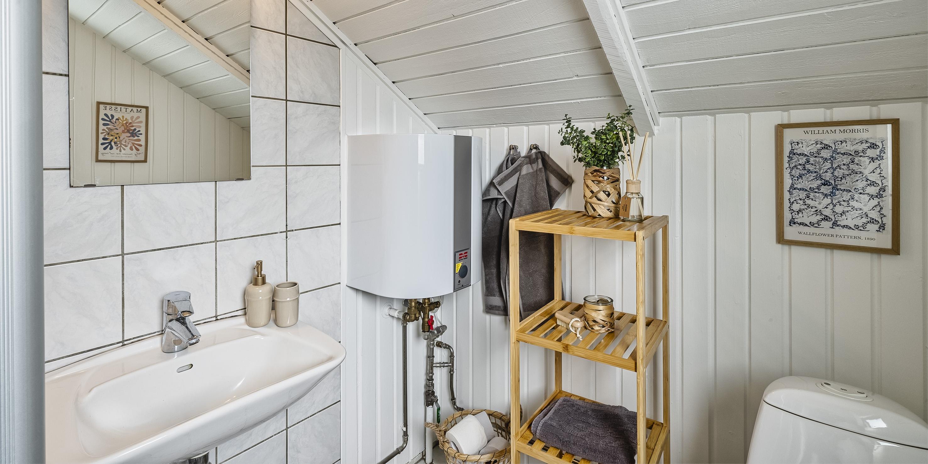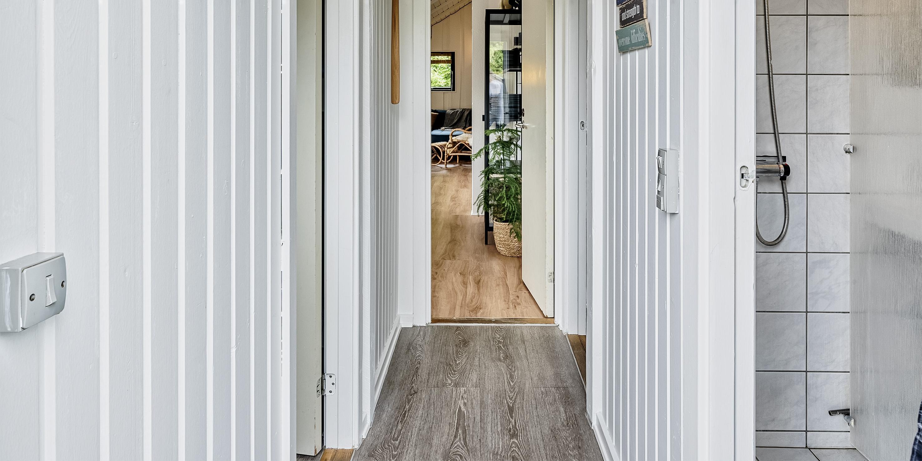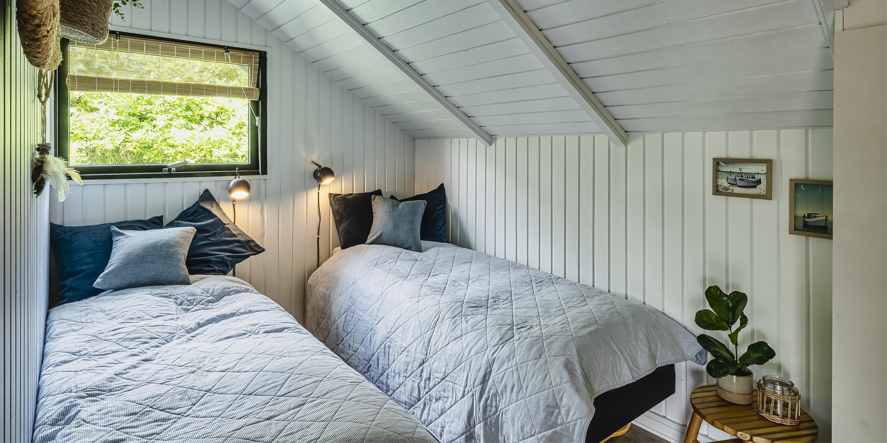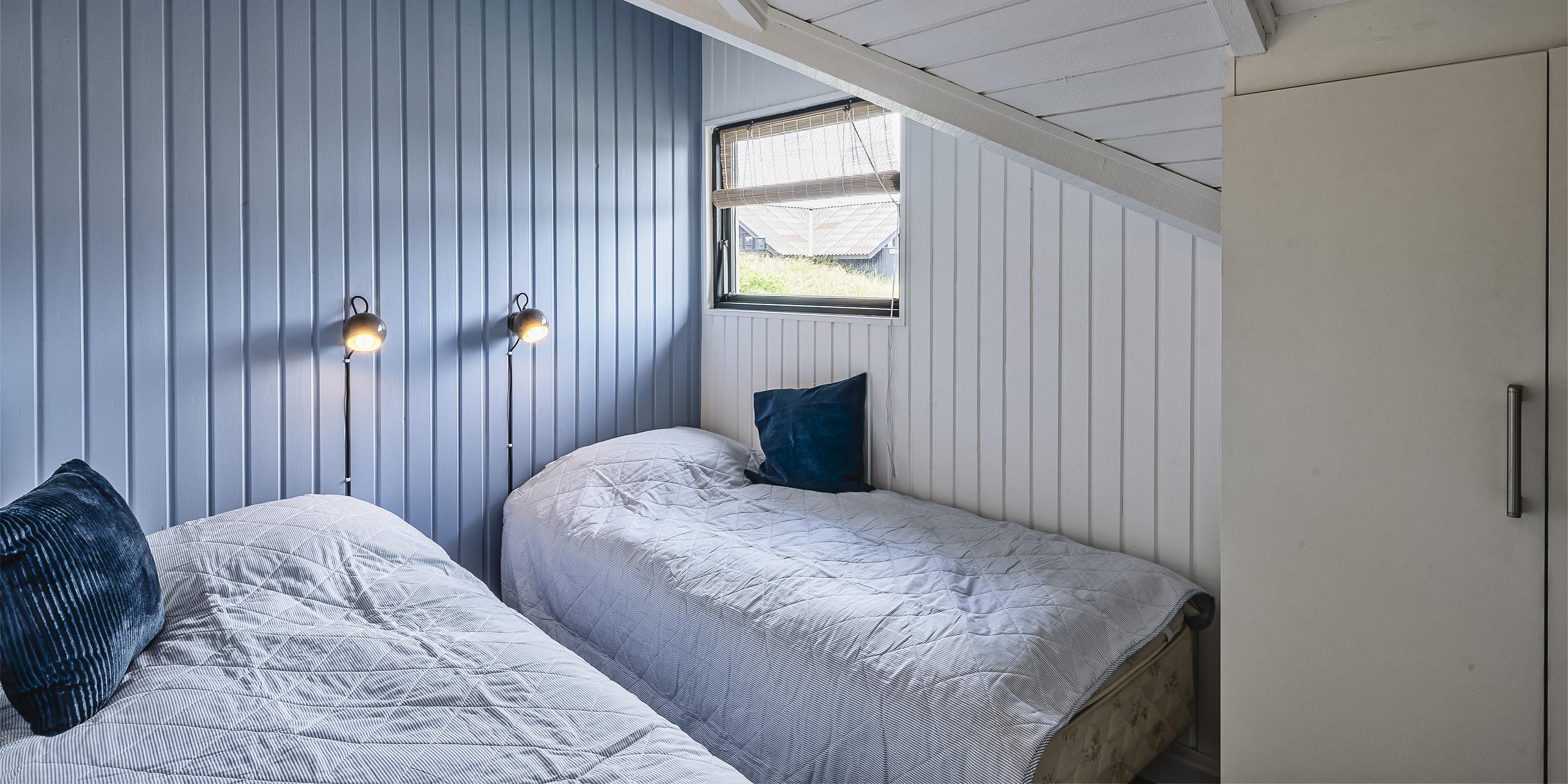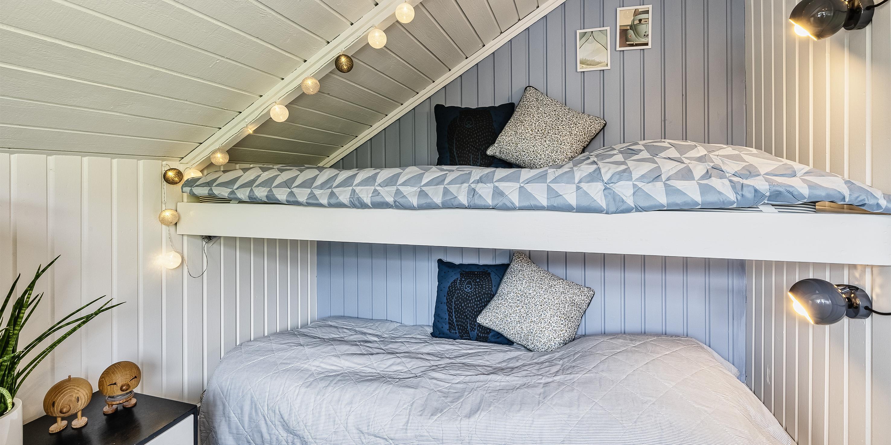 3 soveværelser. 2 med 2 enkeltsenge (á 90x200 cm). 1 med køjeseng.