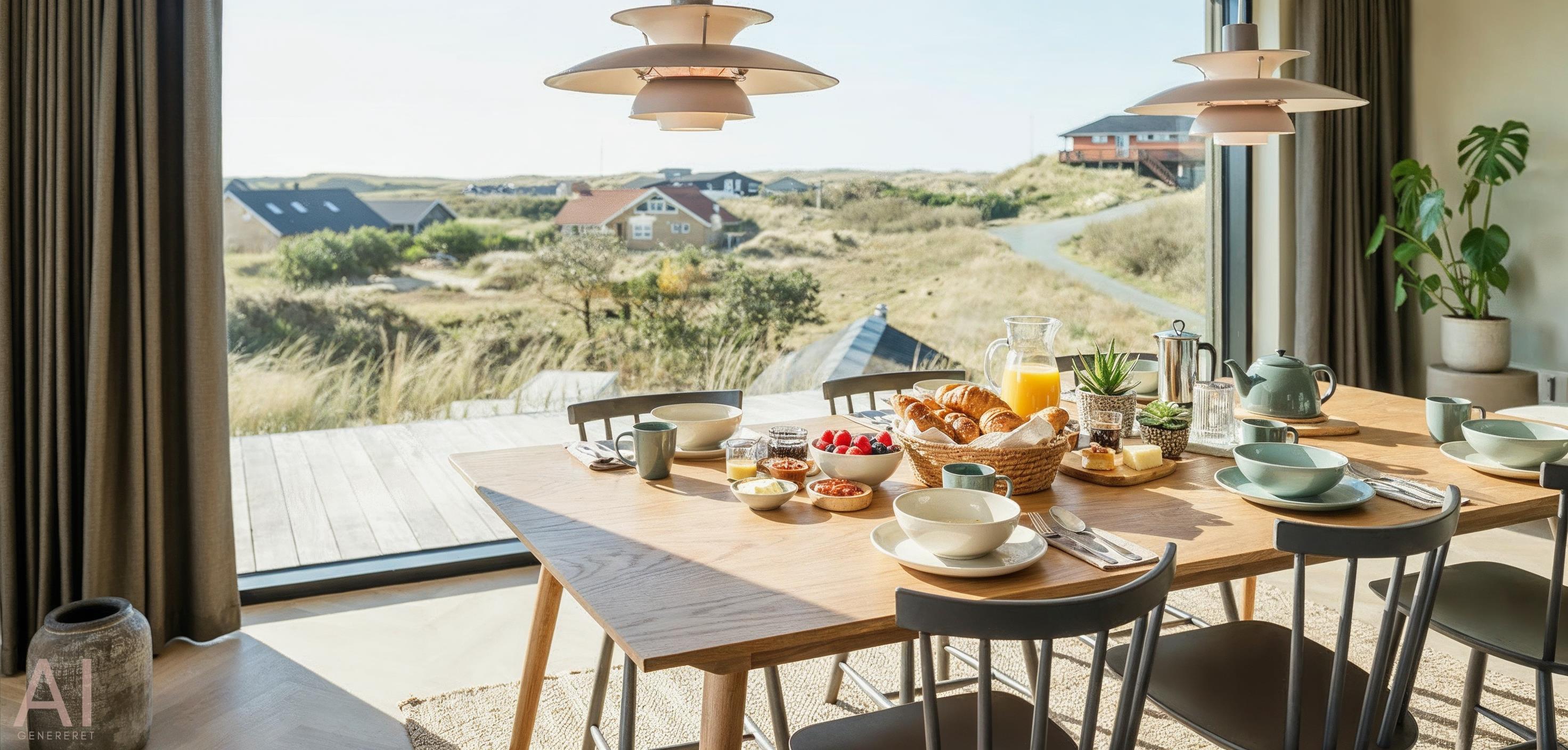 Sommerhuset byder på en skøn atmosfære i en moderne boheme stil, og med store panoramavinduer vendt mod havet. Der er havudsigt fra terrassen, køkken og fra første sal.