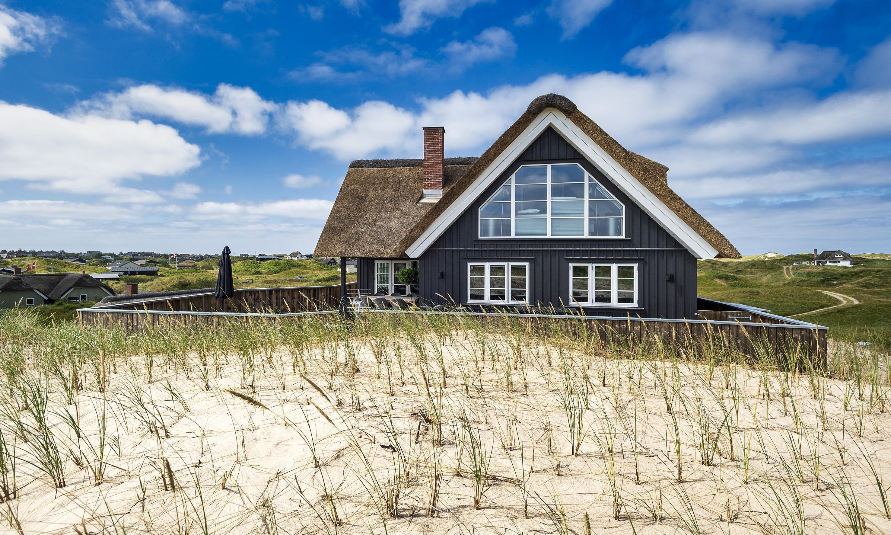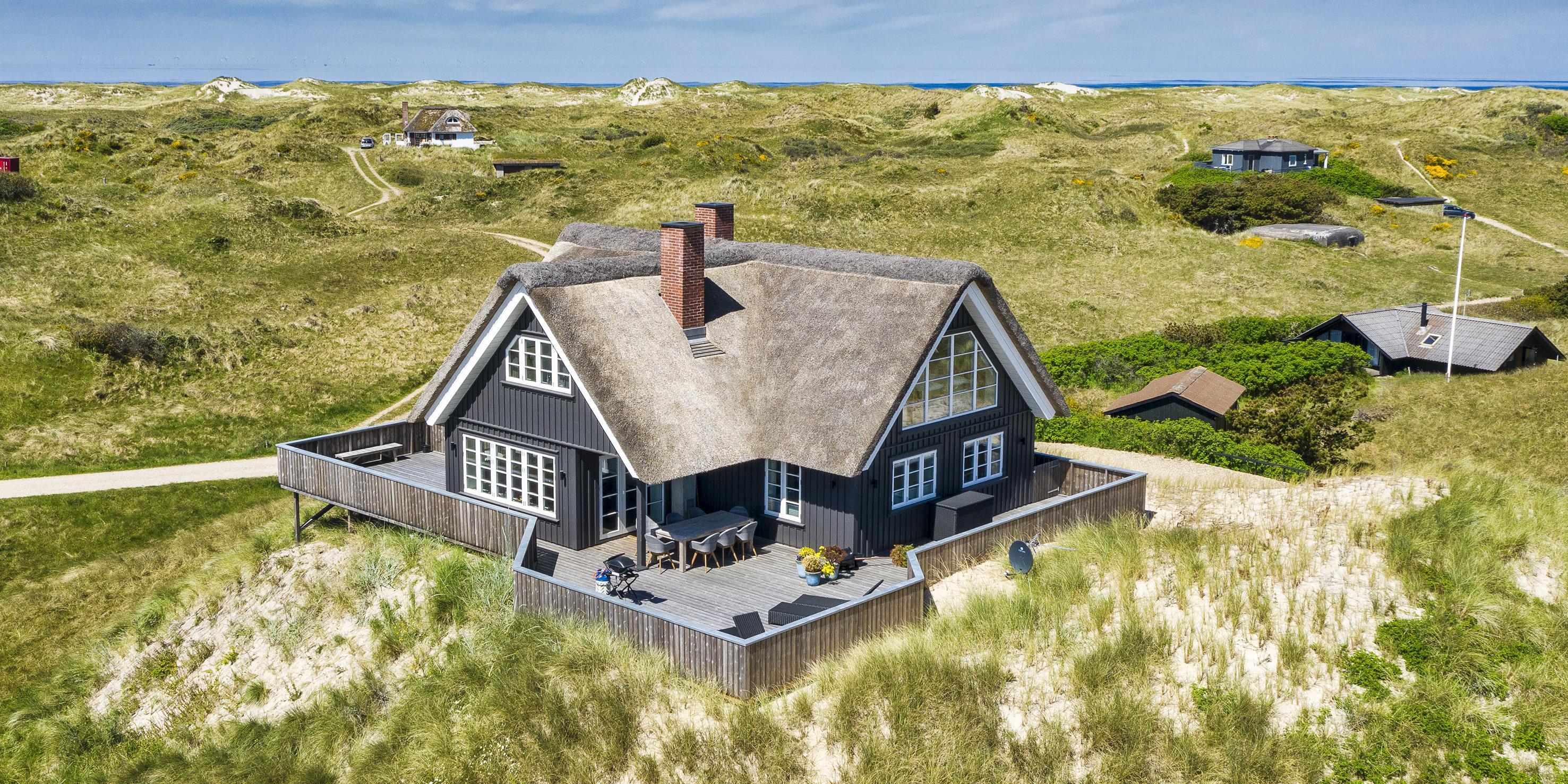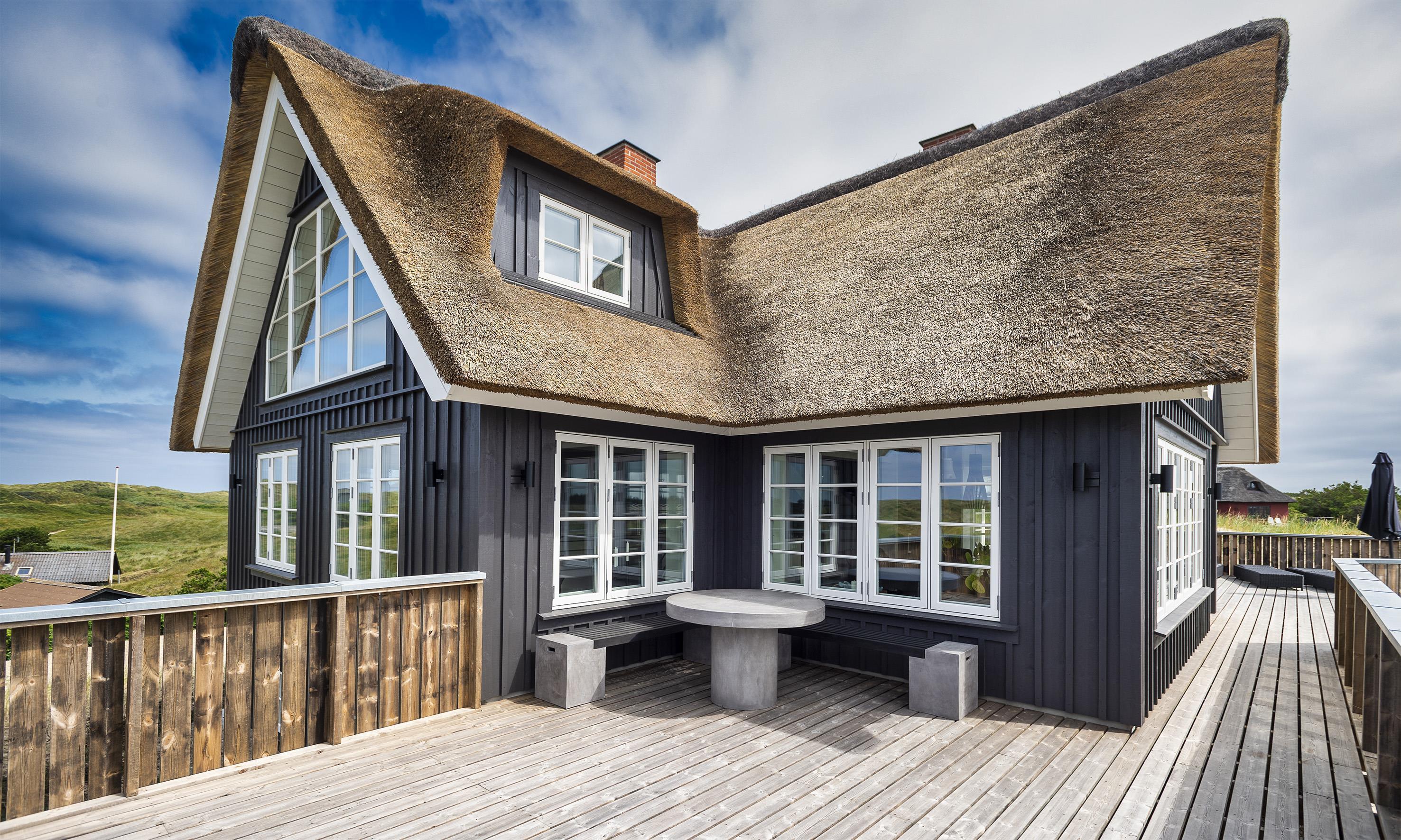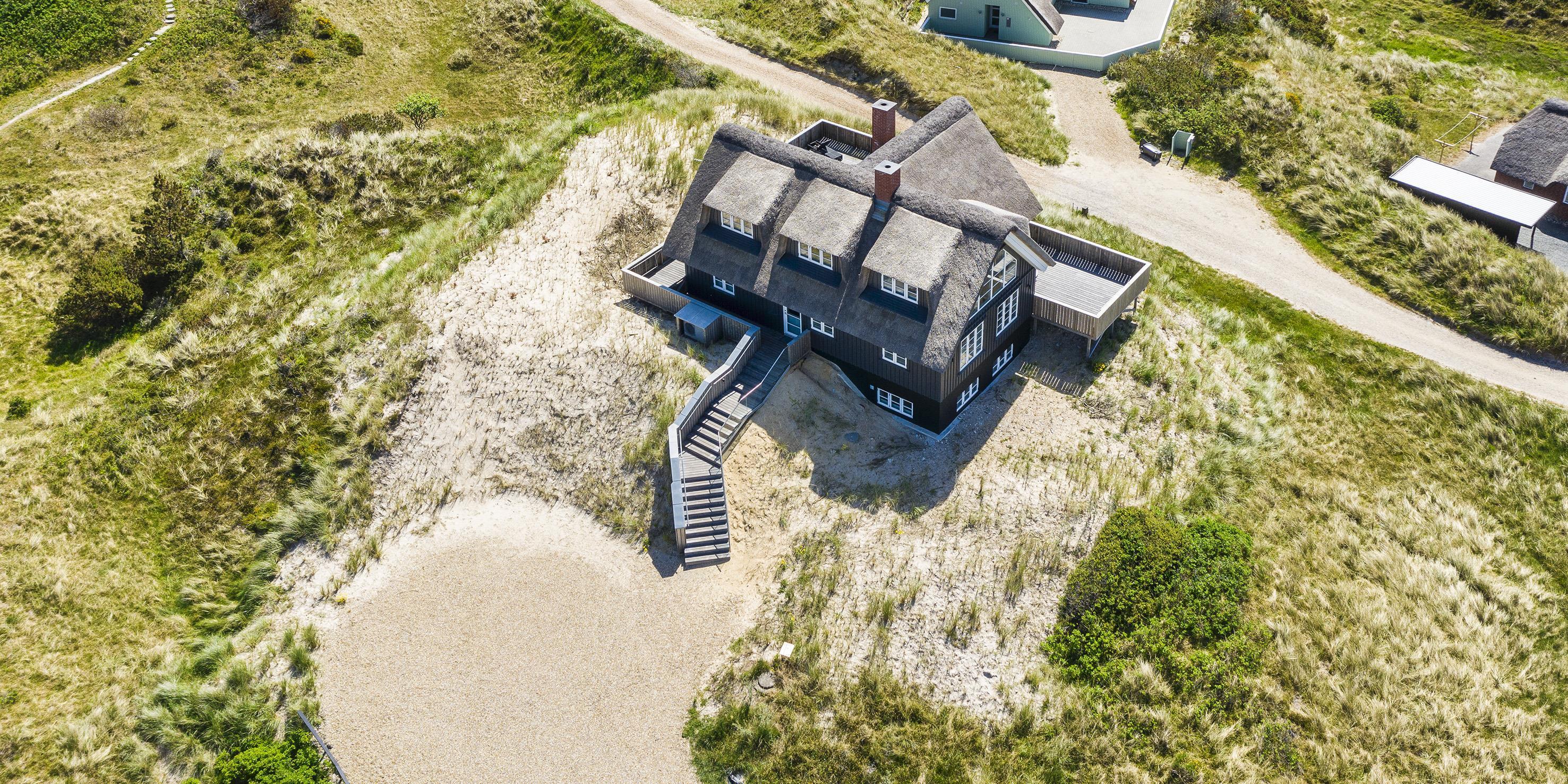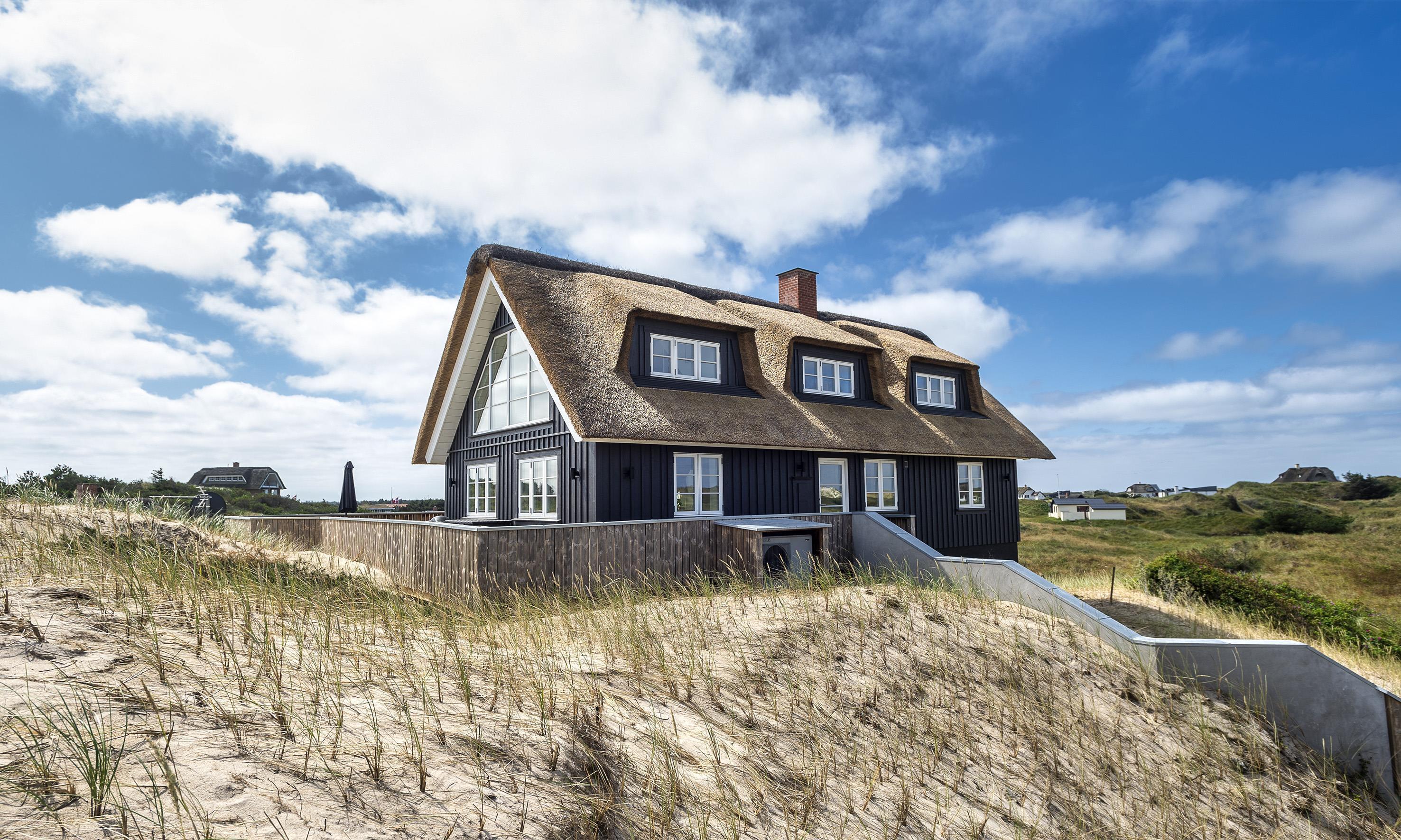 Meget smagfuldt, stråtækt sommerhus i 3 plan til 8 personer, beliggende på klitgrund med panoramaudsigt, ca. 200 meter fra stranden. Huset indeholder i stueetagen: Indgang/entre herfra kommer man direkte ind i et lyst køkken-alrum, dejlig lyst køkken med opvaskemaskine, hævet bageovn og keramisk komfur. Køkkenet er i åben forbindelse med en havestue med brændeovn og spiseplads med panoramaudsigt. Udgang til den store terrasse. 4 soveværelser. DS + DS + DS + DS. 3 soveværelser med hver 1 dobbeltseng (2 senge af 90 x200 cm). Dejlig badeværelse med vaskearrangement, bruser og væghængt wc. 1. sal: en fantastisk opholdsstue med skøn panoramaudsigt fra de store gavlvinduer. Sofahjørne med kig til brændeovn og fjernsyn med parabolprogrammer (ingen danske kanaler). 1 stort Masterbedroom med 1 dobbeltseng (2 senge af 105 x200 cm). Badeværelse med vask, bruser og wc. Der forefindes trådløs Internetadgang i hele huset. Trappenedgang fra stueetagen til stor kælder med multirum med fjernsyn og parabolprogrammer, dart og en romaskine. Endvidere bryggers med kombineret vaske-/tørretumbler. Stort master badeværelse med vaskearrangement, bruser og spa, ekstra rum med sauna og et ekstra rum med væghængt toilet og vask. Rundt om huset forefindes der en stor lukket træterrasse. Huset har en gas Weber grill, som må benyttes. Gas til grillen skal selv medbringes, samt skal grillen stilles rengjort tilbage efter brug. Elbiler kan oplades ved huset. Rygning er ikke tilladt. Byggeår 2019