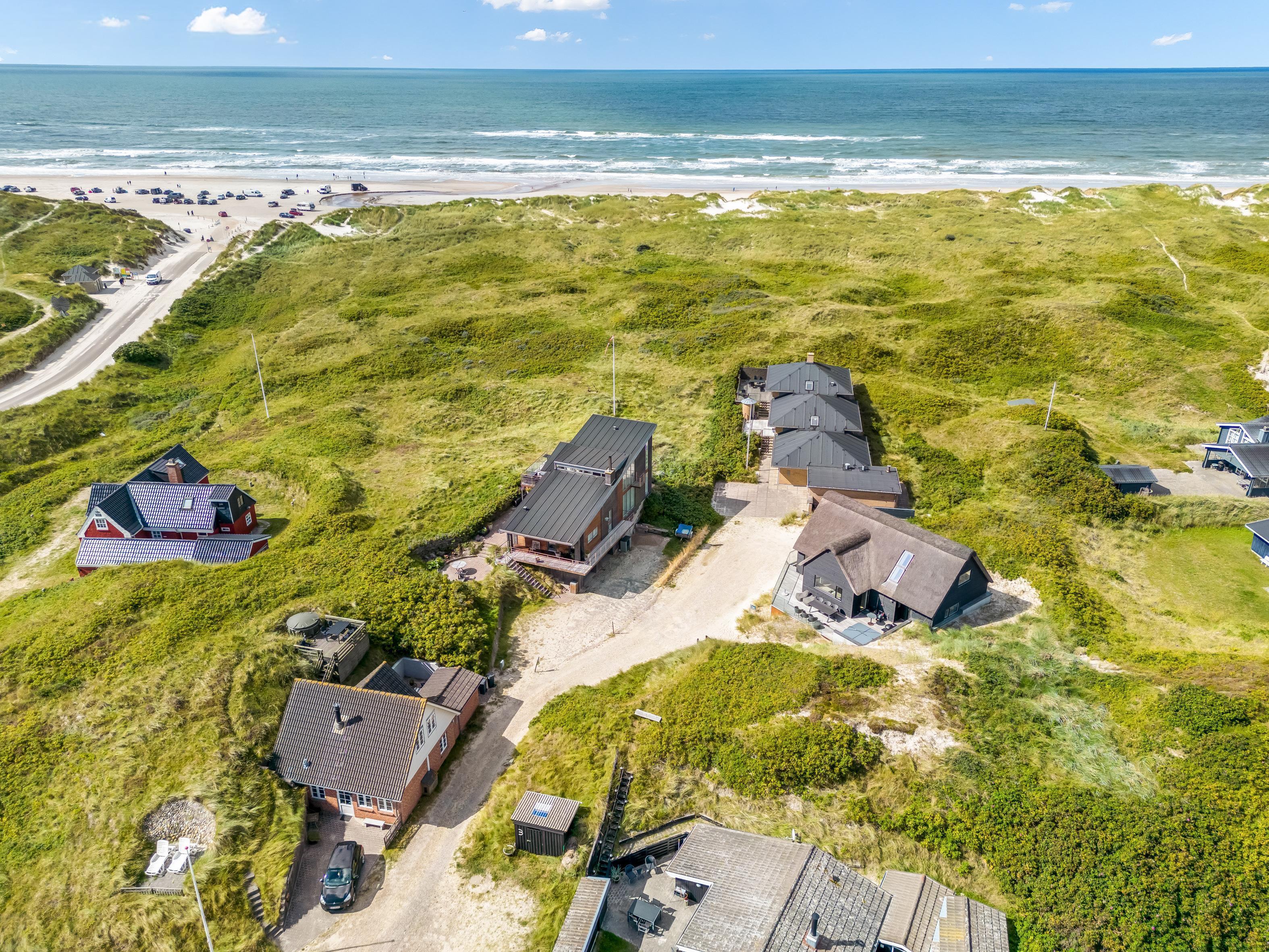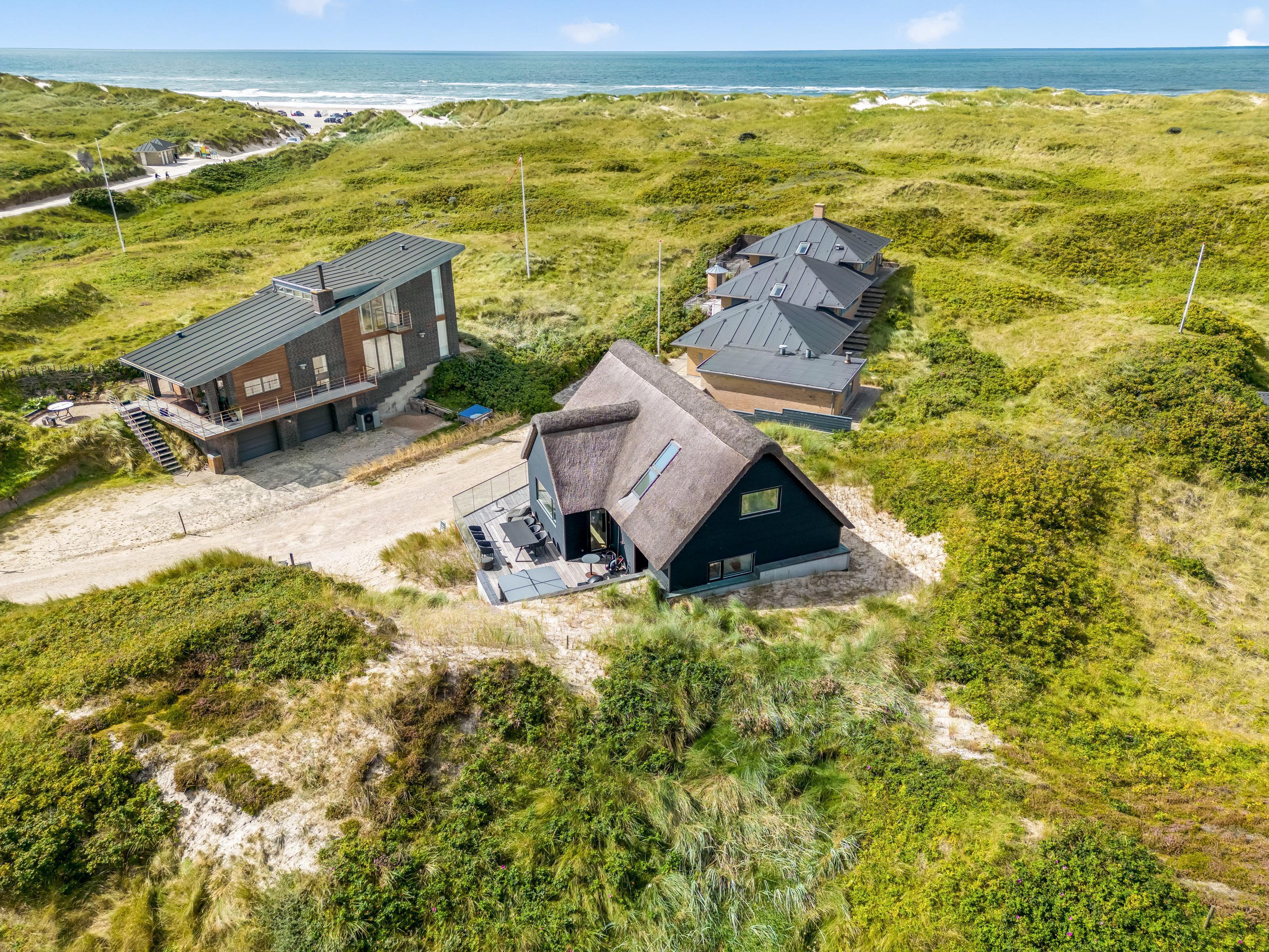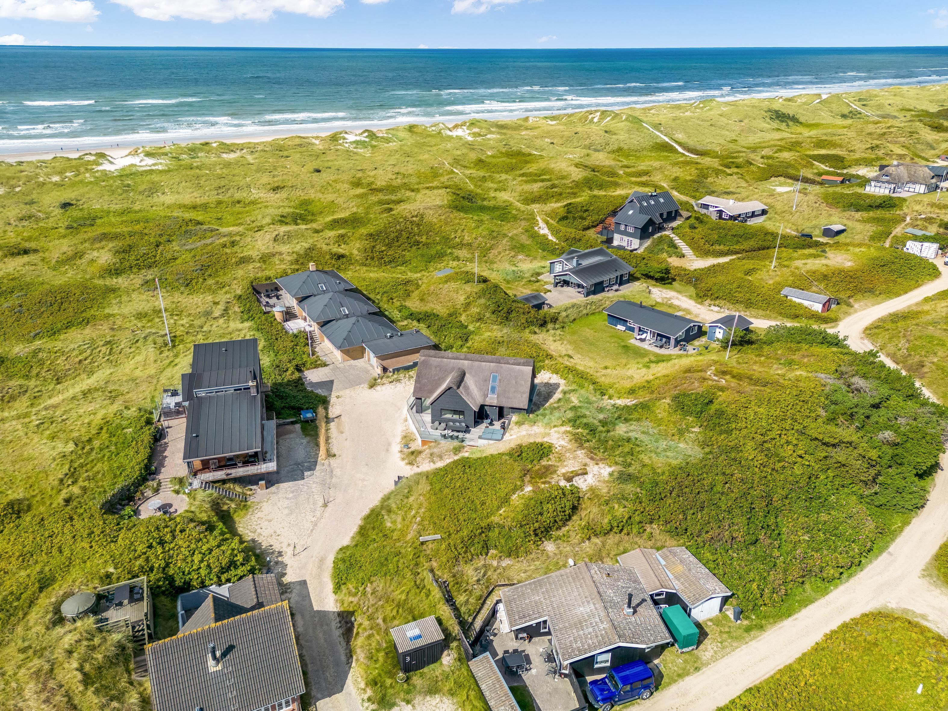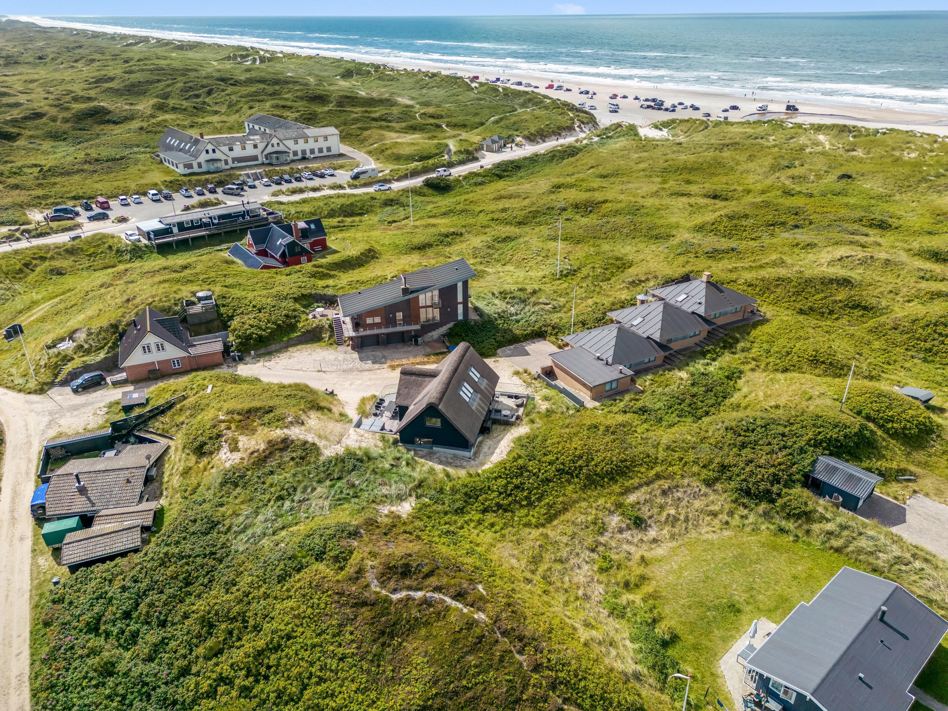 De udvendige faciliteter byder på flotte solnedgange, der kan nydes fra den store omkring liggende træterrasse. Sommerhuset ligger på en klitgrund ca. 100 meter fra stranden samt kort afstand til indkøb og restaurant.