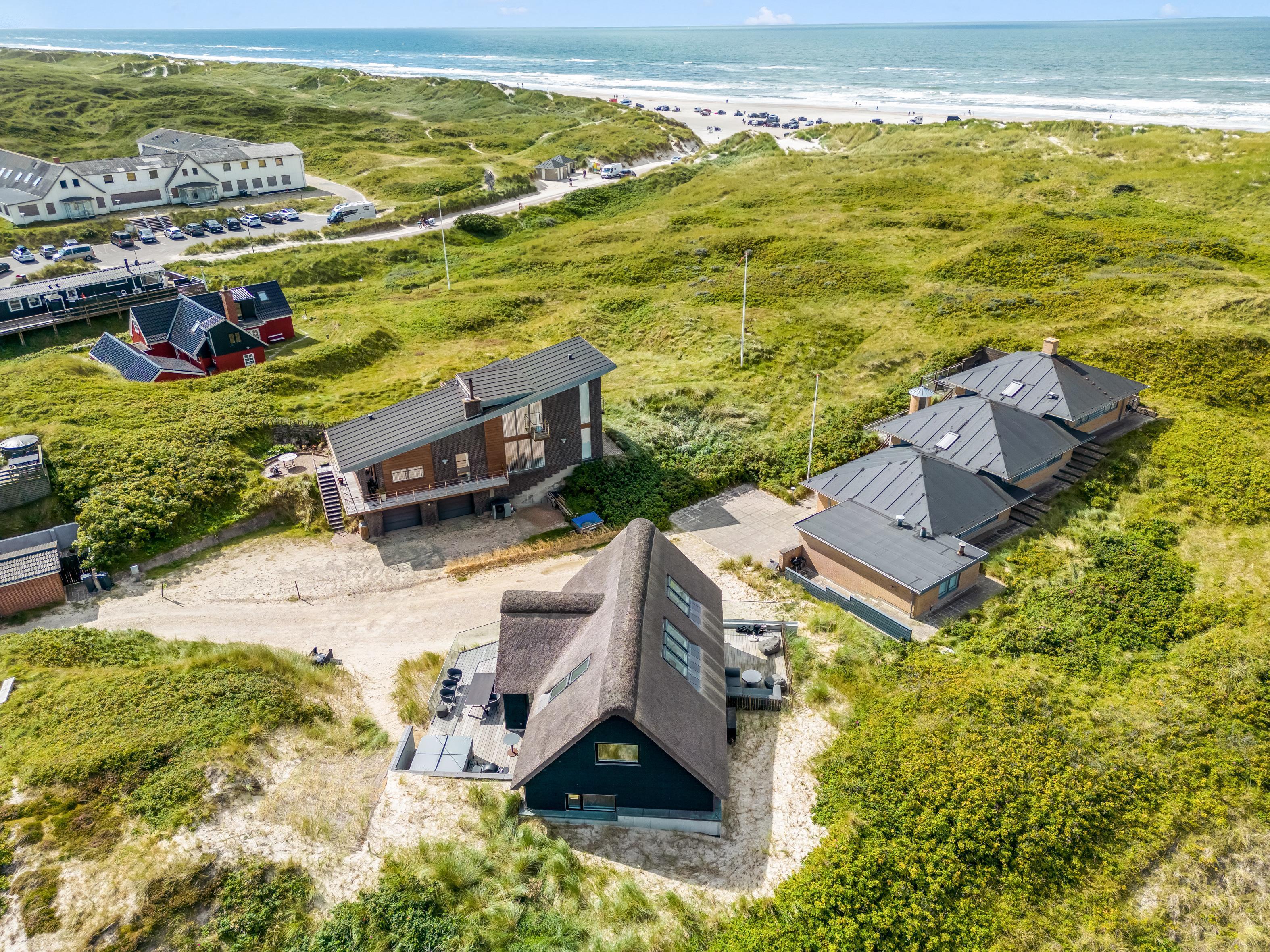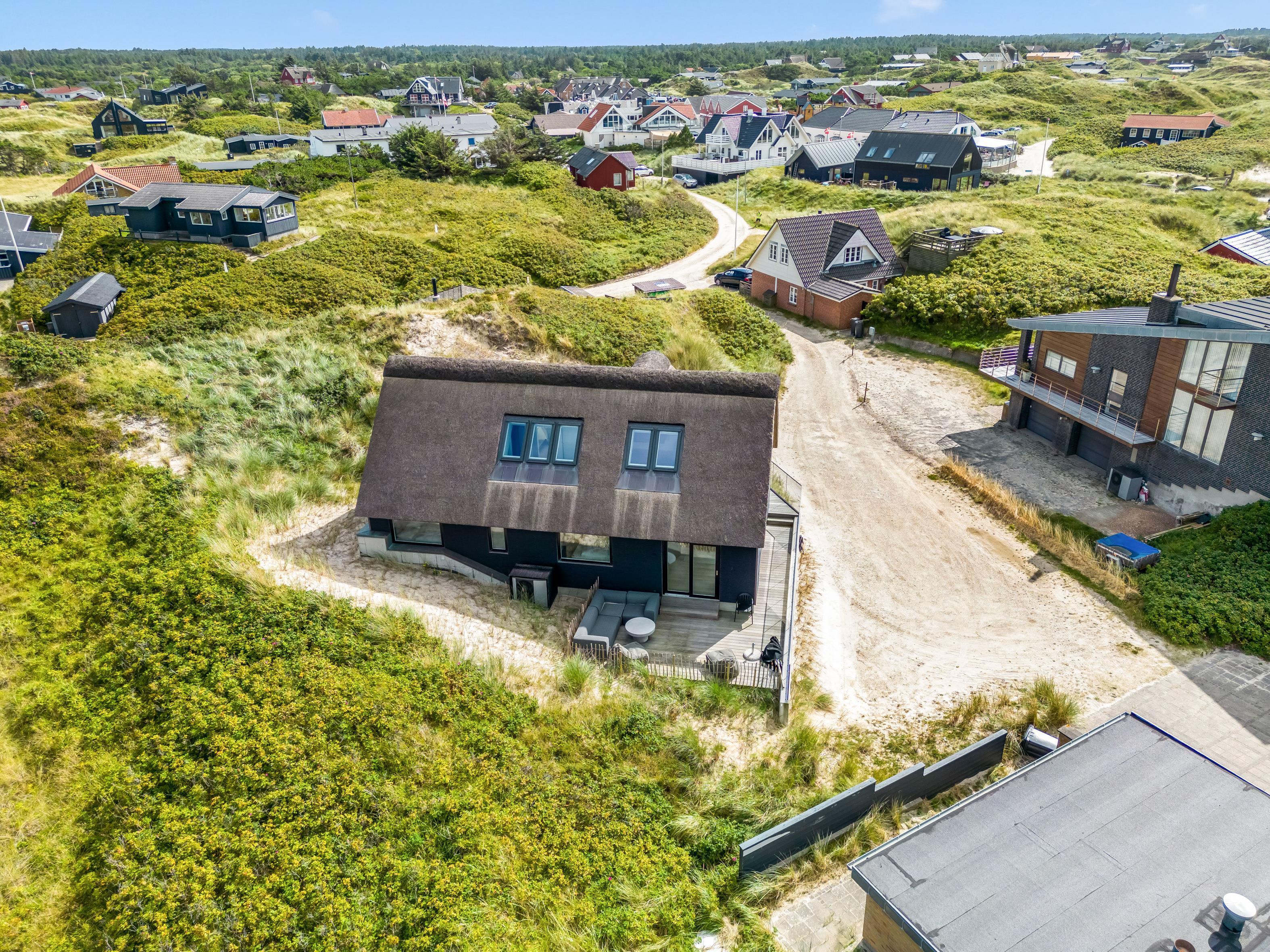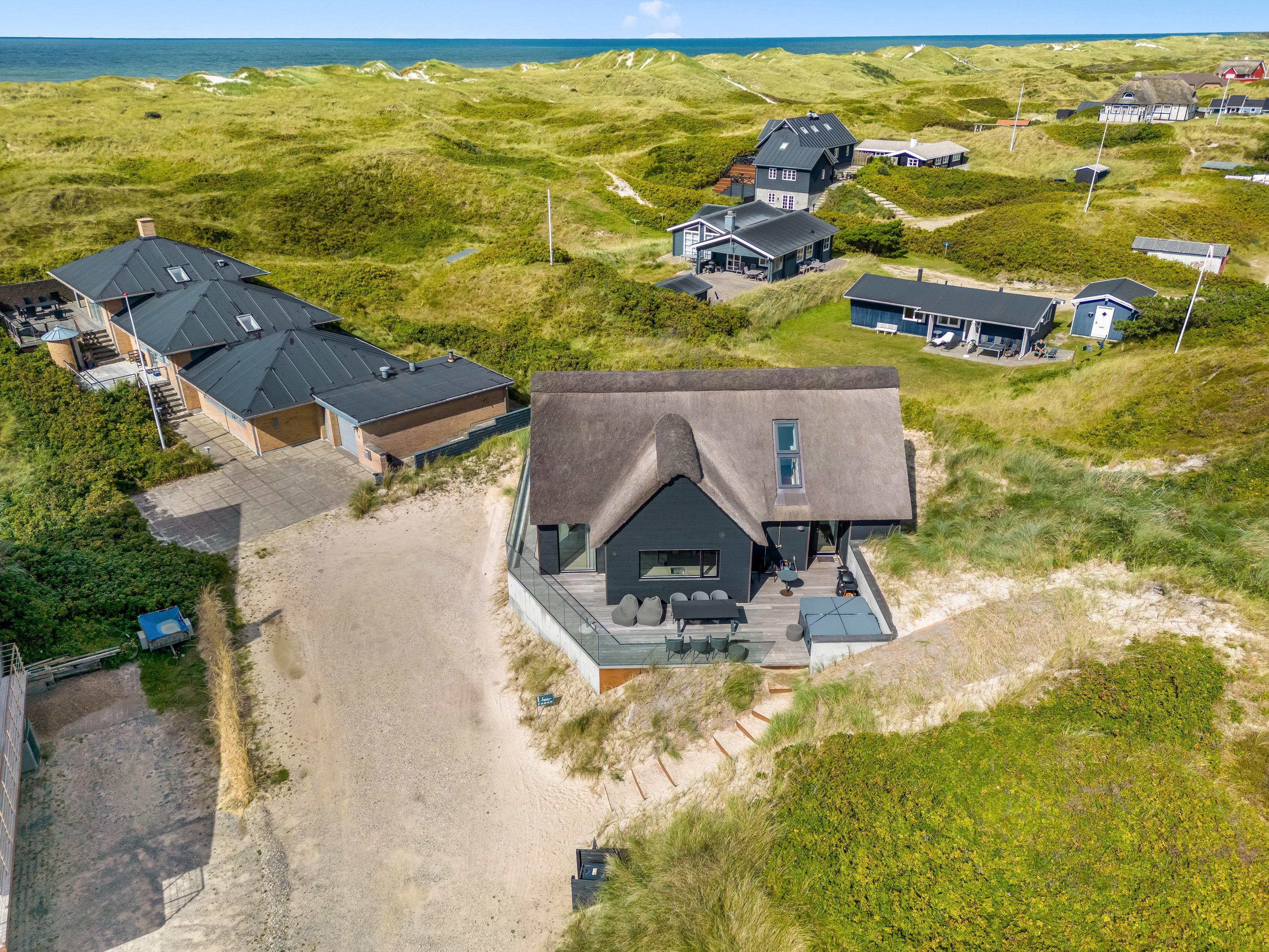 De udvendige faciliteter byder på flotte solnedgange, der kan nydes fra den store omkring liggende træterrasse. Sommerhuset ligger på en klitgrund ca. 100 meter fra stranden samt kort afstand til indkøb og restaurant.