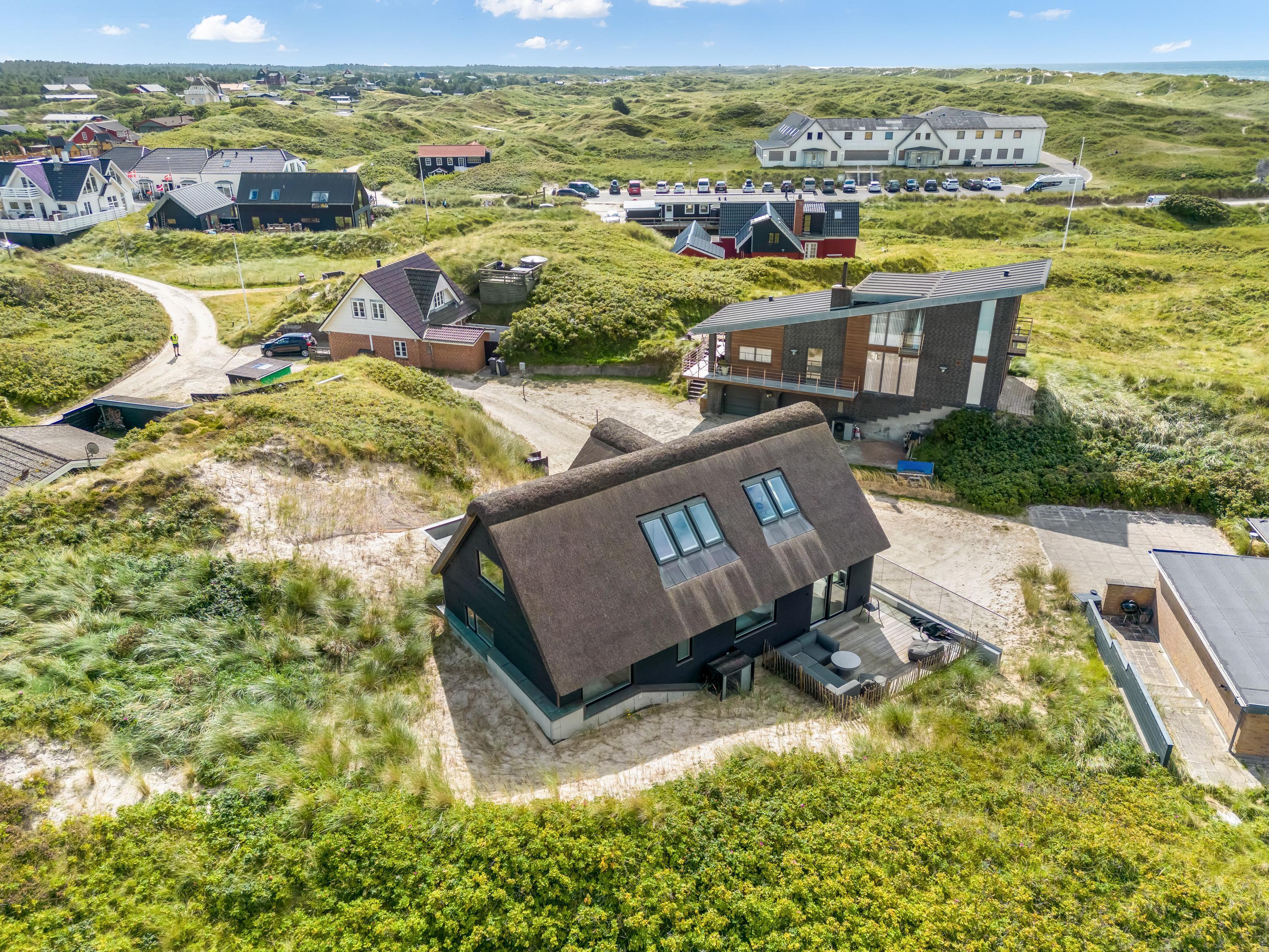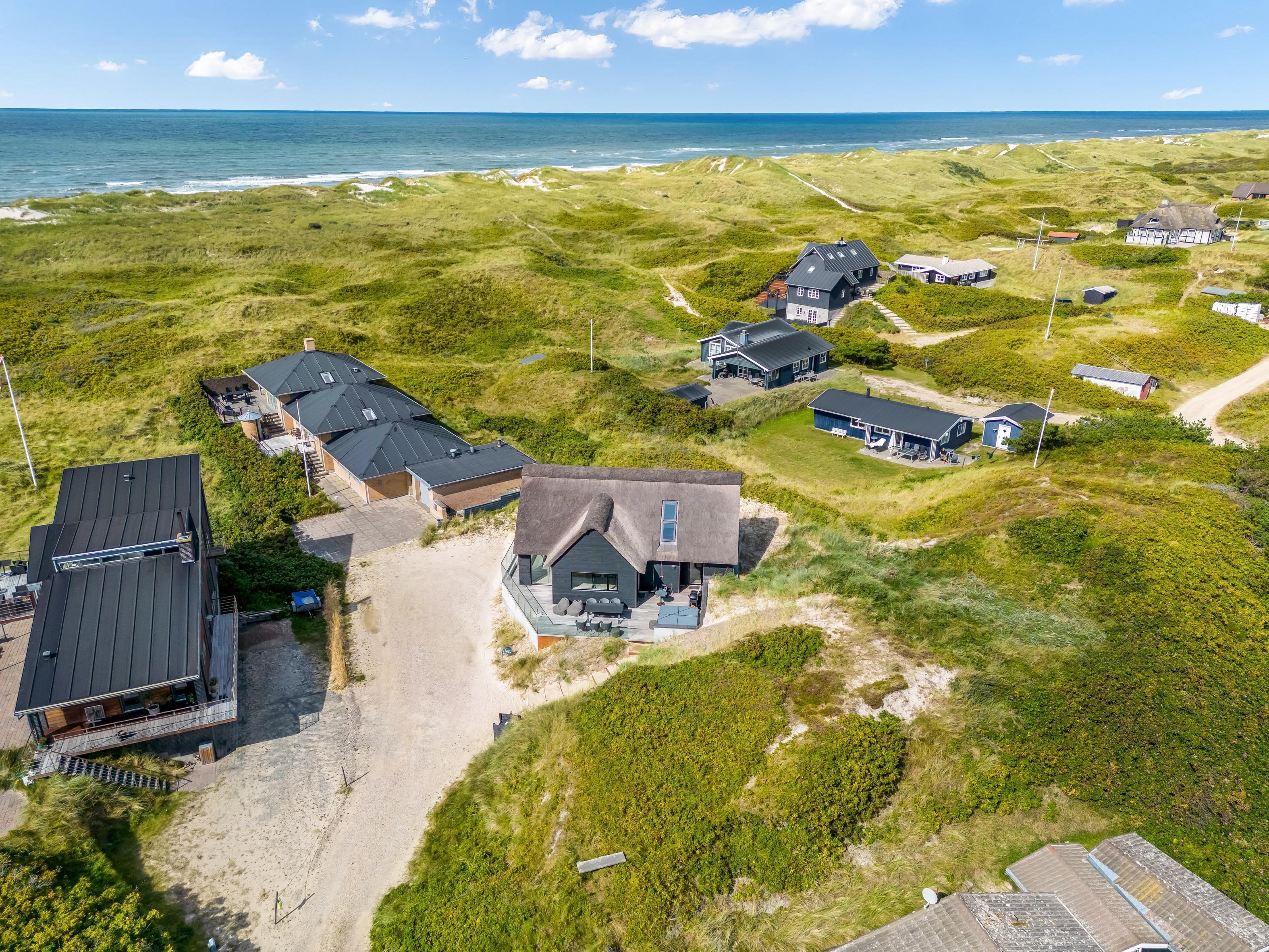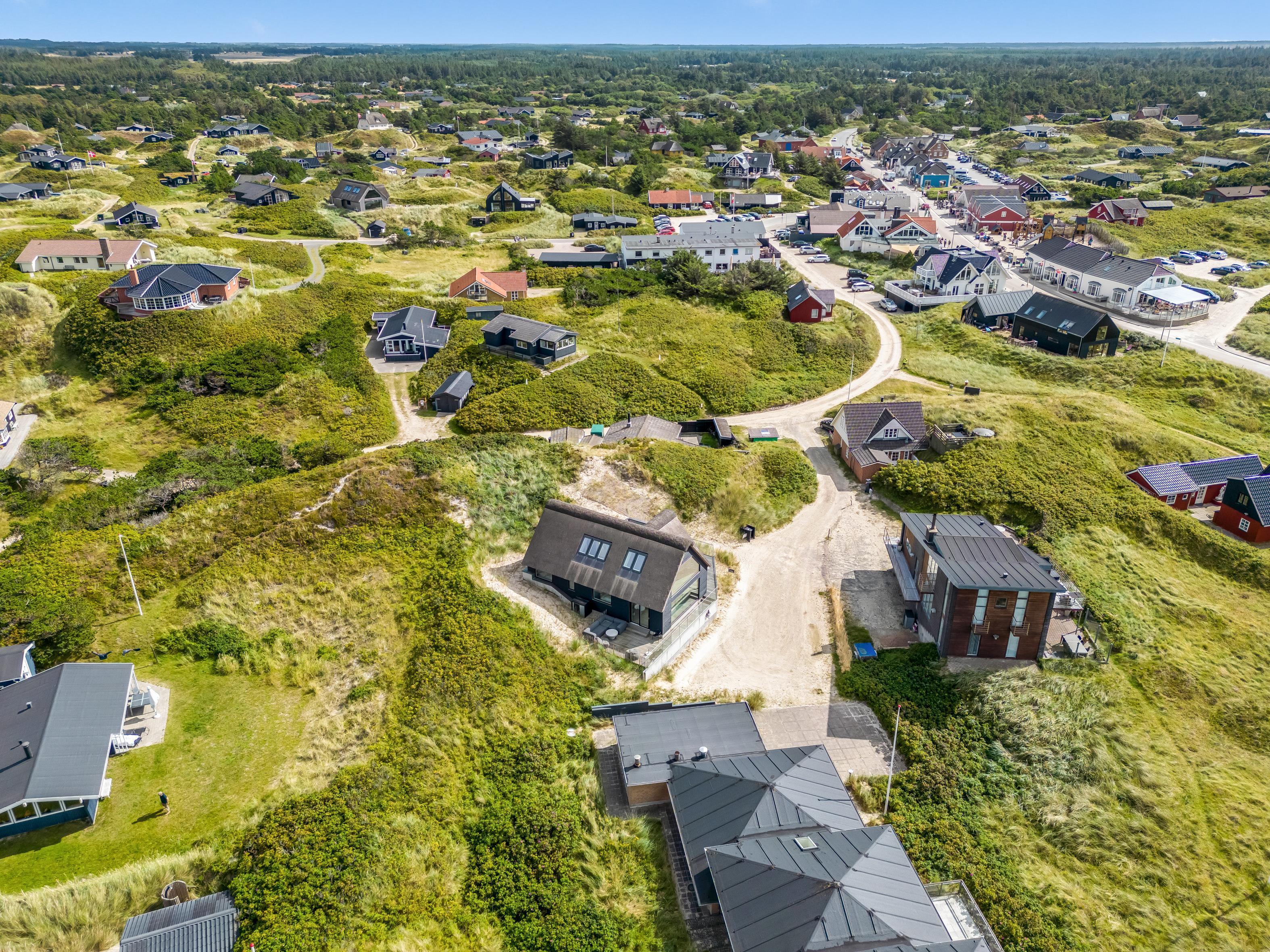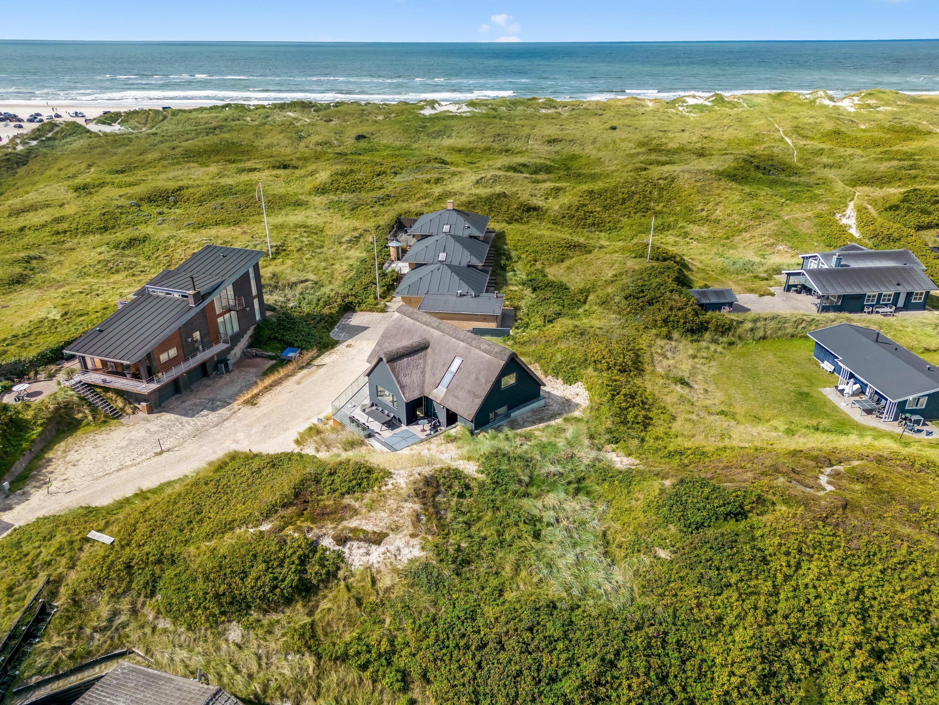 De udvendige faciliteter byder på flotte solnedgange, der kan nydes fra den store omkring liggende træterrasse. Sommerhuset ligger på en klitgrund ca. 100 meter fra stranden samt kort afstand til indkøb og restaurant.