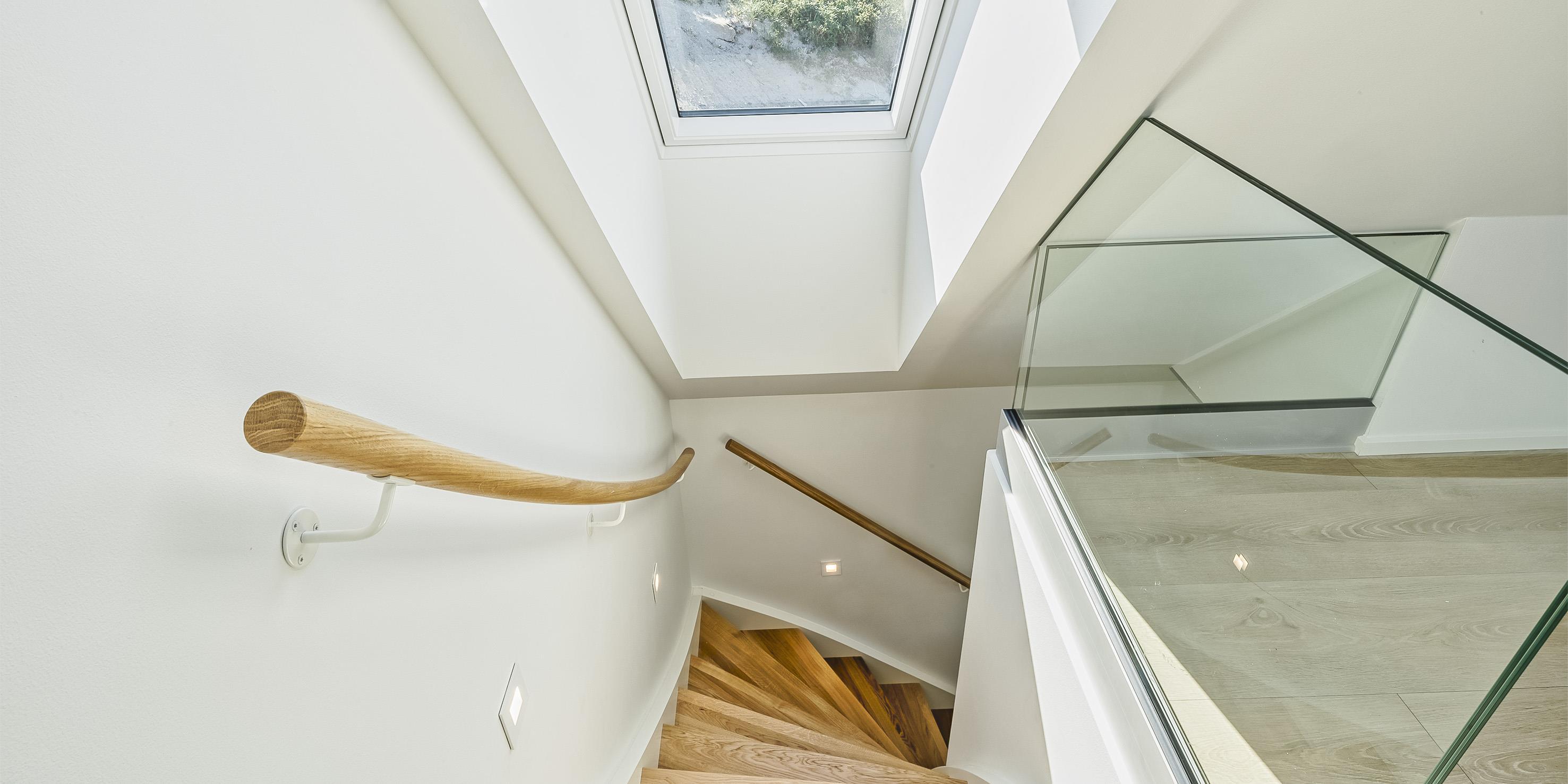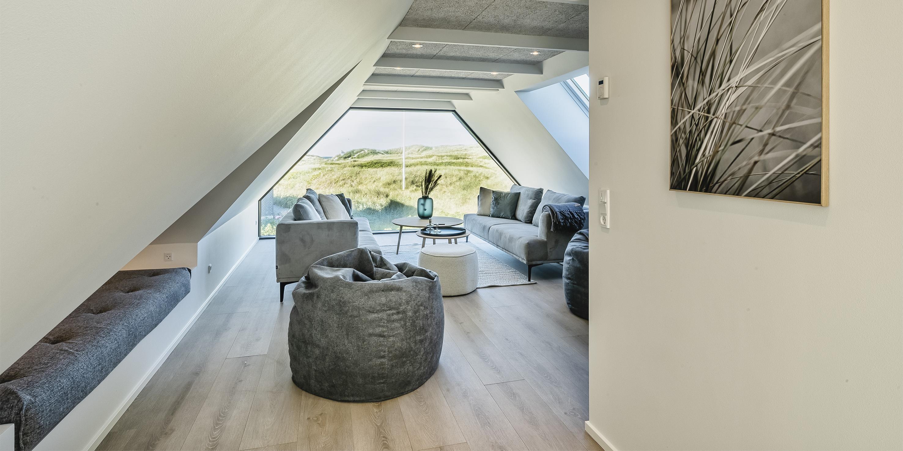 Sommerhuset byder på en skøn atmosfære i en moderne stil og med store panoramavinduer vendt mod havet. Der er hav kig fra første sal.