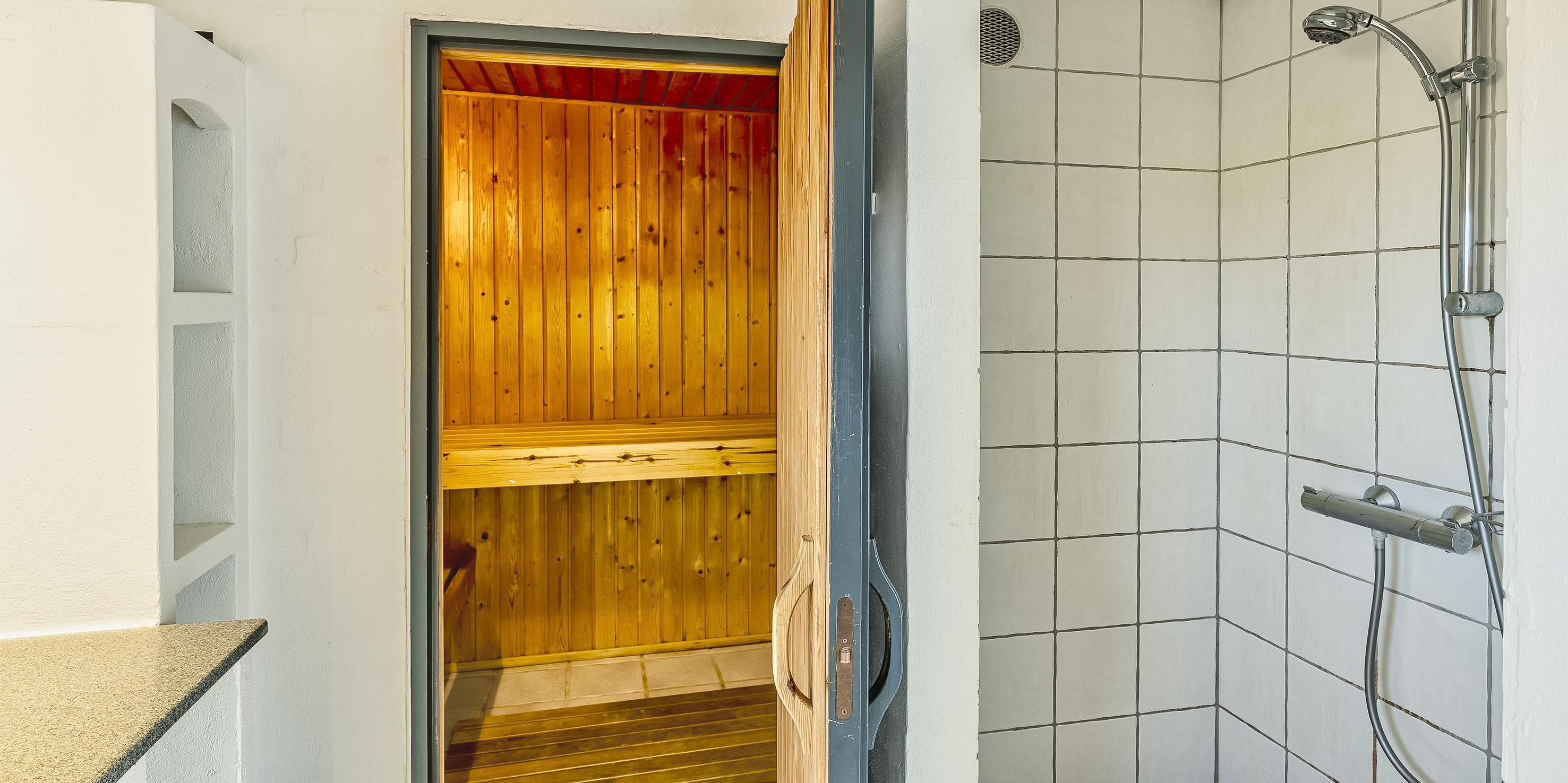 Sommerhuset: Entre med plads til garderoben. Huset råder over 2 dejlige badeværelser med gulvvarme. Det ene badeværelse har desuden tørretumbler og vaskemaskine mens det andet badeværelse er med sauna. Køkken i åben forbindelse med spiseplads og stue. Rummet er lyst og dejligt med et godt lysindfald samt indgang til pool området. Køkkenet fremstår med god komfort såsom opvaskemaskine, mikroovn, keramiske kogeplader, emhætte og 2 køleskabe samt fryseskab på 94 liter. Fra køkkenet er der udgang til terrasse. Dejlig opholdsstue med brændeovn, fjernsyn, radio, CD afspiller, Stofa-sommerhuspakke (4 danske programmer) og trådløs internetadgang. Pool rum med ca. 7,7 x 3 x 1,3 meter ( længde x bredde x dybde)stor pool, gulvvarme, standvandsspa ( til ca. 5 personer) og udgang til terrasse. Huset har i alt 6 soverum. 5 soveværelser med hver 1 dobbeltseng og 1 soveværelse med 2 enkeltsenge (6 soveværelser: DS + DS + DS + DS + DS + 2ES). Huset er børnevenligt i form af 2 gynger og en sandkasse. Terrasserne er flisebelagte. 2 kulgrill forefindes i sommerhalvåret.