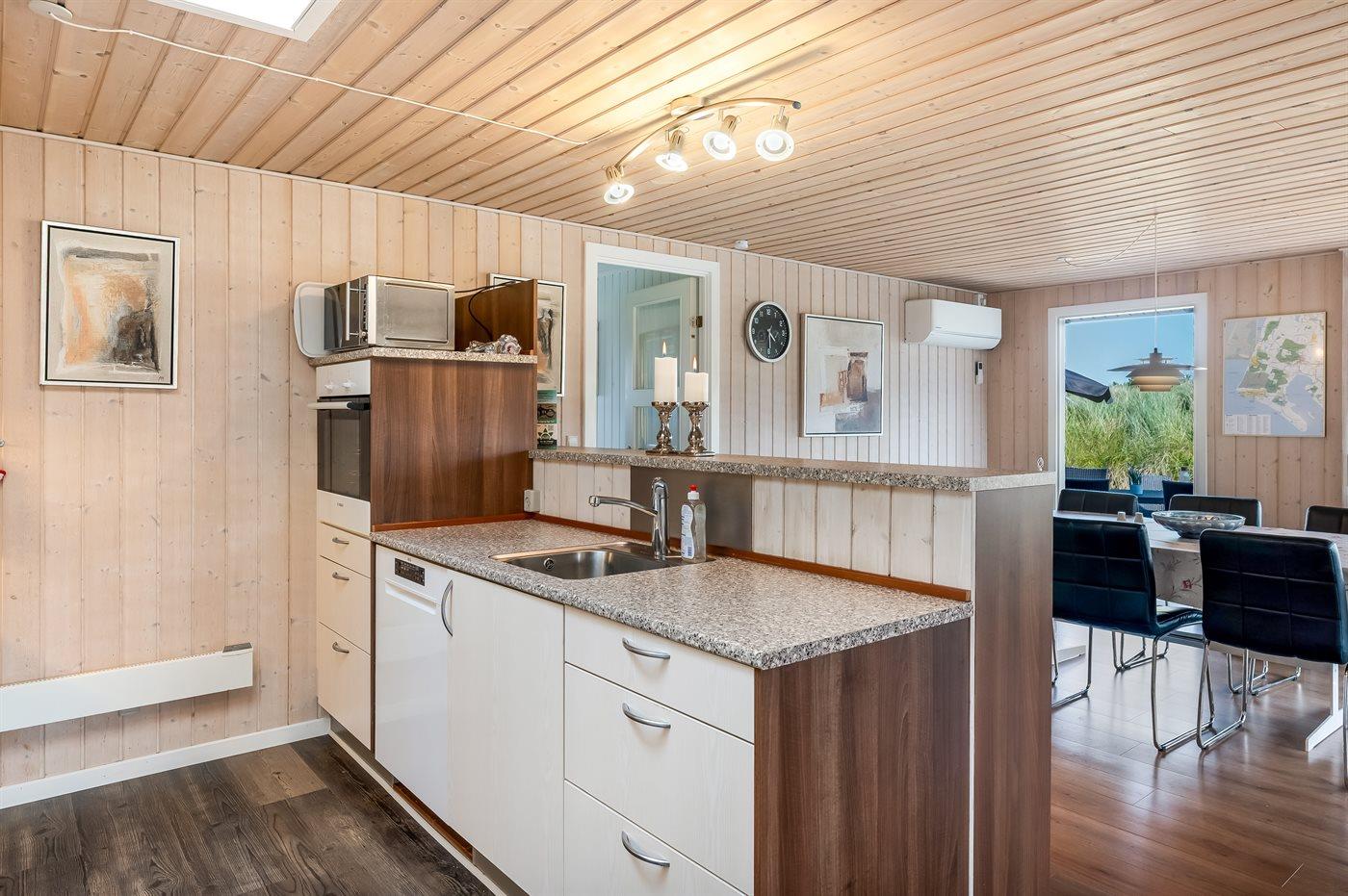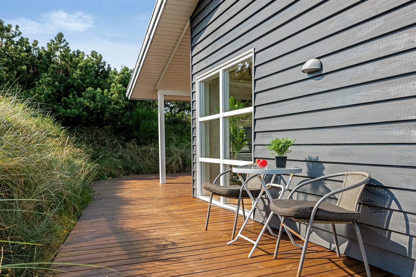 I gåafstand fra en af Danmarks bedste badestrande ligger dette herlige sommerhus i træ, bygget i 1970, renoveret og udvidet i 2009 med bl.a. nyt badeværelse med spa. Huset ligger på en 2800 m2 stor klitgrund og til huset hører stort, delvist overdækket terrasseareal med havemøbler. Flot badeværelse (2009) med opvarmet klinkegulv, bruseniche, 2-pers. spa samt adgang til husets sauna. Ekstra badeværelse med bruseniche. Det dejlige køkken er bl.a. udstyret med opvaskemaskine og mikrobølgeovn. Rummelig opholdsstue med pæne lædermøbler, brændeovn, stereoanlæg med CD-afspiller, DVD-afspiller og 42” fladskærms-TV med parabol (digital). Aktivitetsrum med billard- og bordtennisbord samt dart. Husets sovepladser fordeler sig på 3 værelser, alle med dobbeltseng. Desuden 2 sovepladser på husets hems. Af yderligere udstyr kan gratis ADSL-internetforbindelse (computer medbringes), 1 ekstra TV, Nintendo Wii vaskemaskine og tørretumbler nævnes. Til de mindste feriegæster findes der sandkasse og gynge på grunden. Der findes endvidere et dejligt, stort redskabsrum (9 m2) med god plads til f.eks. cykler. Et skønt sommerhus, som uanset årstid er et godt udgangspunkt for en dejlig ferieoplevelse.