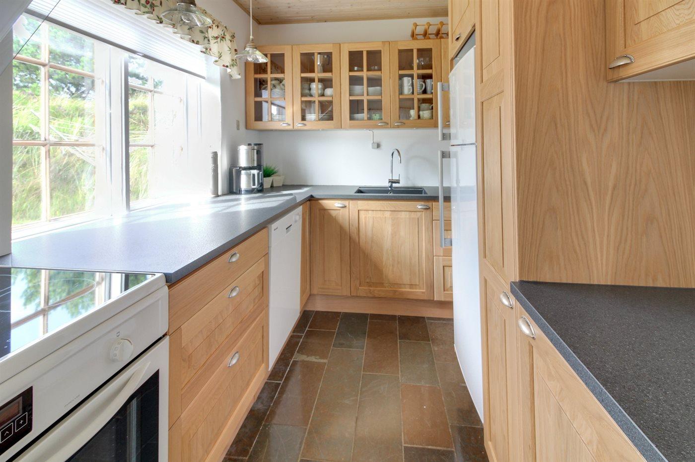 Køkkenet er udstyret med 1 køleskab. Der er 4 induktionskogeplader, varmluftovn, mikrobølgeovn samt opvaskemaskine.