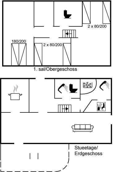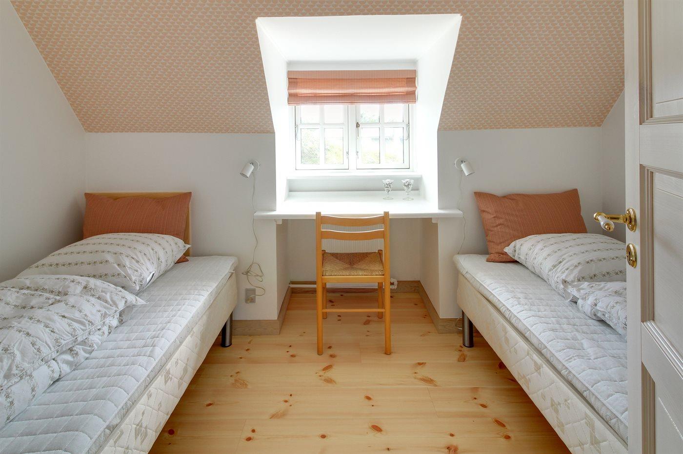 Der er i alt 3 soveværelser. Sovepladserne fordeler sig på: 2 sovepladser i dobbeltseng. 4 sovepladser i enkeltsenge. Derudover er der 1 stk. barneseng.