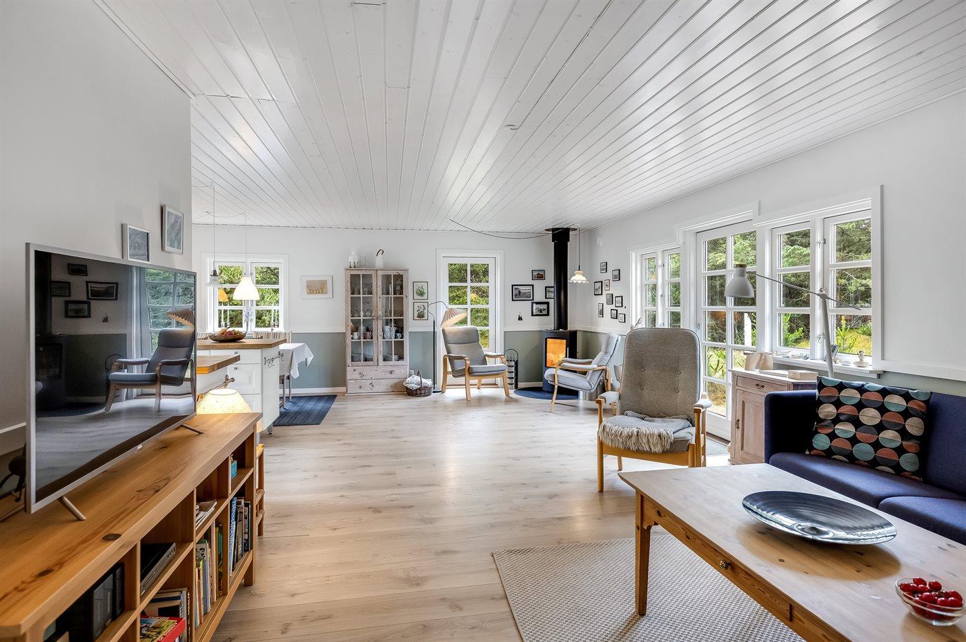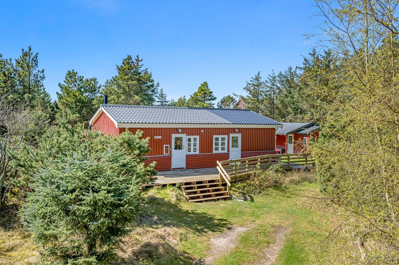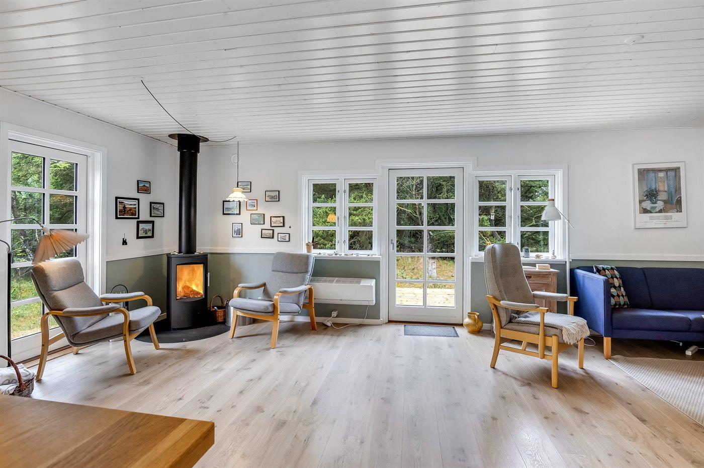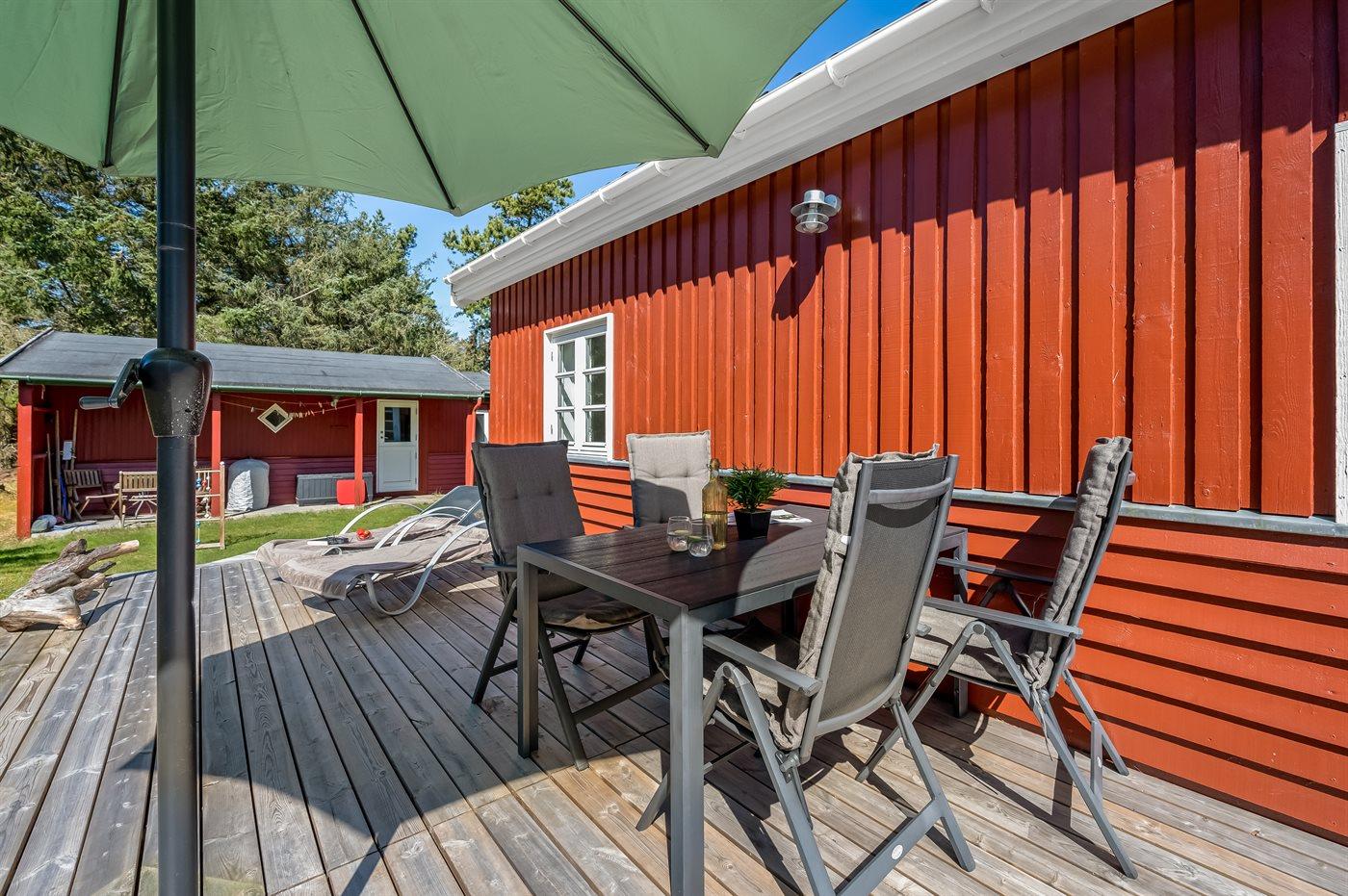 Hyggeligt sommerhus med moderne køkken, brændeovn og stor terrasse i rolige omgivelser nær Vejers Strand.
