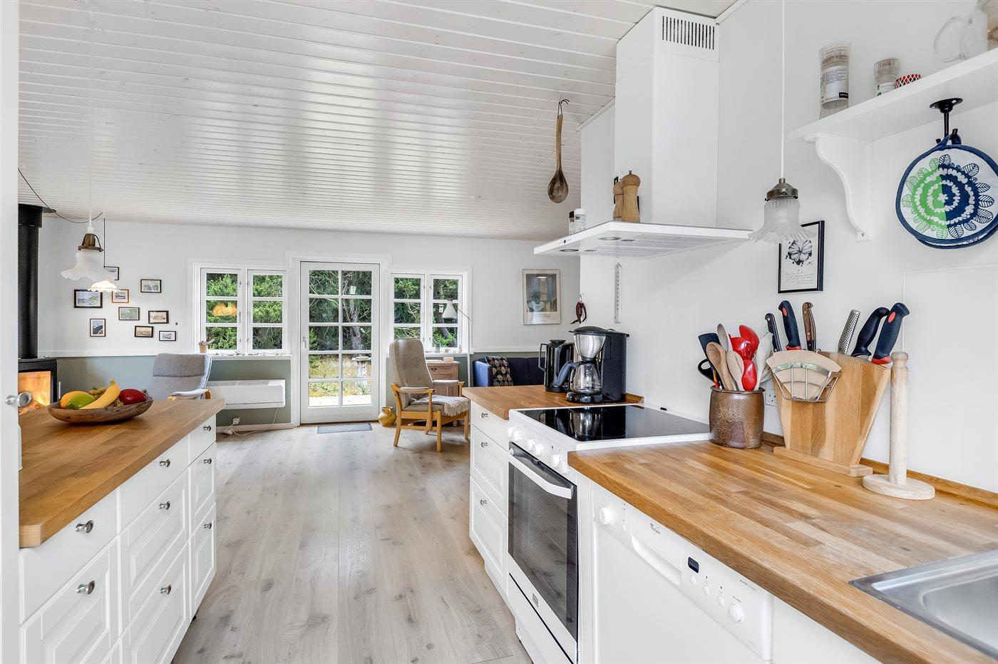 Køkkenet er udstyret med 1 køleskab. Der er 4 keramiske kogeplader, bageovn, varmluftovn samt opvaskemaskine.