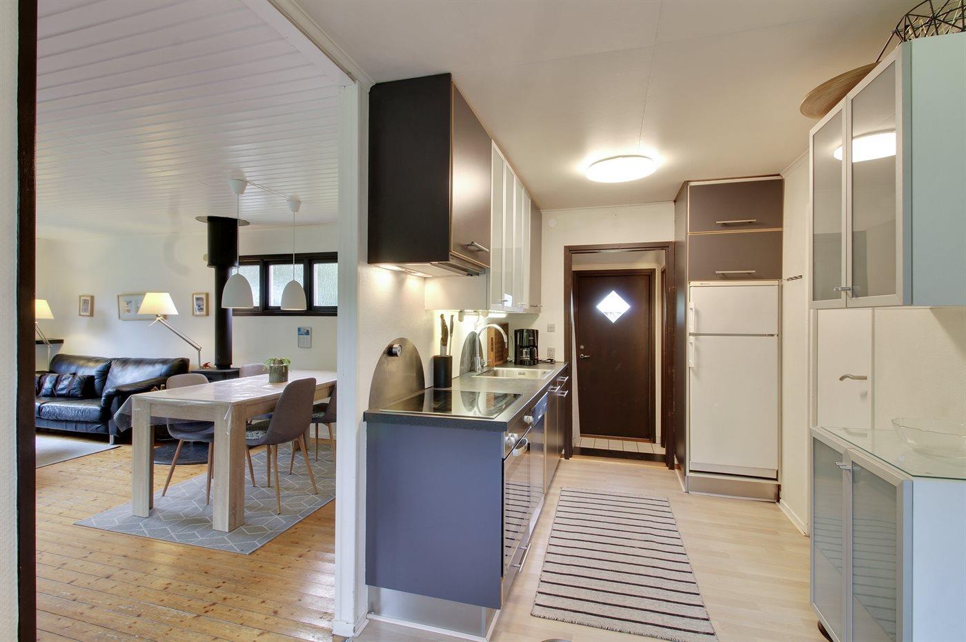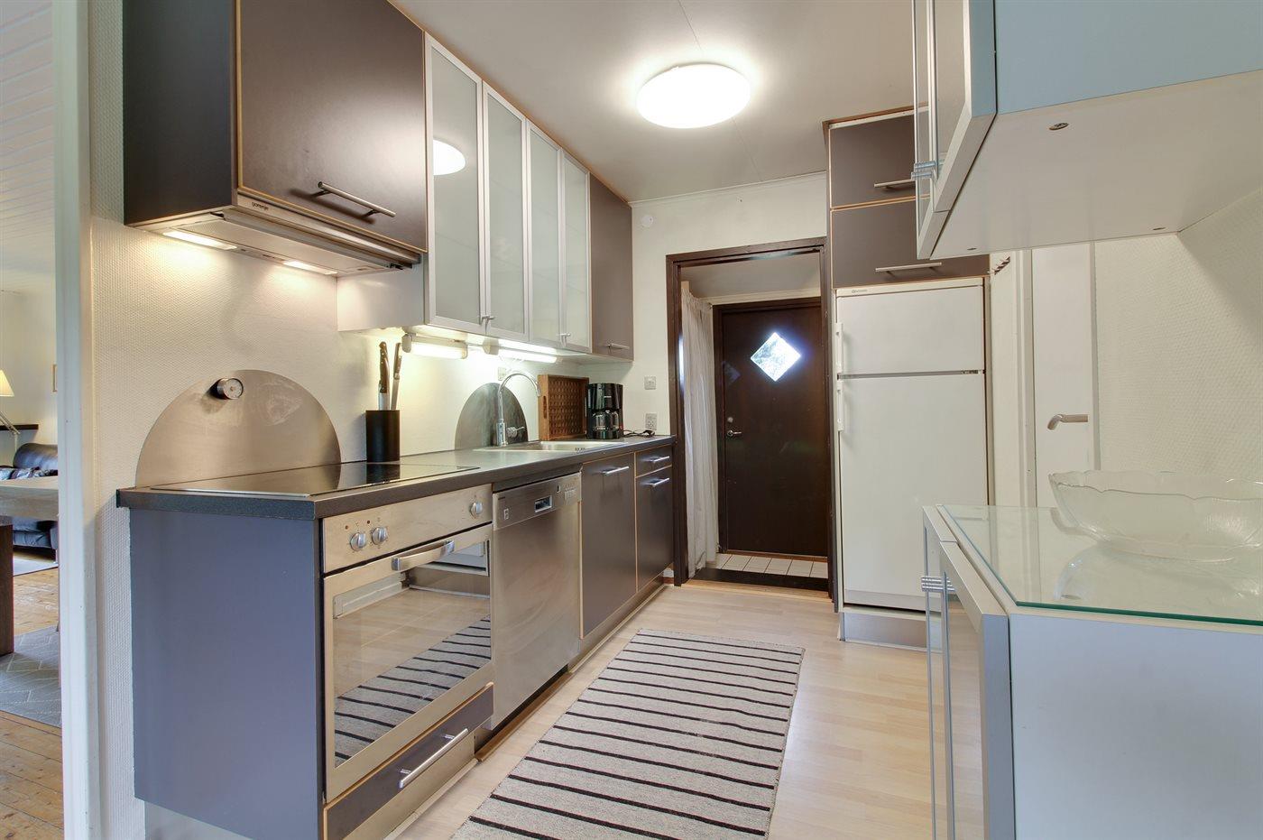 Køkkenet er udstyret med 1 køleskab. Der er 4 keramiske kogeplader, varmluftovn, mikrobølgeovn samt opvaskemaskine.