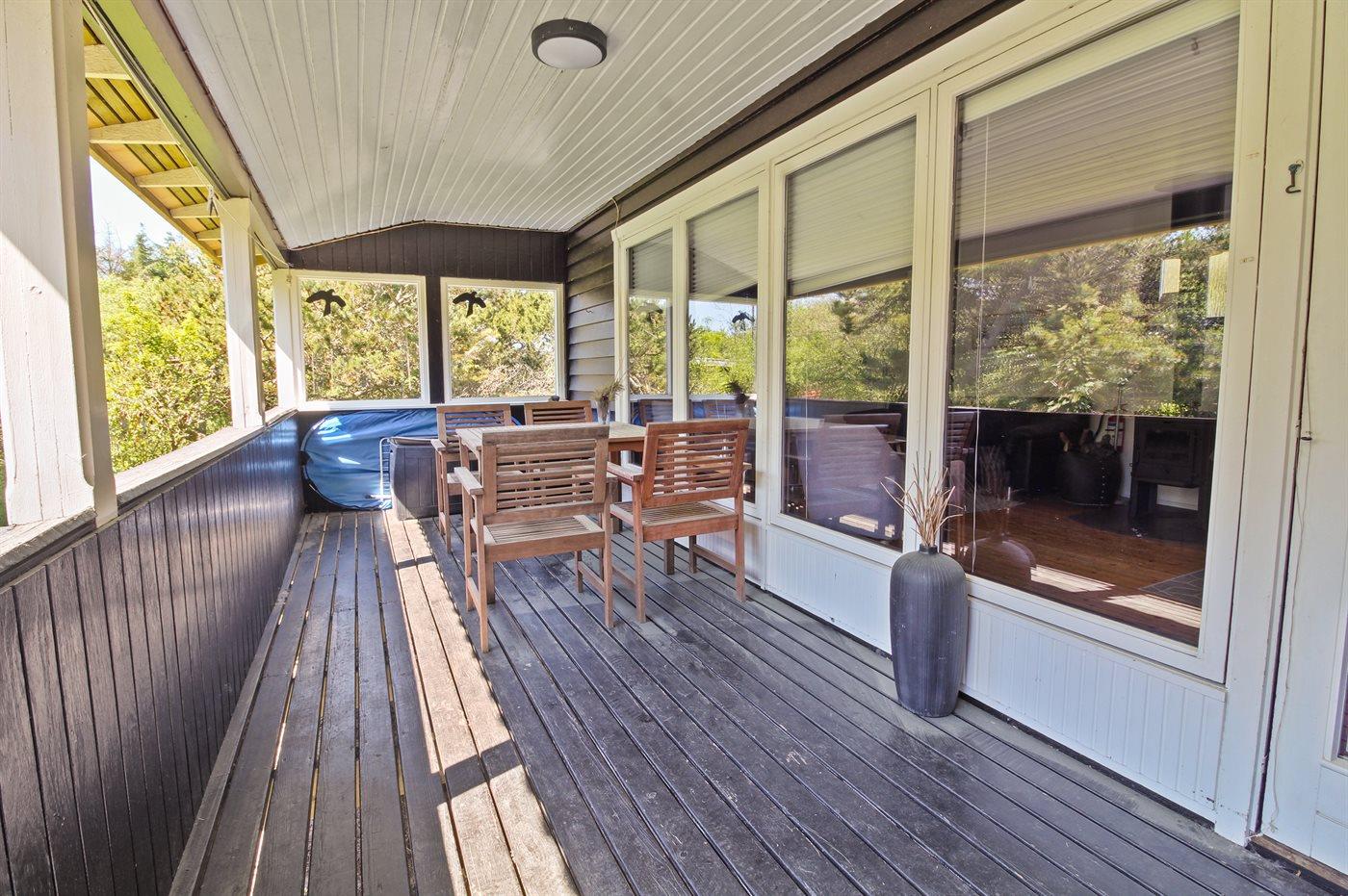 Hyggeligt sommerhus nær strand med overdækket terrasse og naturgrund i Vejers Strand.