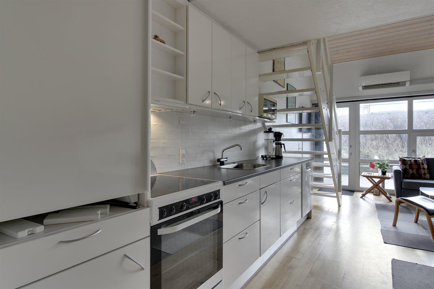 Køkkenet er udstyret med 1 køleskab. Der er 4 keramiske kogeplader, varmluftovn, mikrobølgeovn samt opvaskemaskine.