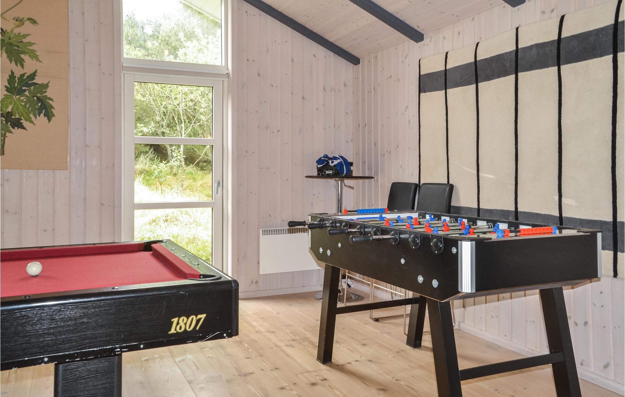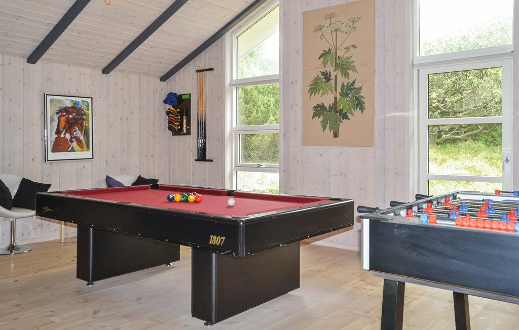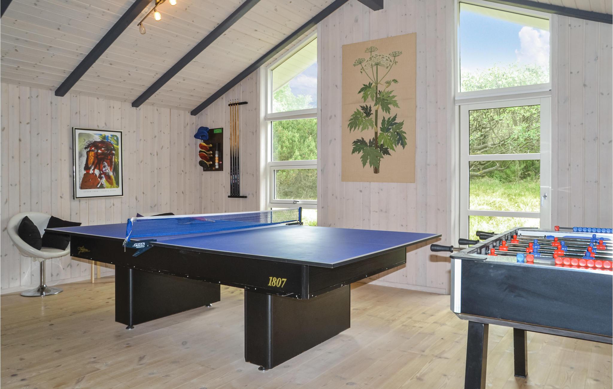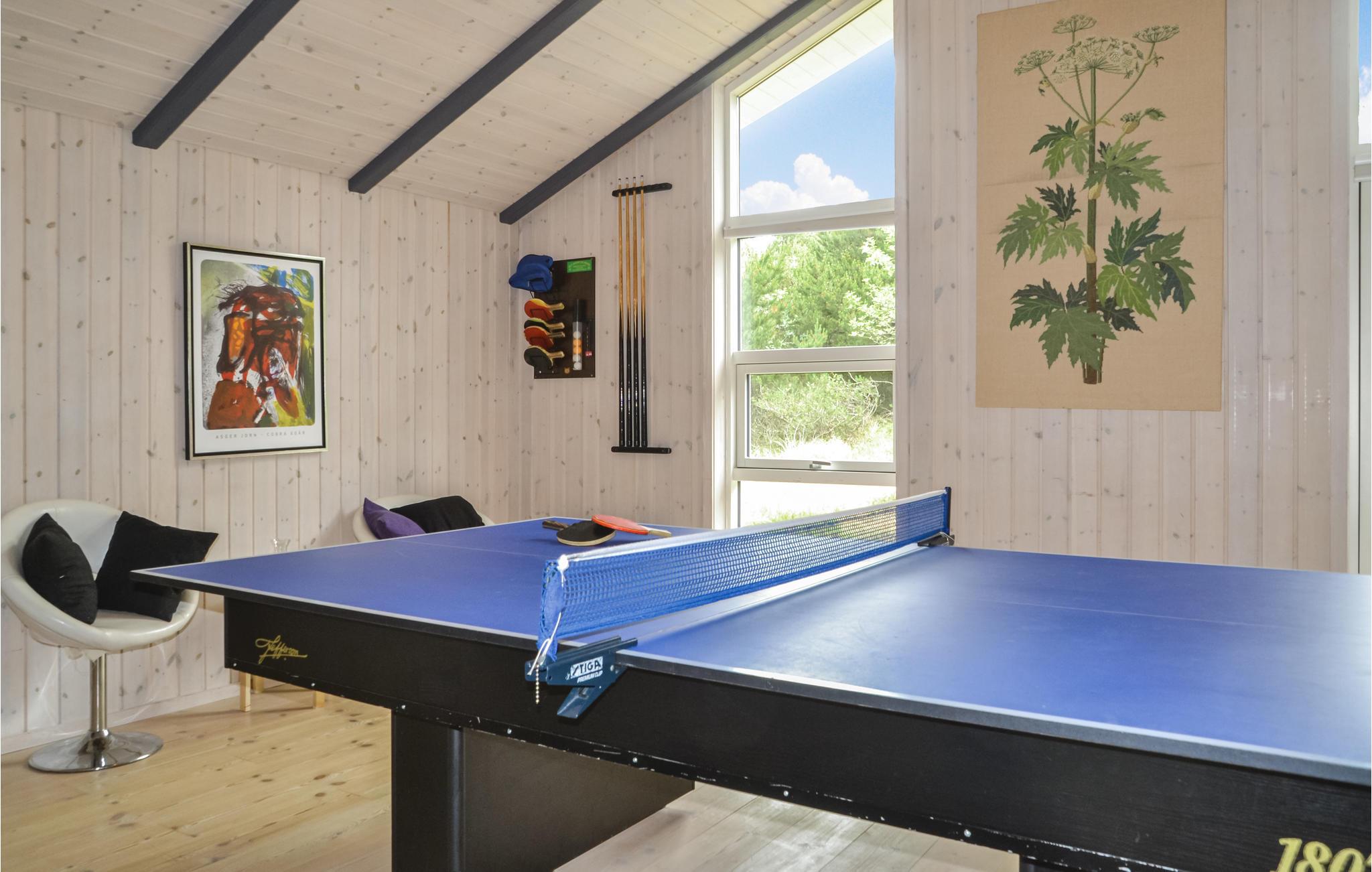 Rigtig hyggelig og velholdt aktivitetssommerhus med bl.a. bordtennis, poolbord og bordfodbold. Sommerhuset er yderst praktisk indrettet med et rummeligt køkken/alrum indeholdende et stort spisebord med plads til alle og en hyggelig sofaafdeling, hvorfra der er adgang til aktivitetsrummet. Alle soveværelser er rummelige og i de største af de to badeværelser findes et spabad og adgang til saunaen. Omkring sommerhuset er der flere gode og læfulde, delvis overdækkede terrasser, og den store naturgrund har en ugenert beliggenhed. På grunden findes desuden trampolin, petanquebane, sandkasse og grill.