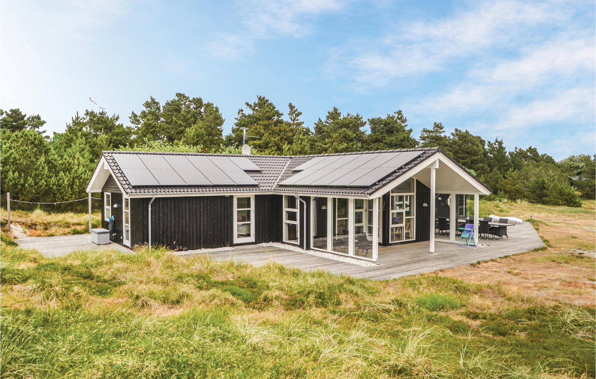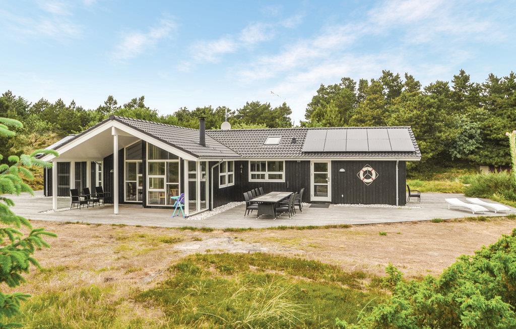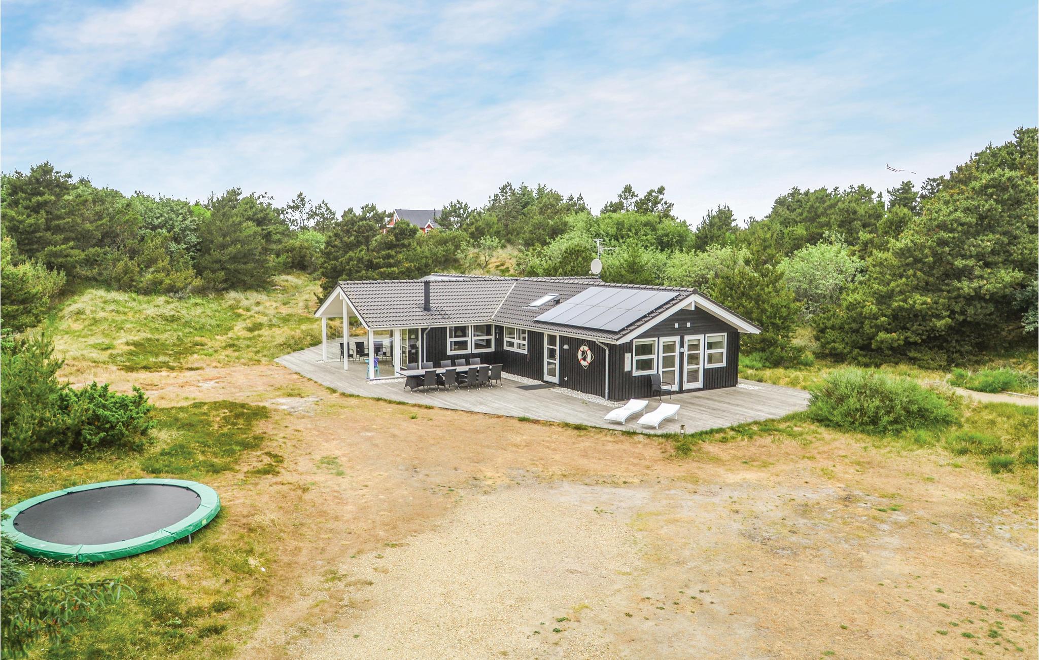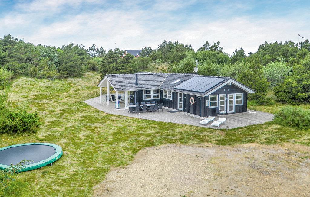 Hyggeligt aktivitetssommerhus nær Vejers Strand med sauna, spabad, aktivitetsrum og store terrasser på en ugenert naturgrund.