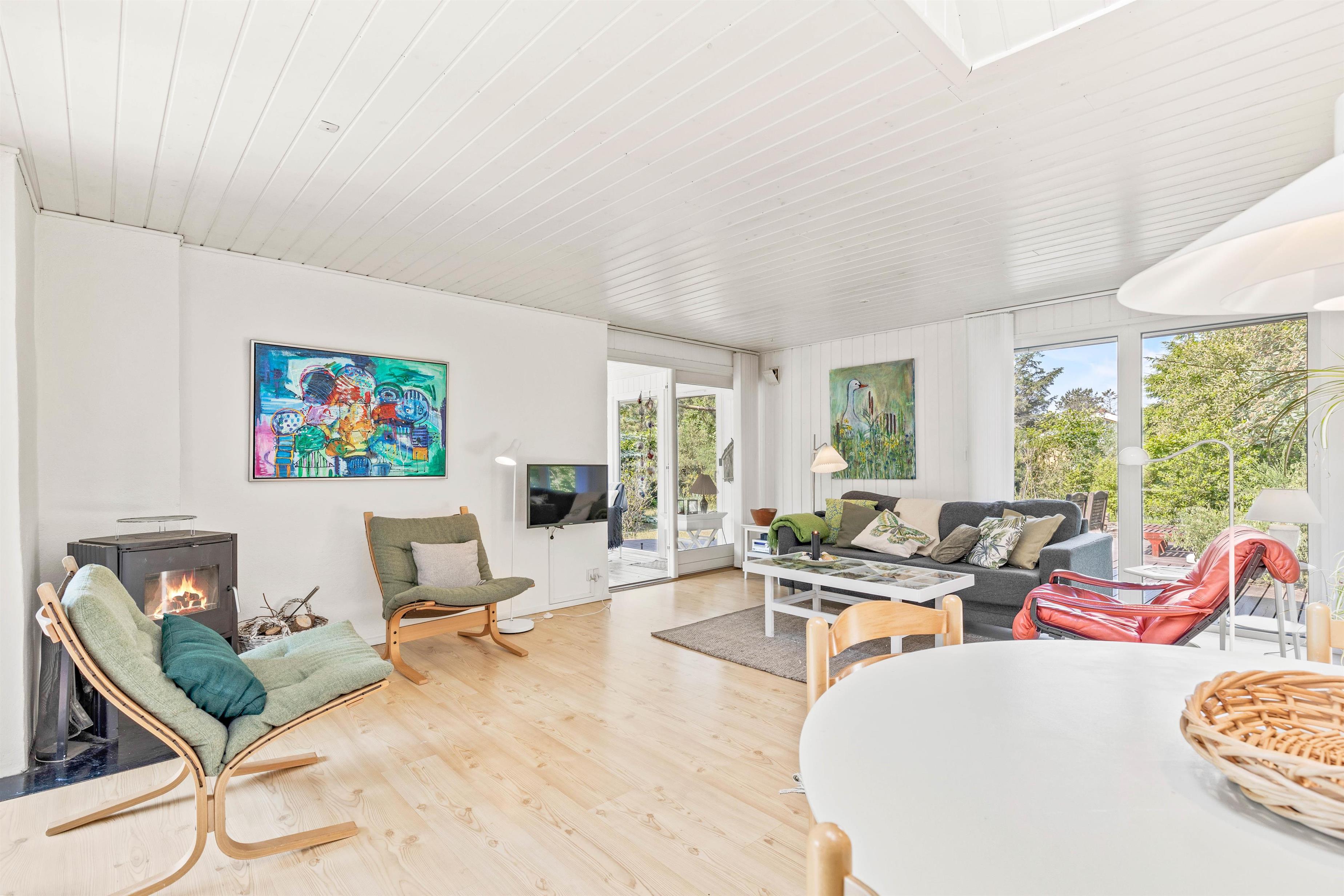 Imens ilden knitrer i brændeovnen og spæder varme og hygge, kan I slappe af i køkken-alrummet, sætte jer til rette i lædersofaen med en god bog eller sammen tilberede et lækkert måltid i det åbne køkken. Fine detaljer som lysskakten over spisebordet giver en dejlig atmosfære.