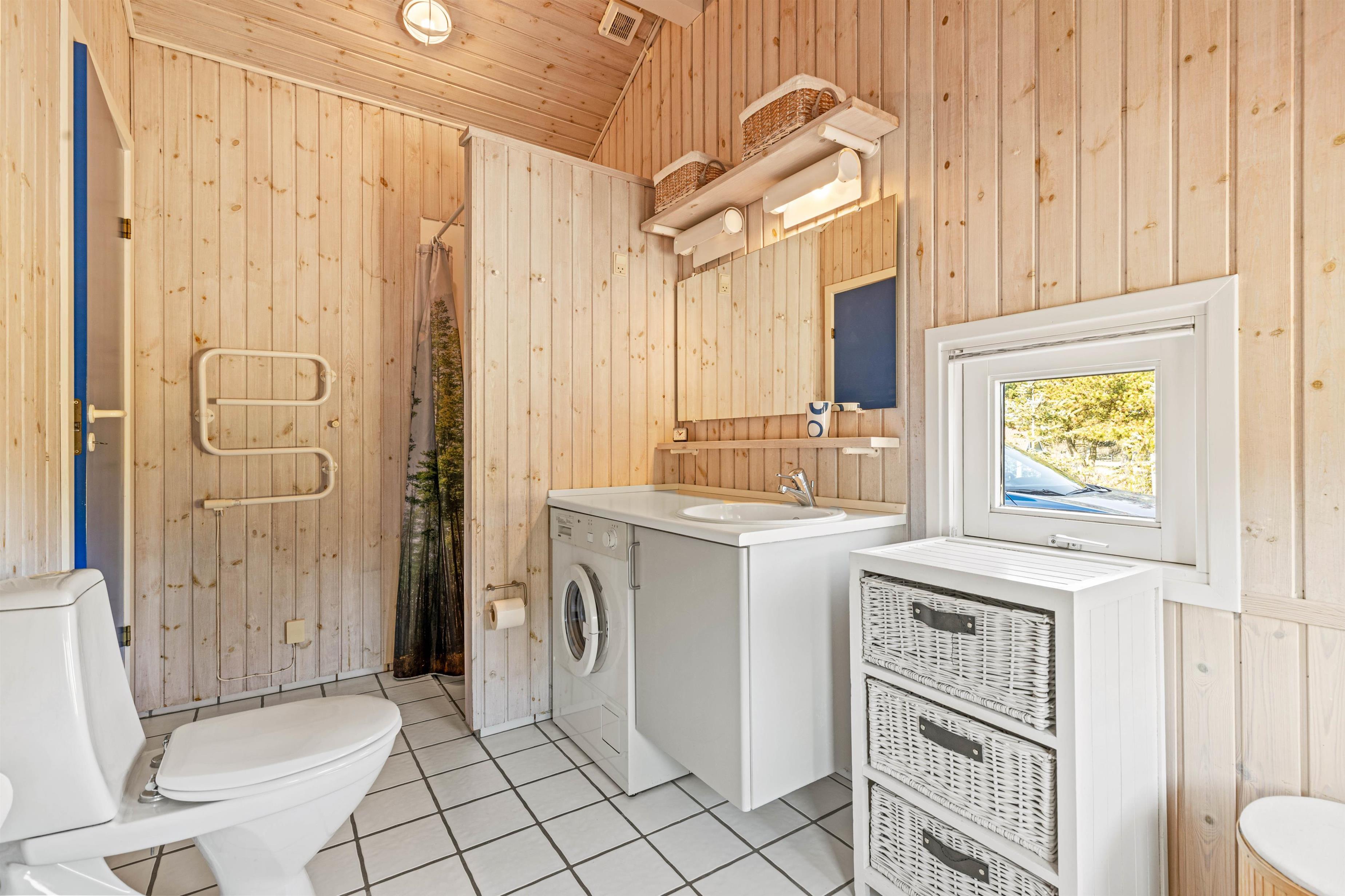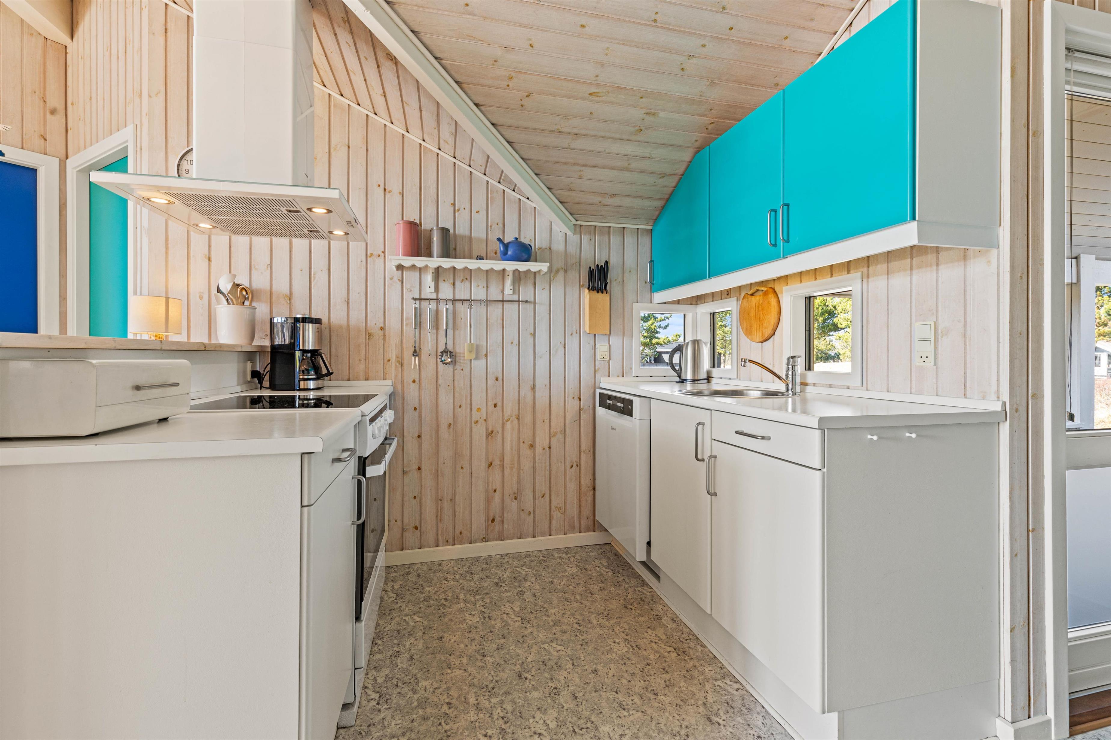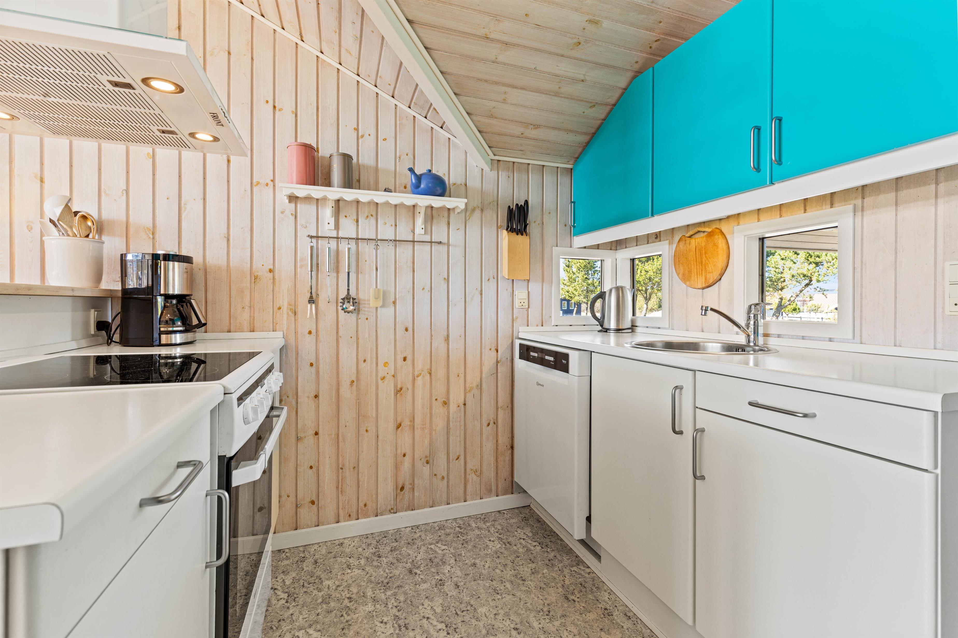 Så der er mere ferietid er husets køkken indrettet med opvaskemaskine. Det er åbent ind til opholdsstuen, hvor der er god plads til familiehygge rundt om det store spisebord. For ekstra hyggestemning, især i den kolde årstid sørger husets brændeovn, der er centralt placeret. På regnvejrsdage kan I hygge med oplæsning for børnene eller tag en lille ”morfar” i stuens lille alkove og efter en lang gåtur ved stranden med frisk vestvind, kan I tænde op i husets sauna og lade jer varme rigtigt igennem.