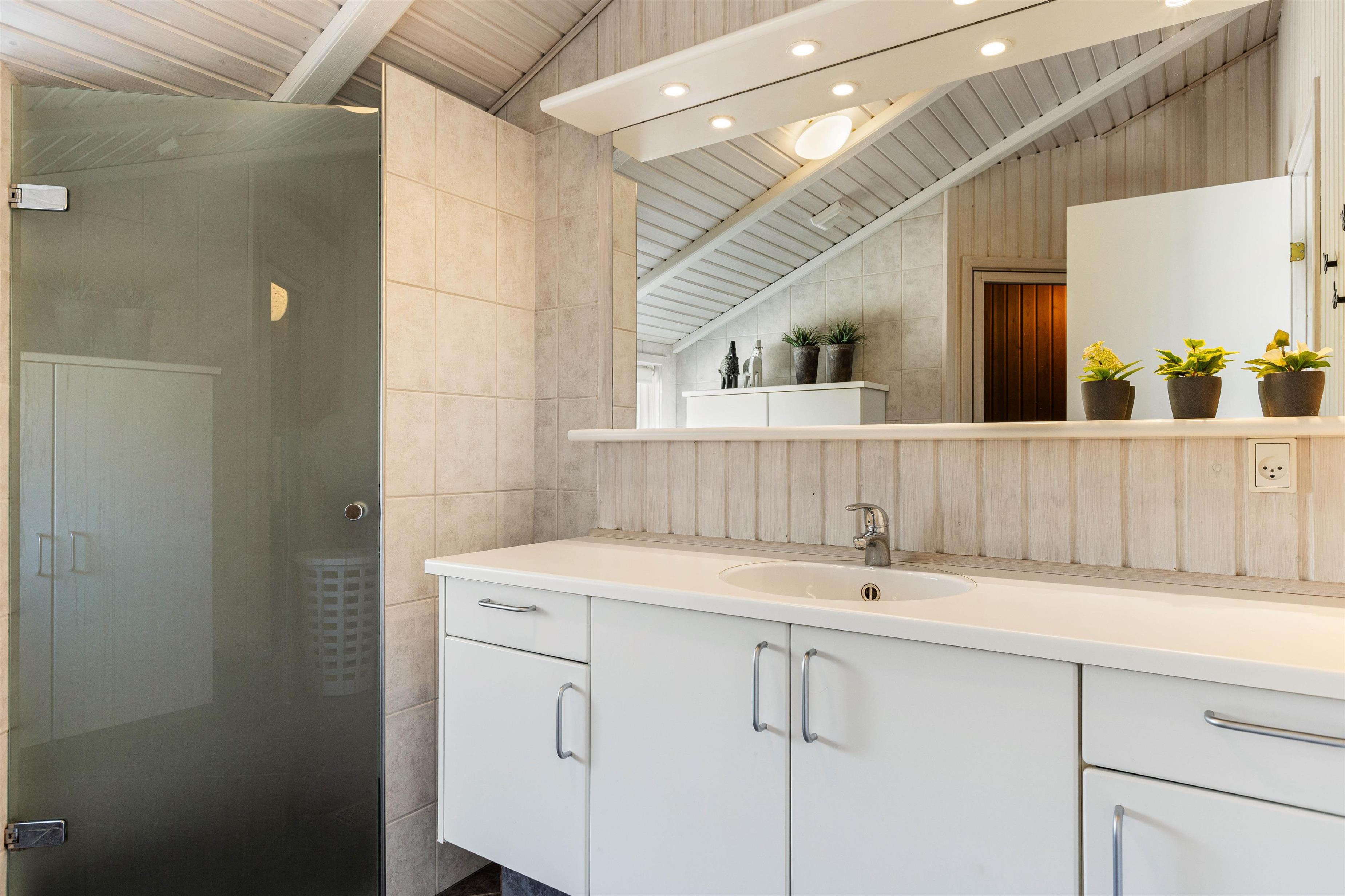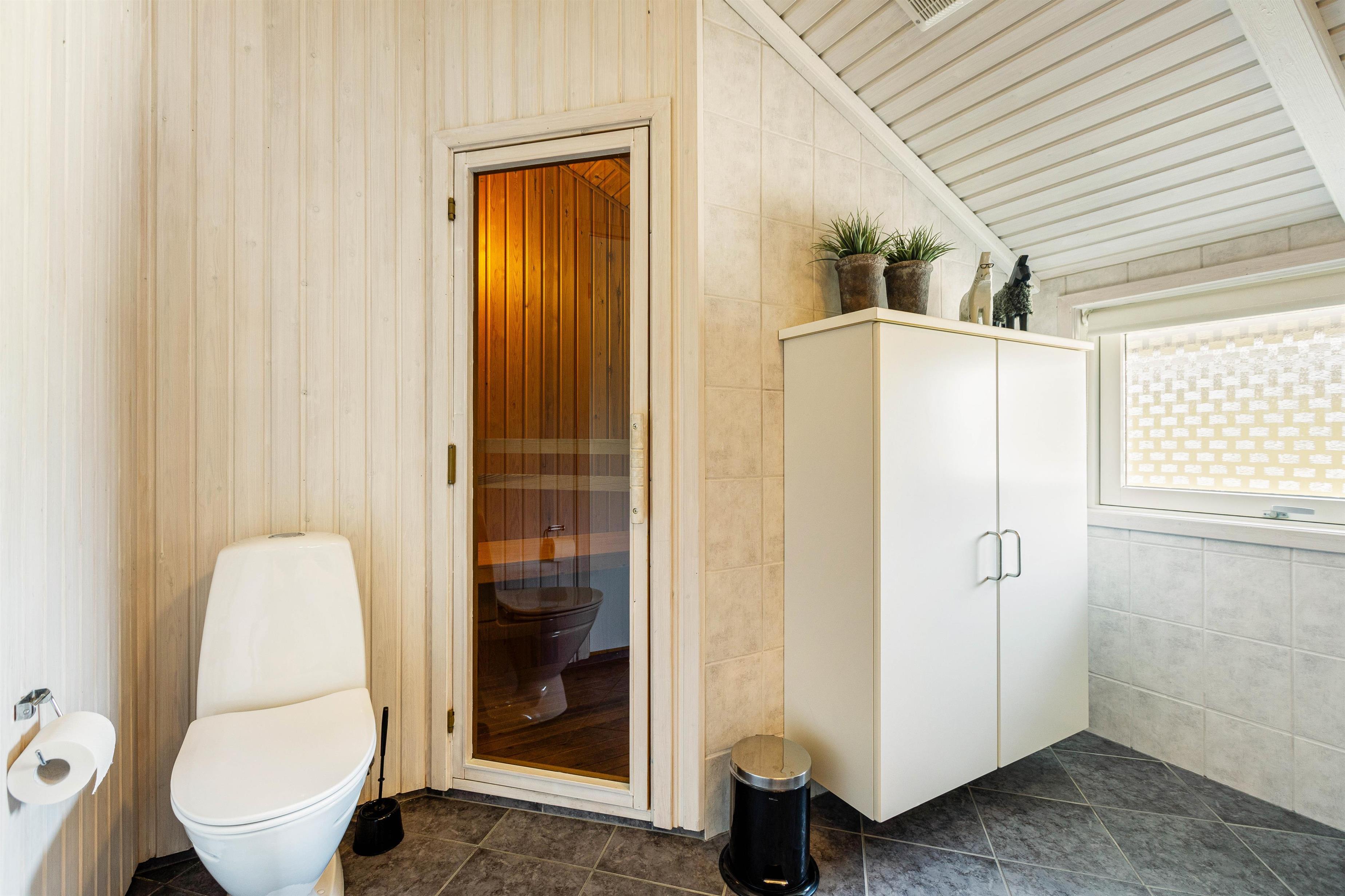 I får et stort badeværelse og yderligere et gæstetoilet, begge med gulvvarme. Fra badeværelset er der desuden adgang til husets skønne sauna, som helt sikkert vil blive et hit blandt de wellnessglade gæster.