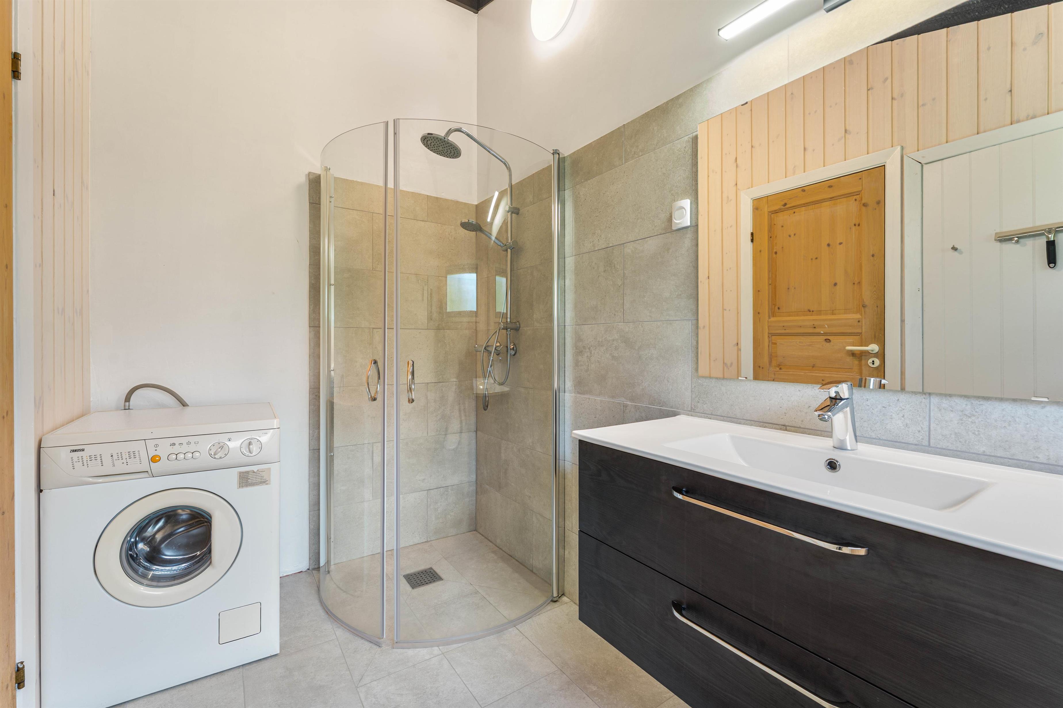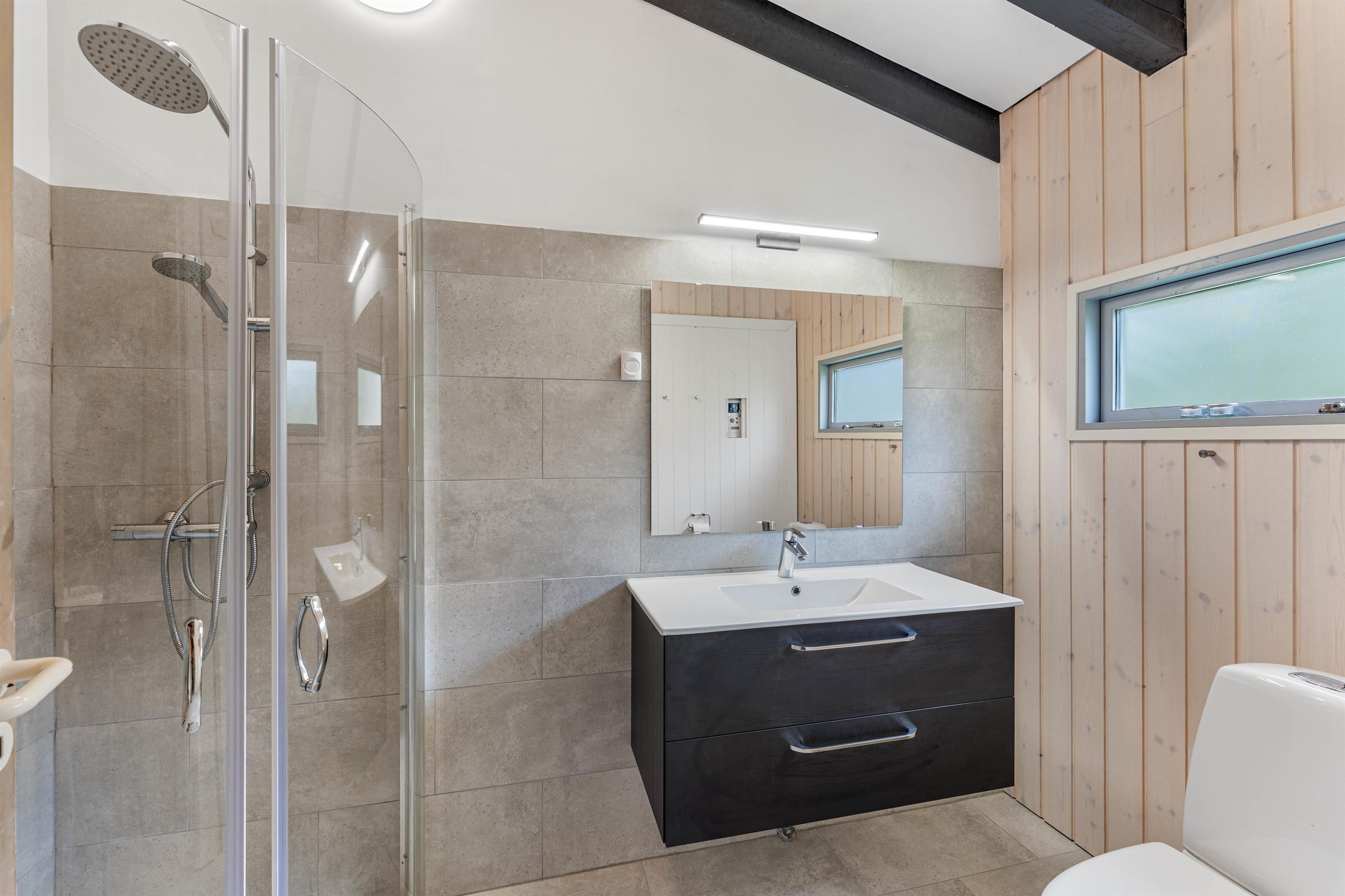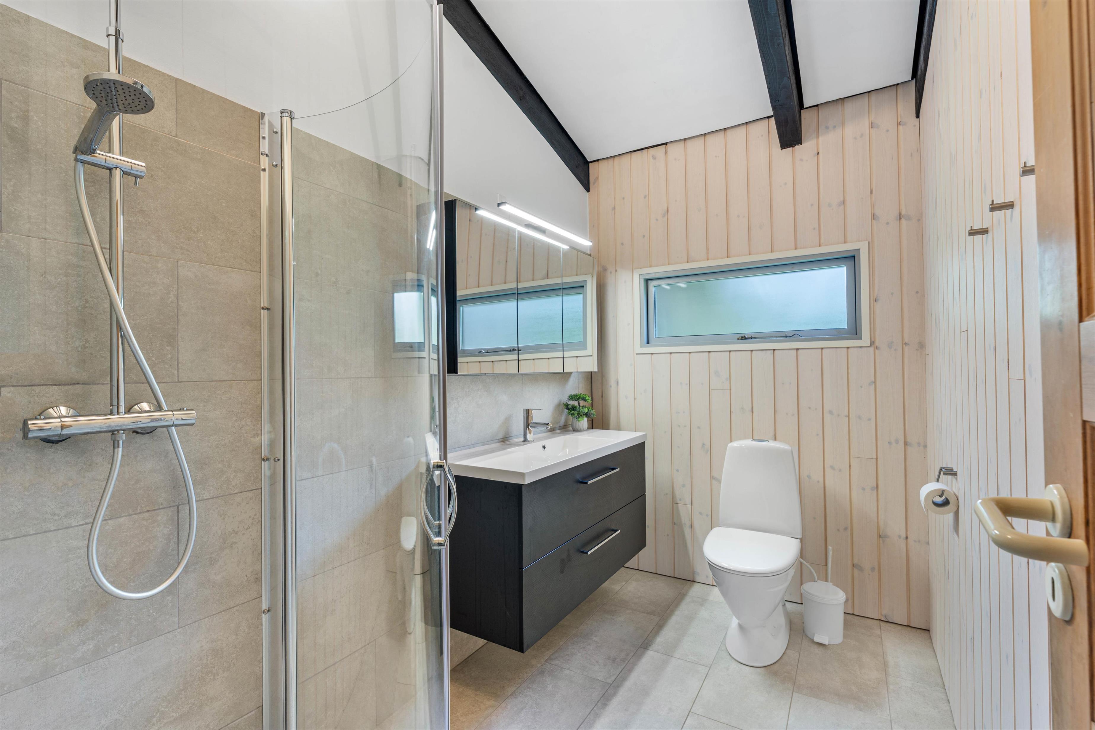 Huset er udstyret med et badeværelse og et gæstetoilet - begge med gulvvarme -, og på badeværelset finder I også husets absolutte highlight.