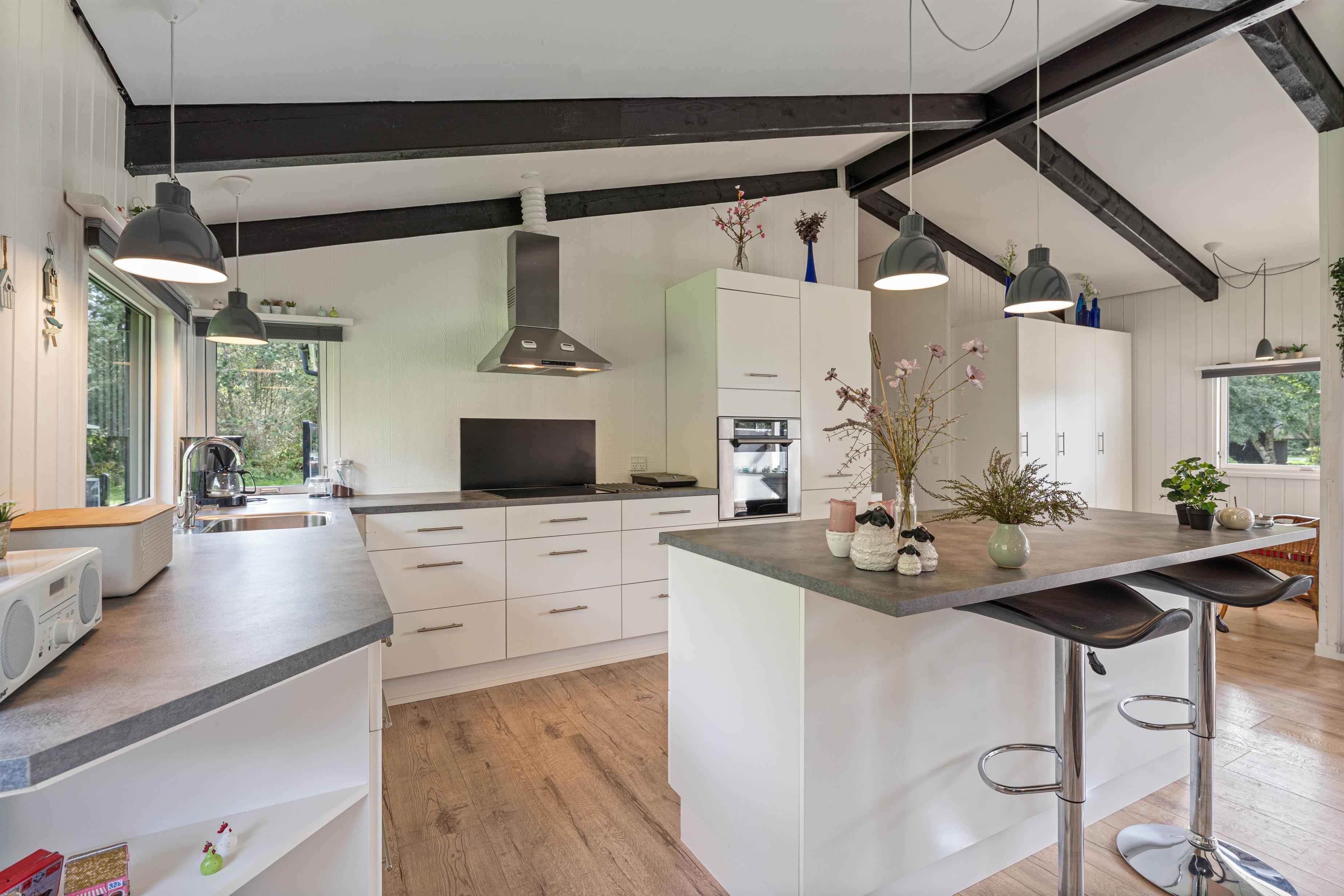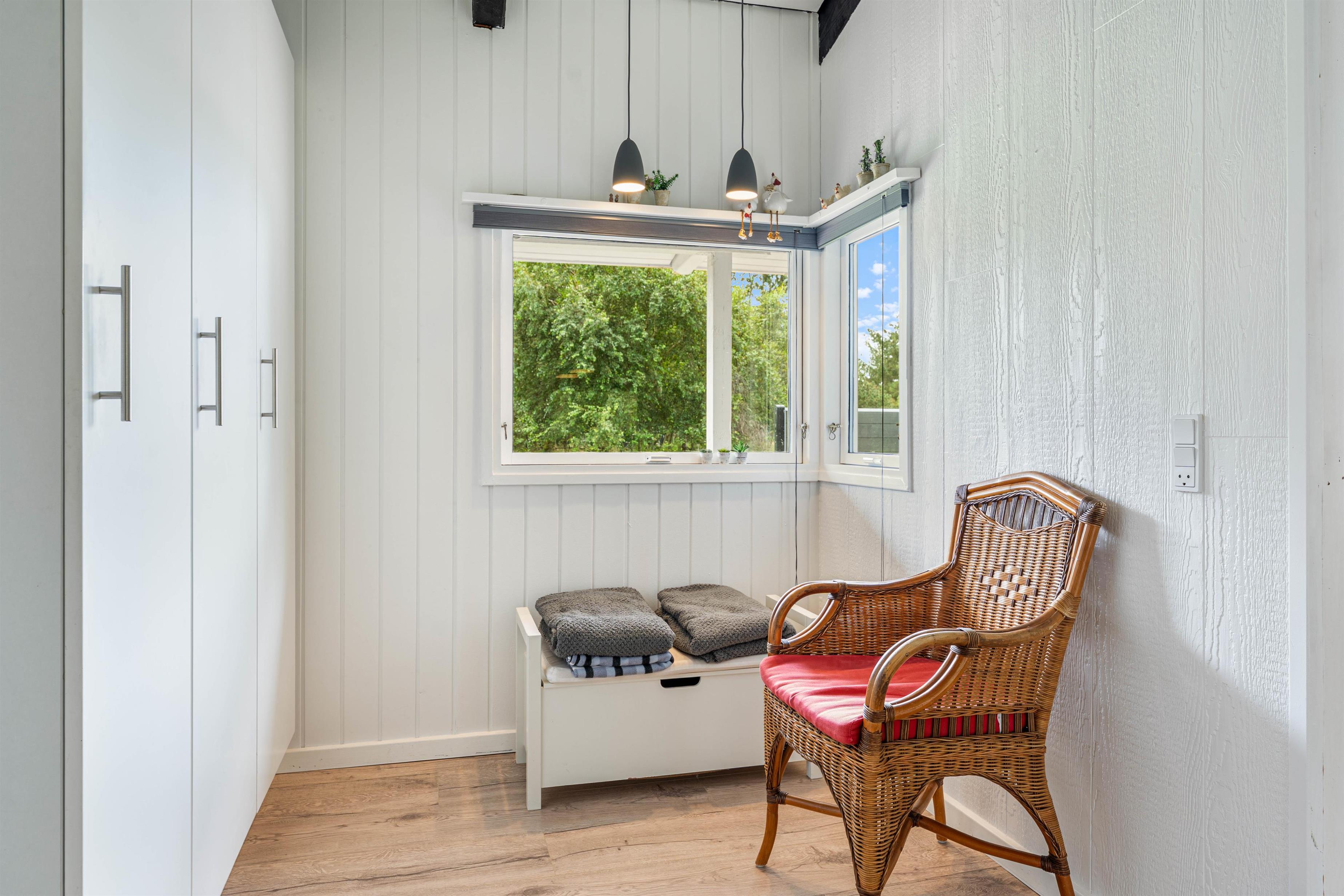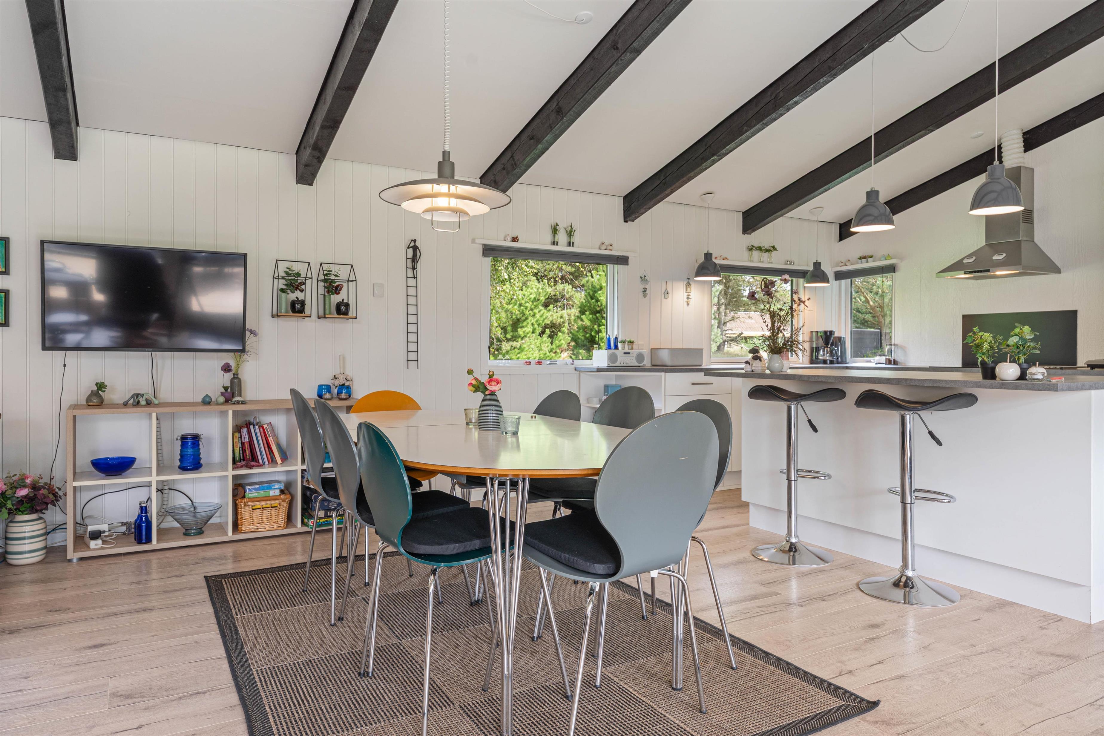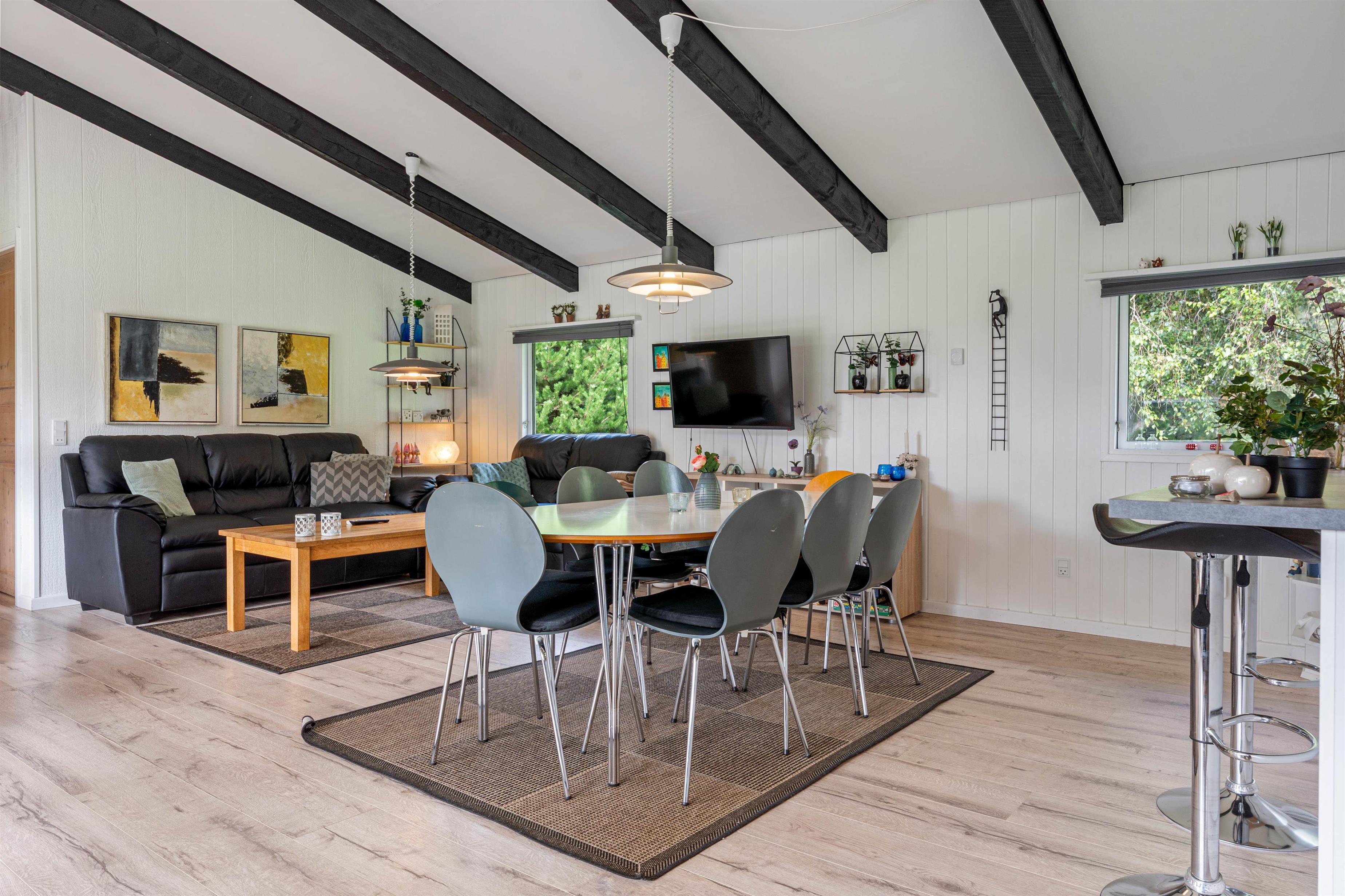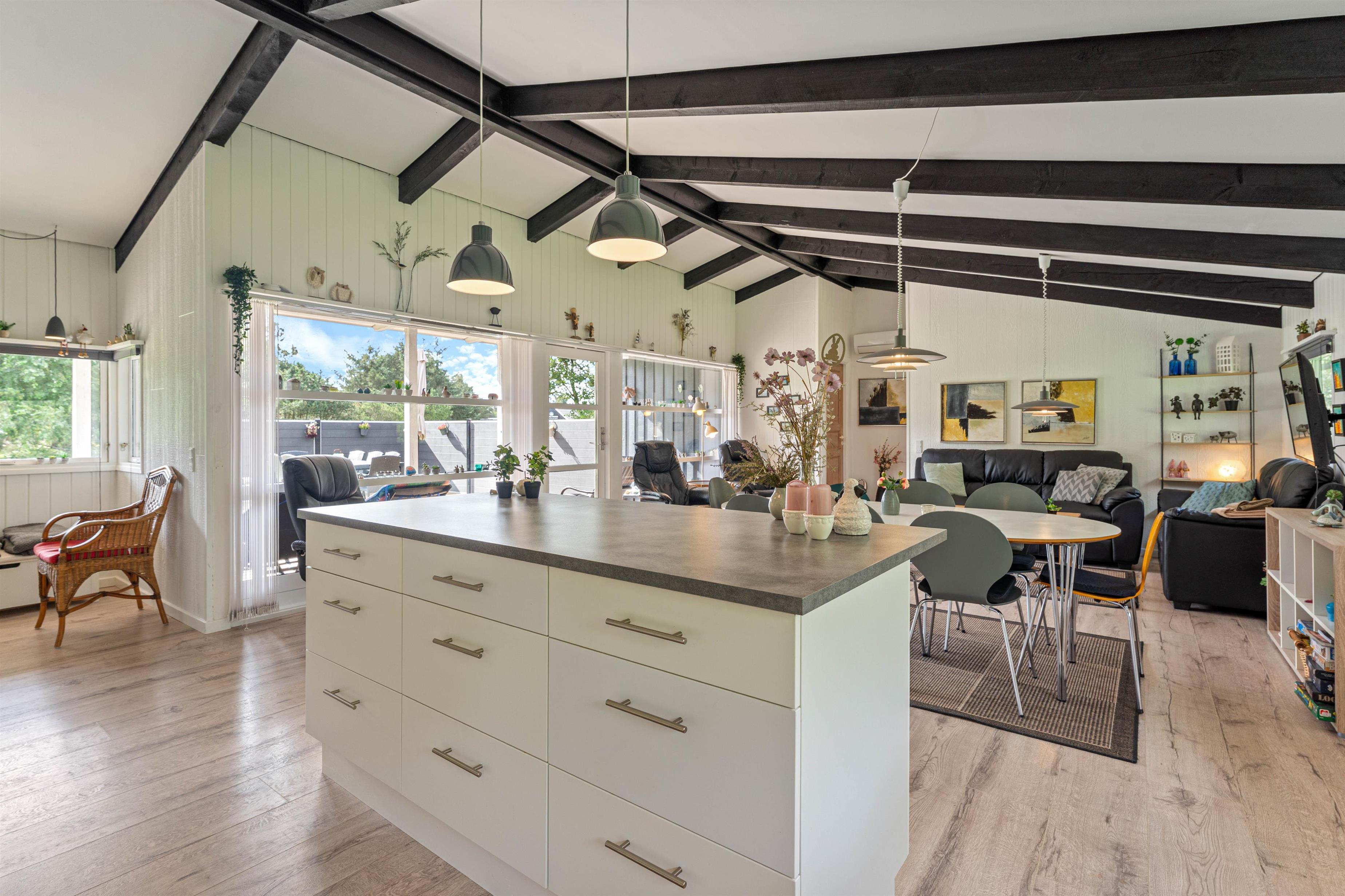 Det fine sommerhus på Snogevej 8 byder på 115 velindrettede kvadratmeter. Lyse farver på vægge og lofter skaber en imødekommende atmosfære, og de synlige loftsbjælker og små pyntedetaljer tilfører ekstra sommerhuscharme til huset, som i 2017 gennemgik en renovering.