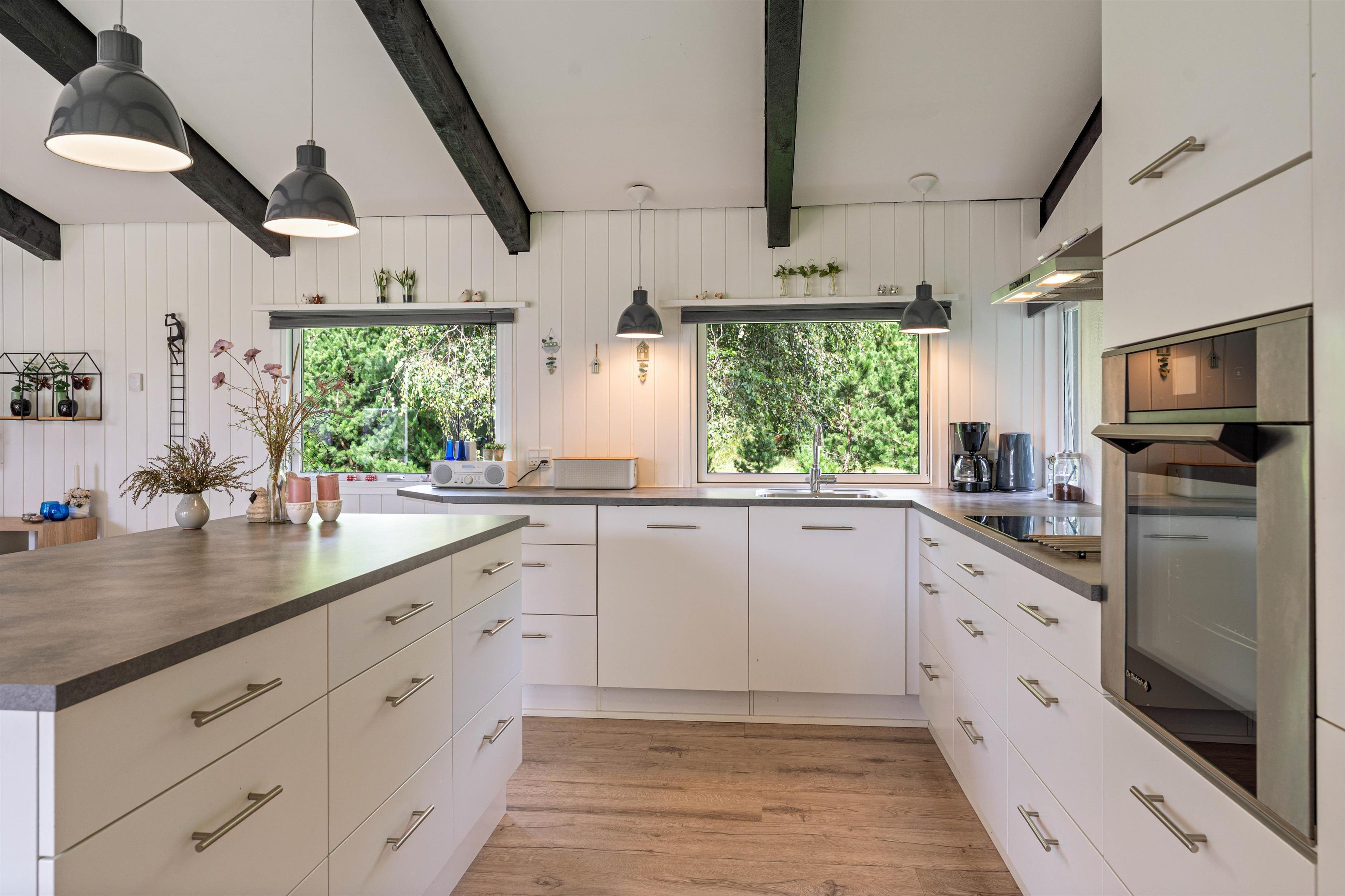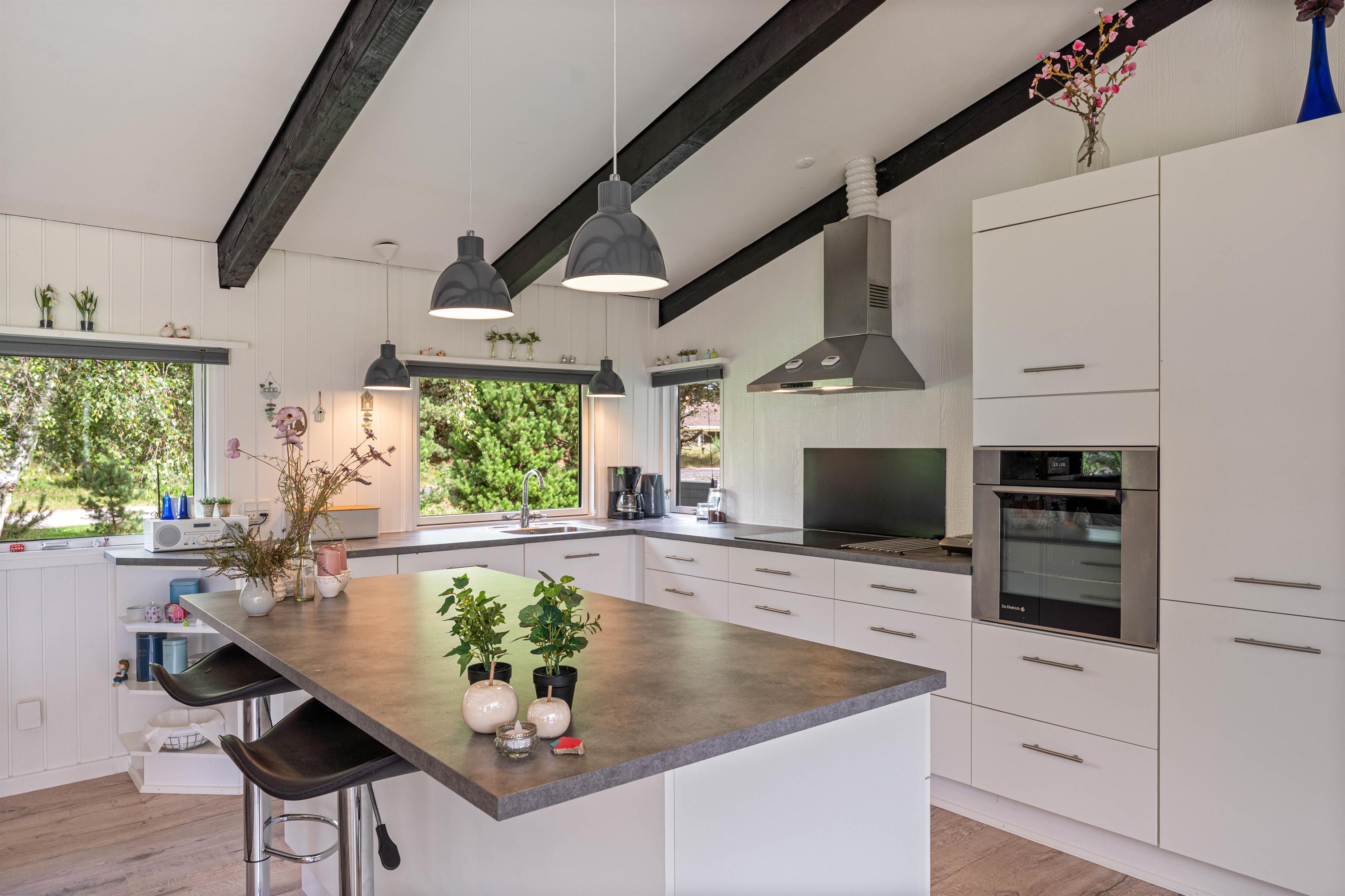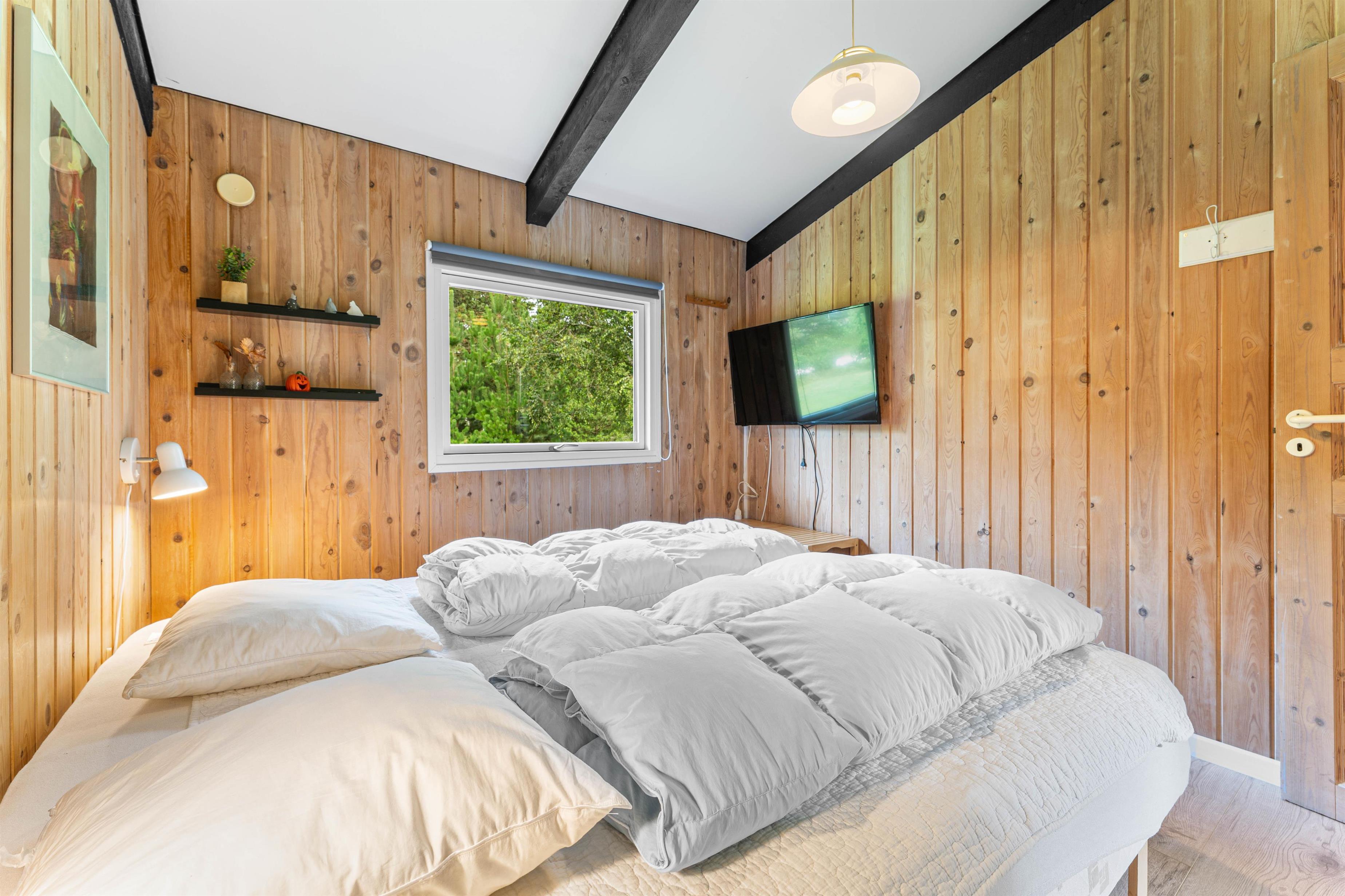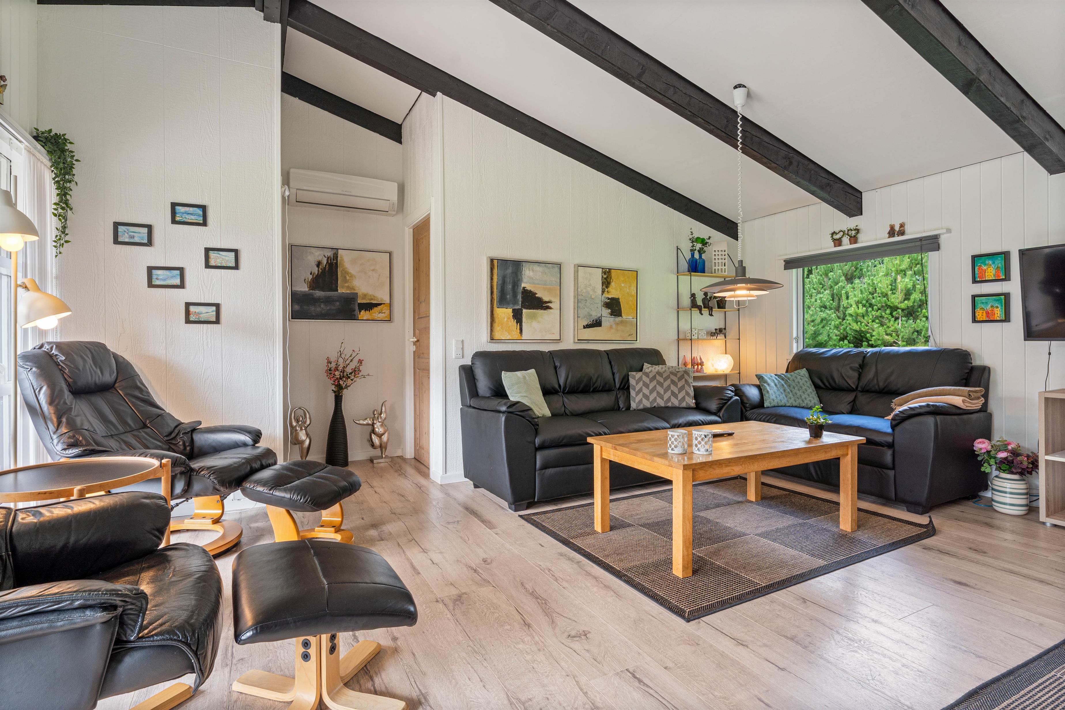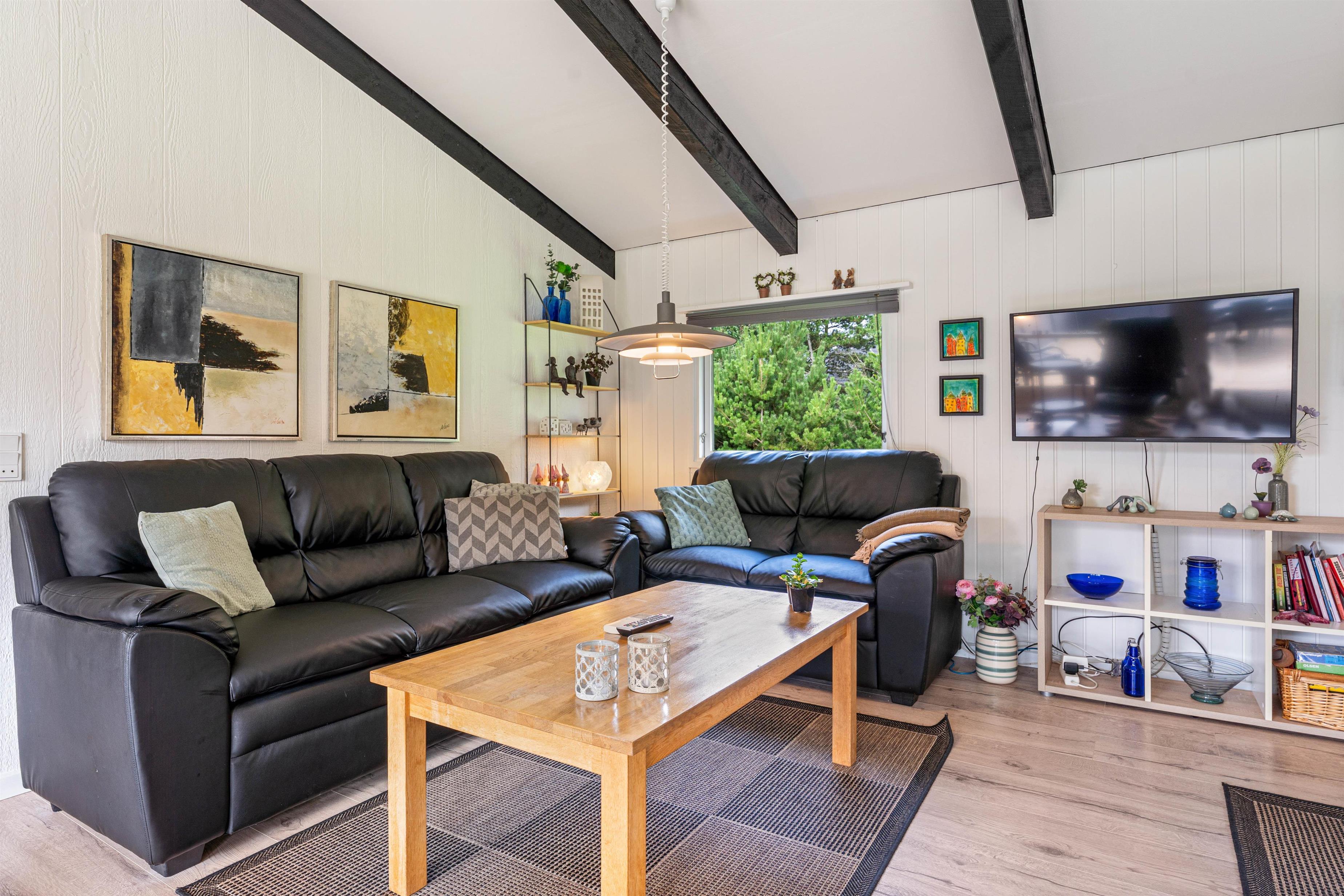 Det fine sommerhus på Snogevej 8 byder på 115 velindrettede kvadratmeter. Lyse farver på vægge og lofter skaber en imødekommende atmosfære, og de synlige loftsbjælker og små pyntedetaljer tilfører ekstra sommerhuscharme til huset, som i 2017 gennemgik en renovering.