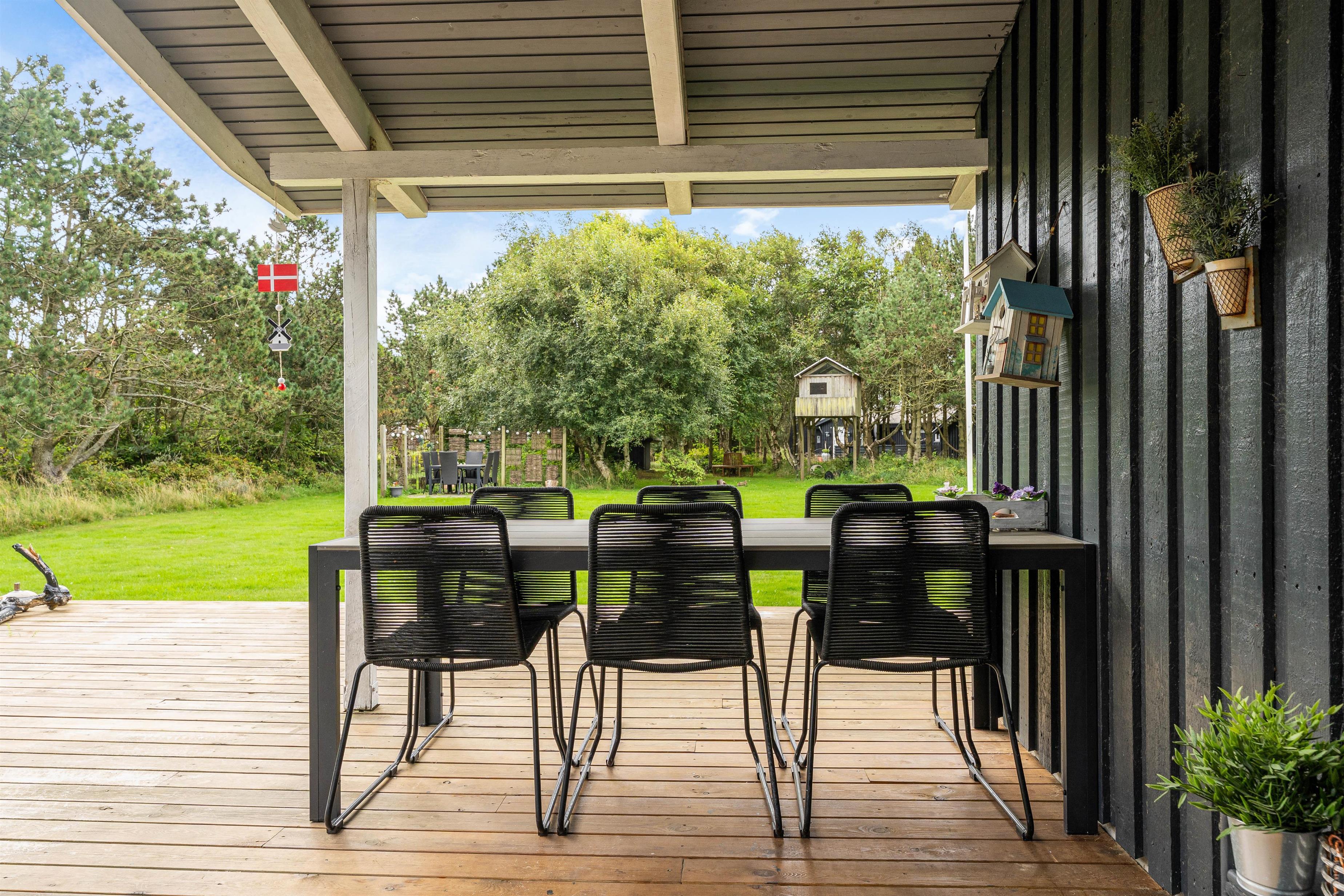 De udendørs omgivelser er helt i top. Fra stuen kommer I ud på den store terrasse, som både har en overdækket og afskærmet del. På den store græsplæne kan børnene og hunden få lov til at tumle, mens I tager en slapper i liggestolene eller får en kop kaffe ved havebordet og stadig kan holde øje med dem.
