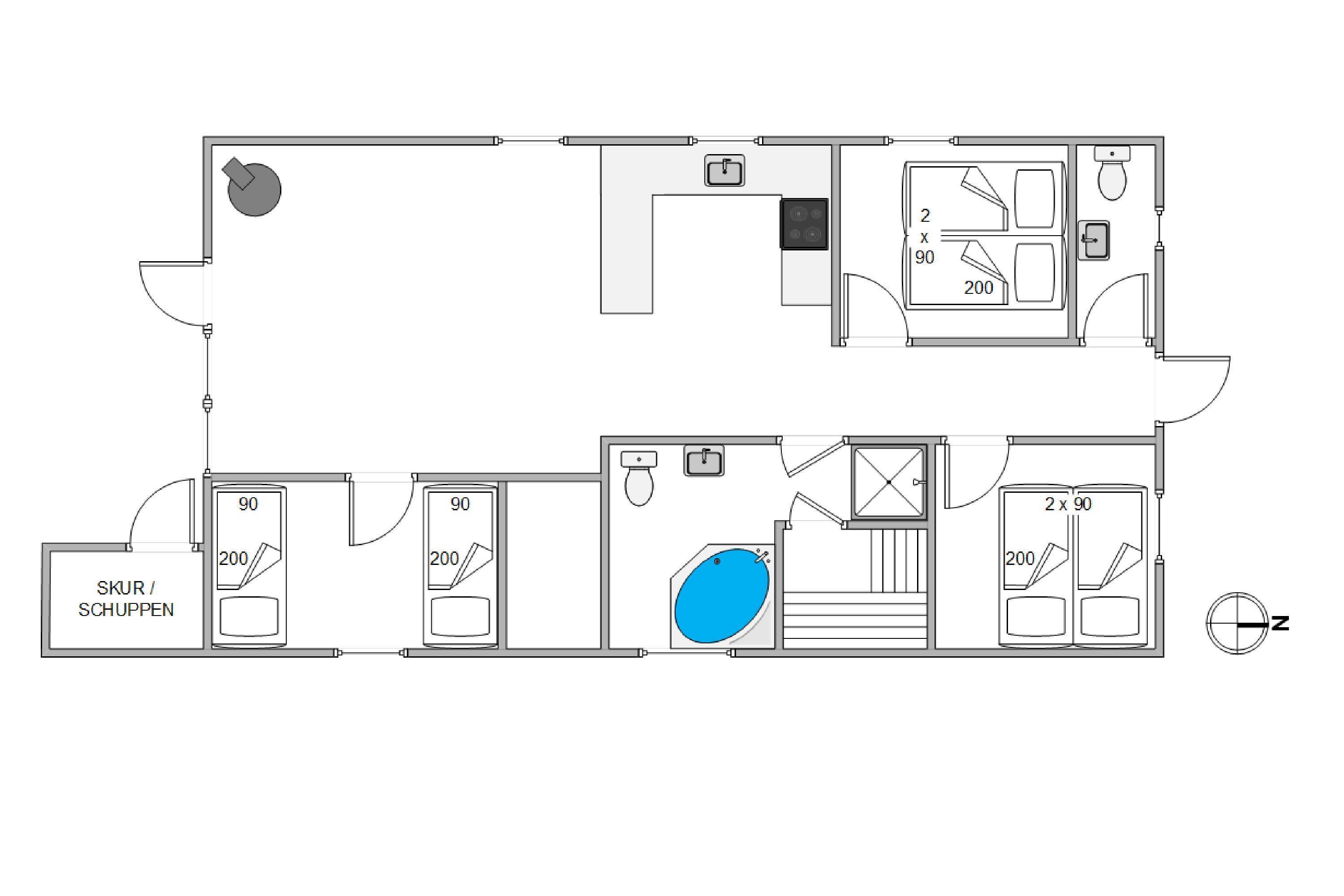 Som en ekstra luksus har I på Engesøvej 4 jeres egen lille wellness-afdeling. I badeværelset er både 2-personers spa og en skøn sauna, så I har muligheden for rigtigt at slappe af og blive gennemvarmet efter en lang dag i den friske havluft. Et gæste-wc sørger for at den gode stemning holder, - også om morgenen, når alle hurtigt vil gøre sig klar til endnu en dejlig dag ved stranden.
