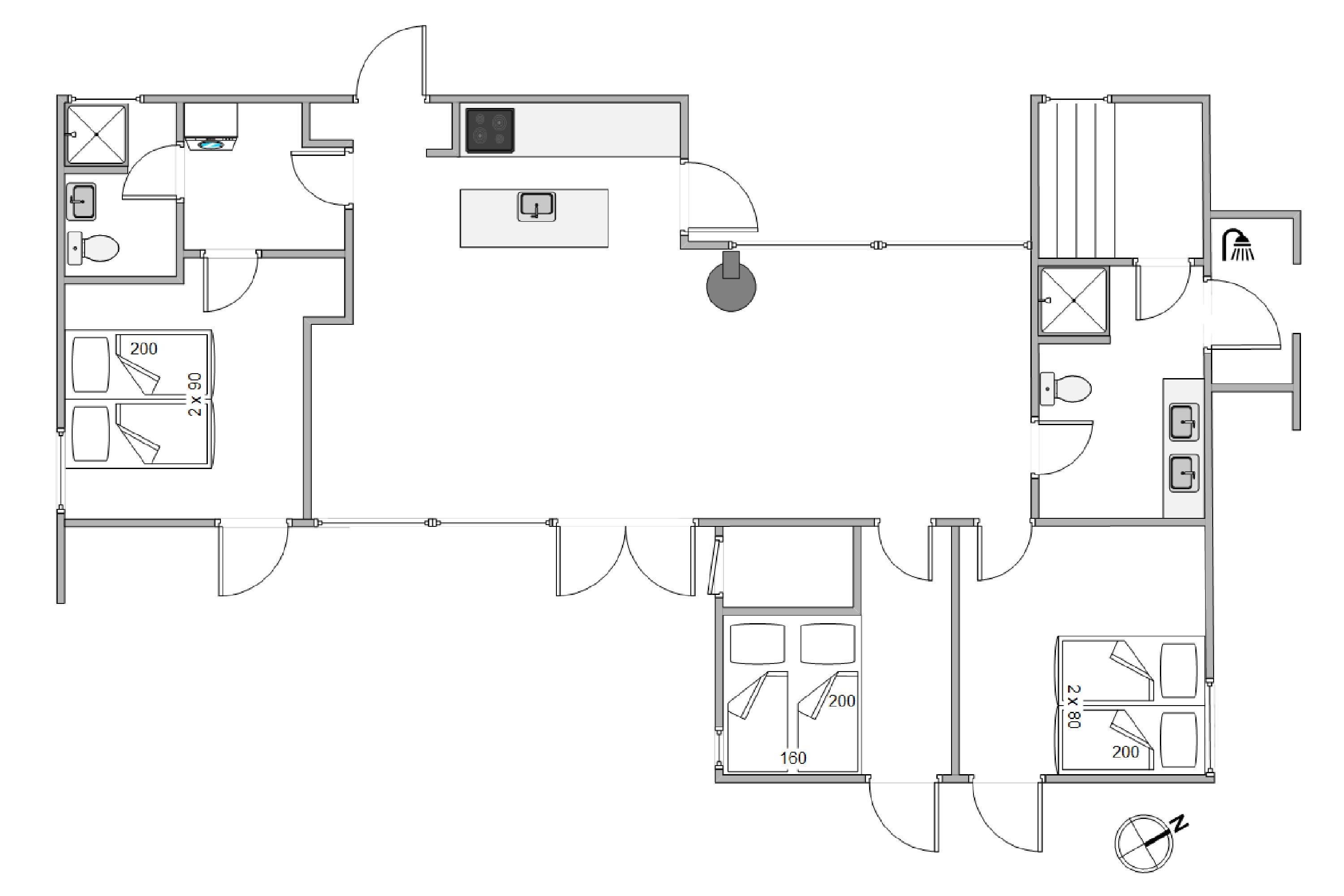 Særligt praktisk er, at der på sommerhusets nordside er anbragt en udebruser. Her kan I skylle jer af efter en tur på stranden. Fra udebruseren kan I gå direkte ind på det ene af sommerhusets badeværelser og evt. videre til saunaen, så I rigtigt kan få varmen igen efter strandturen. Udebruser er lukket fra 1. november til 1. april på grund af frosten.
