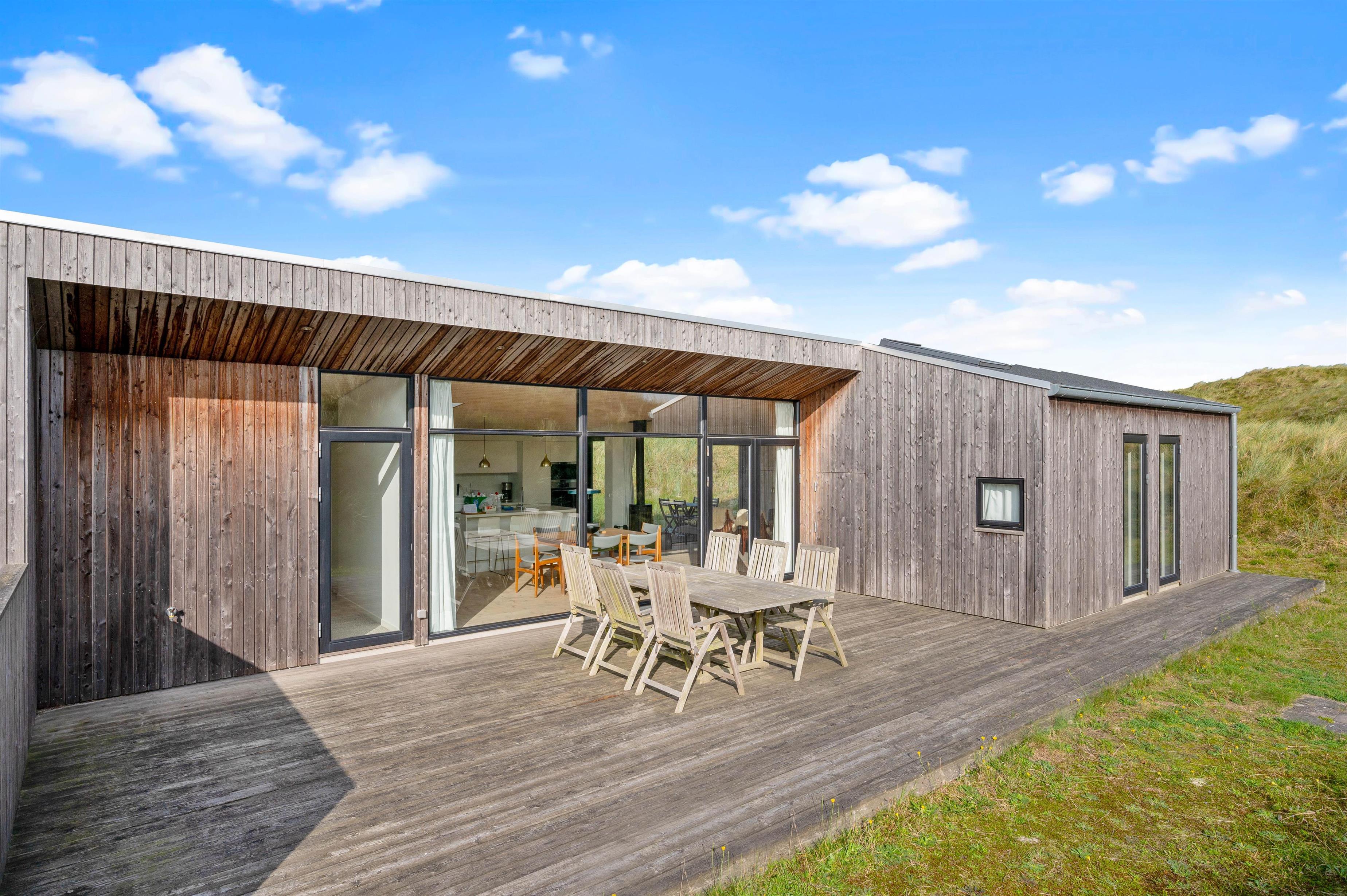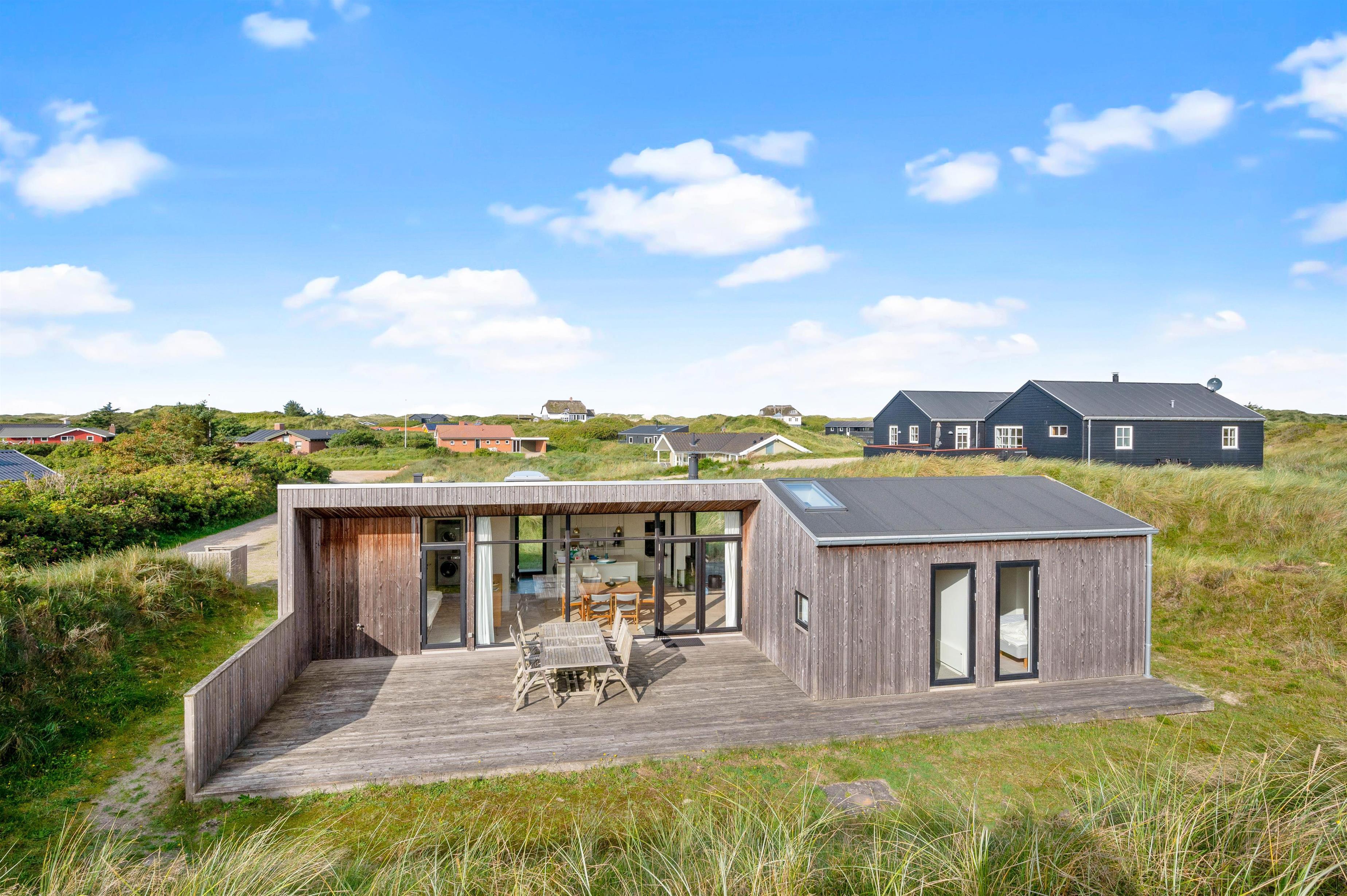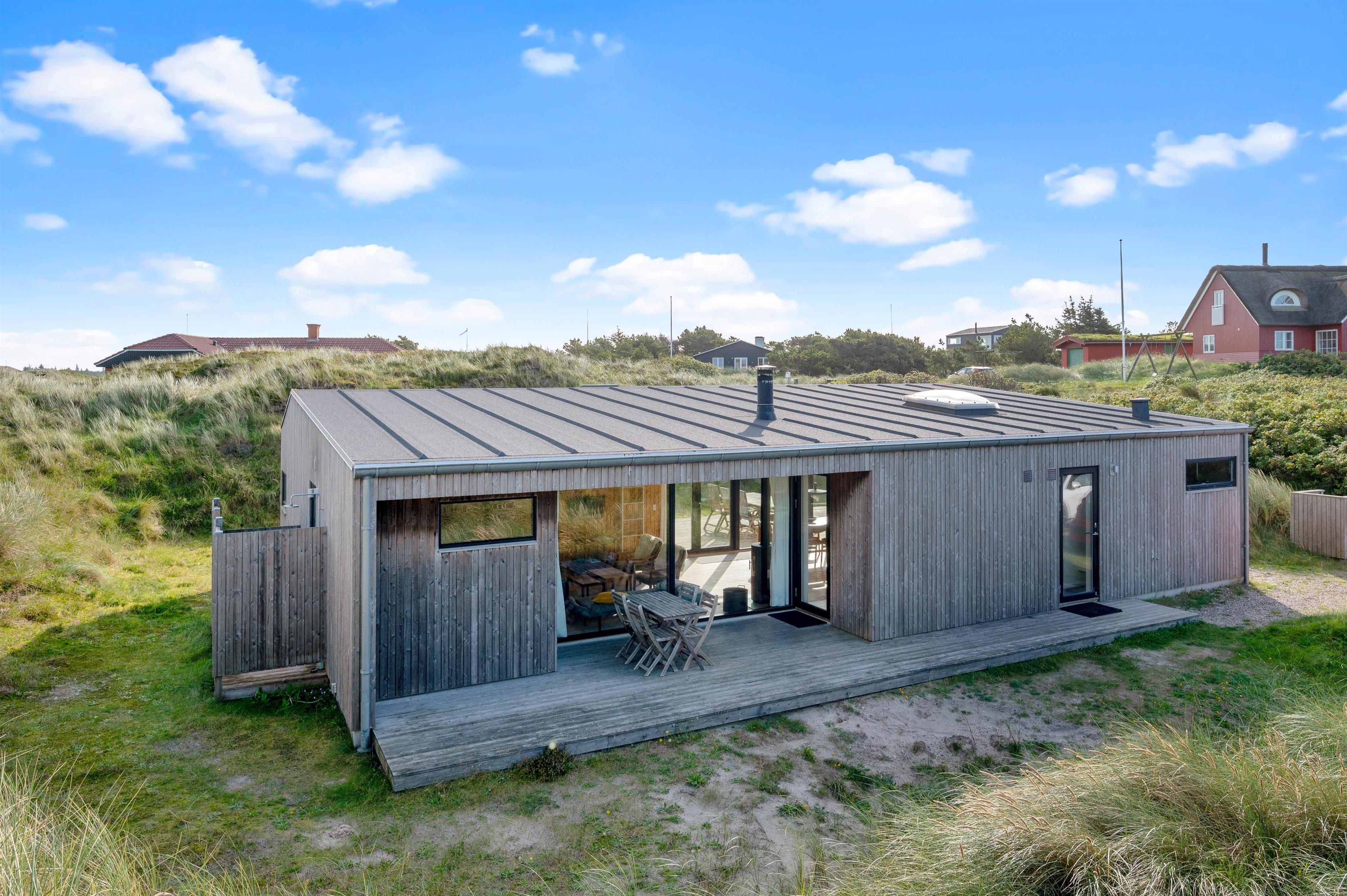 På en kuperet klitgrund i Vejers Strand ligger dette moderne sommerhus på Tyttebærvej 1B. I det arkitekttegnede sommerhus fra 2014 kan 6 personer holde en skøn ferie i lækre, moderne og lyse omgivelser. Saunaen sørger for, at I kan forkæle jer med ekstra afslapning. På de 2 terrasser kan I tilbringe jeres ferie udendørs, og udebruseren kan I skylle jer under efter en tur ved stranden, der ligger kun 250 meter væk.