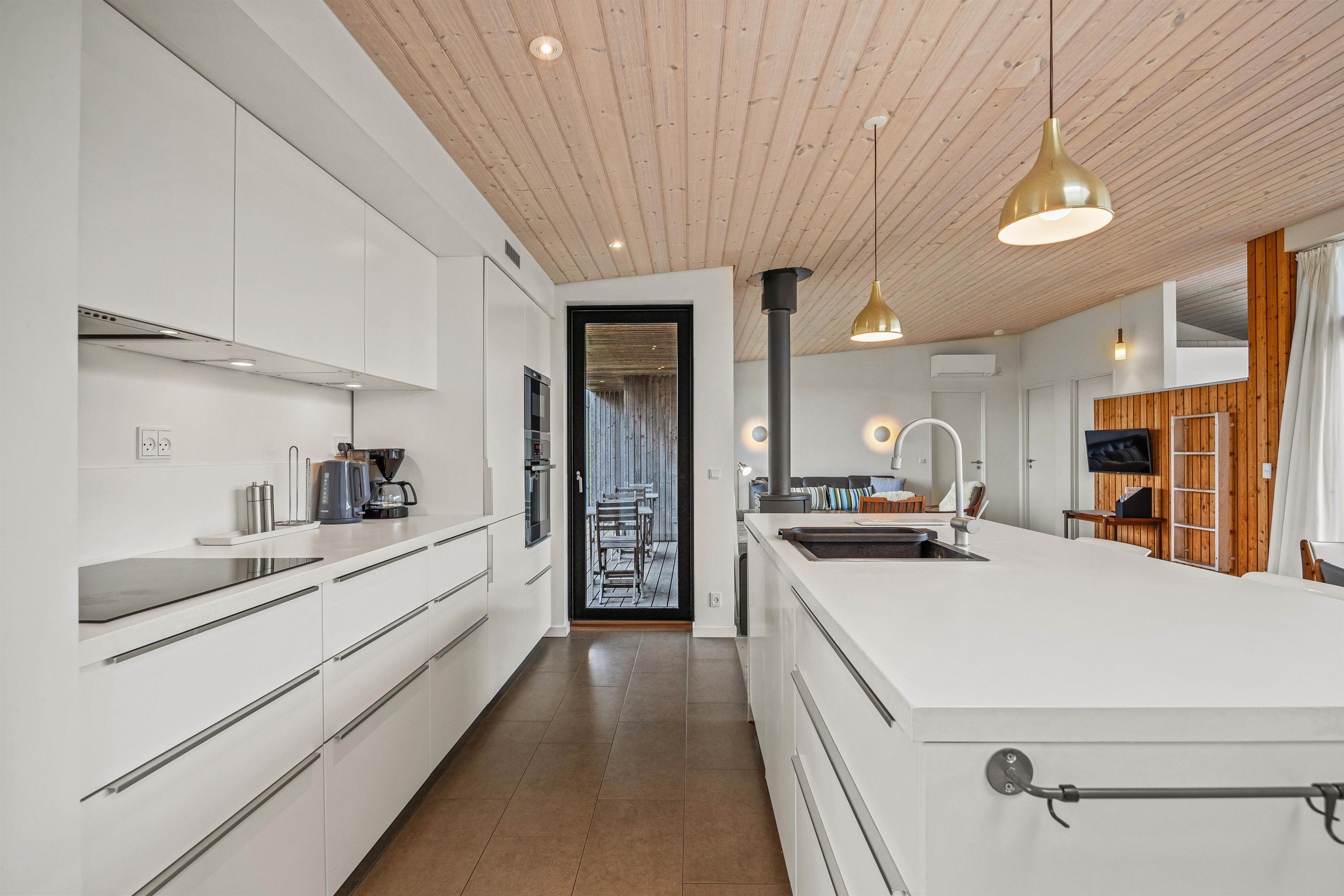 Sommerhusets samlingspunkt er opholdsrummet, hvor køkken, spisestue og stue bliver forenet i ét. Det er det perfekte sted at mødes, når de kommende feriedage skal planlægges eller til en hyggelig stund med en god film eller et sjovt spil omkring spisebordet. Brændeovnen i stuen fuldender den gode feriestemning.