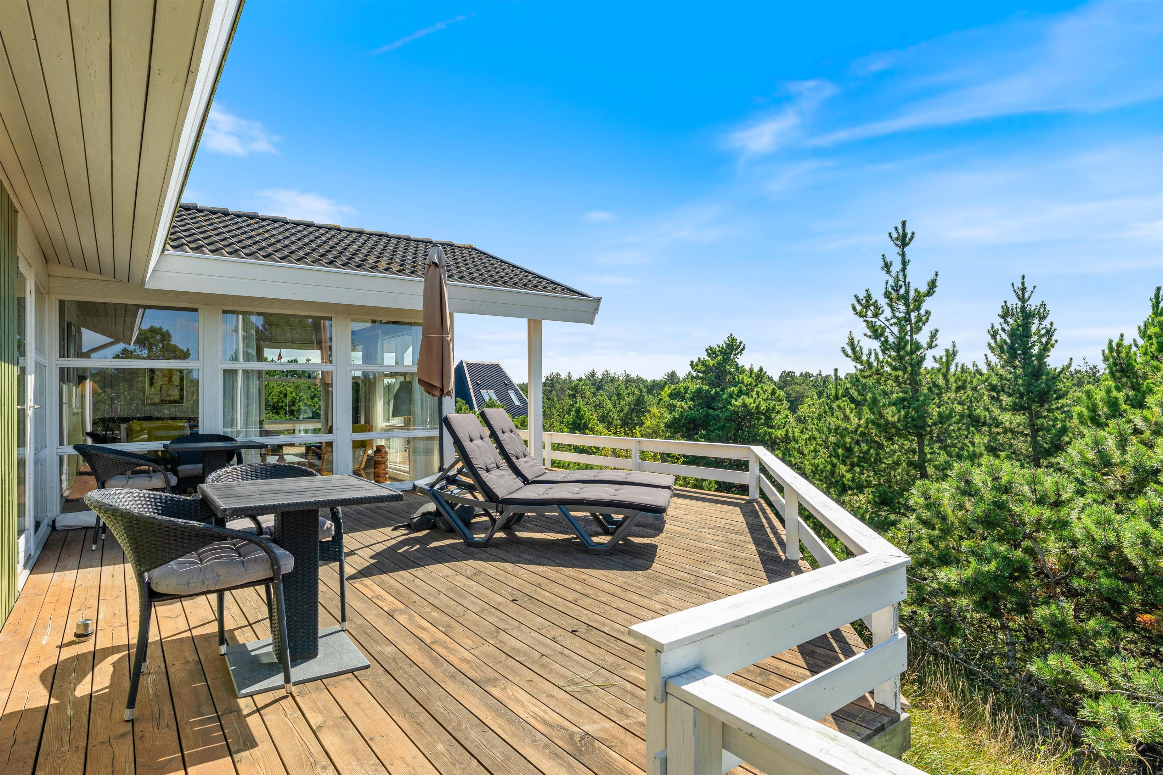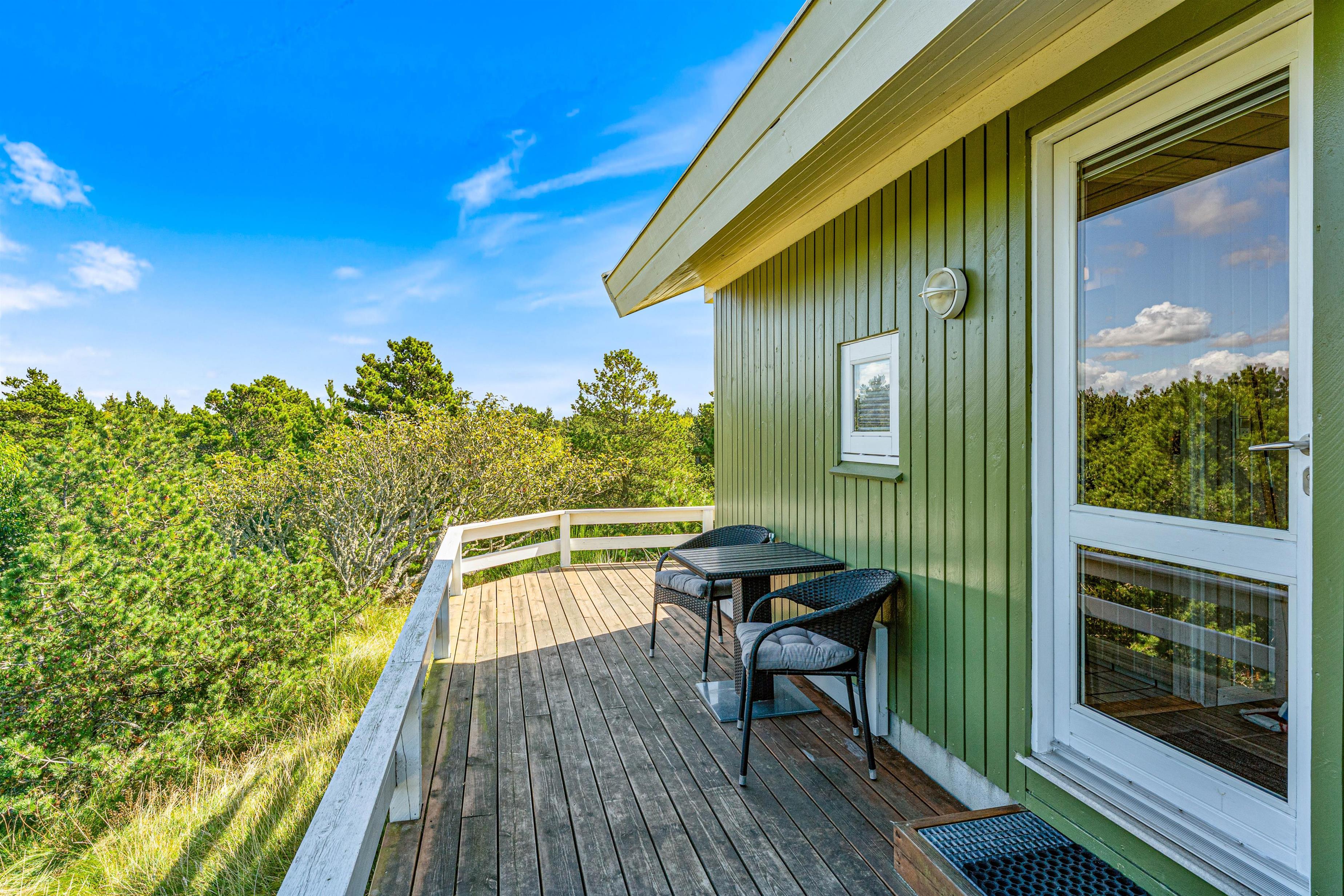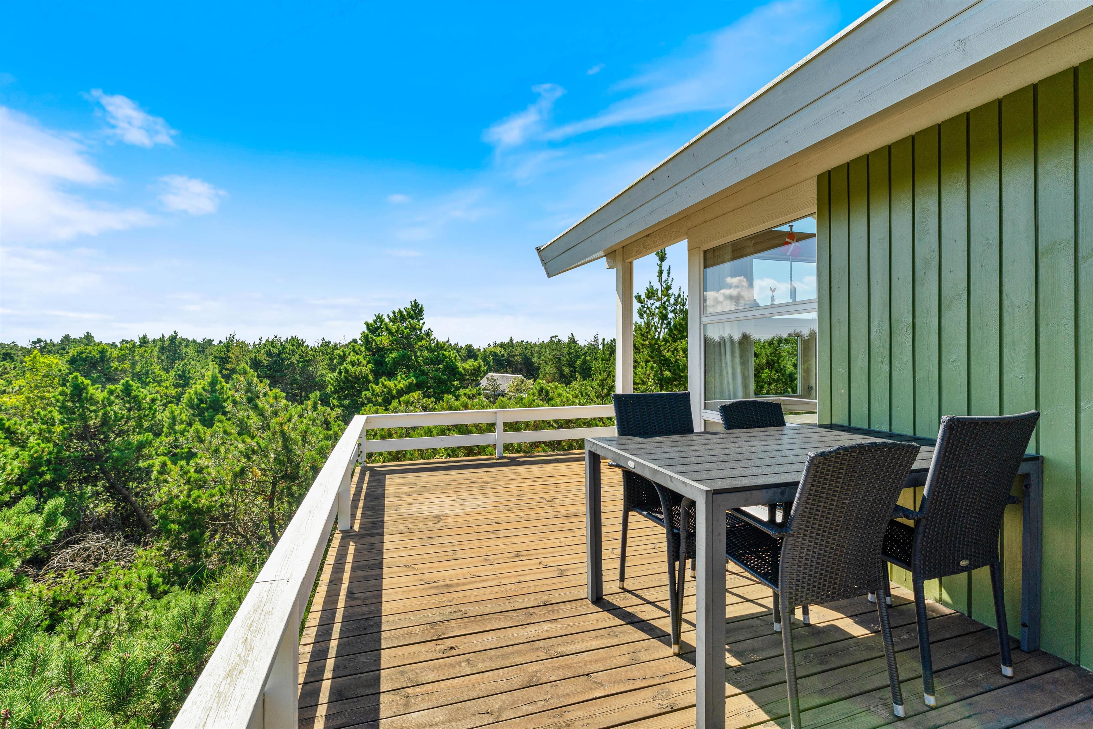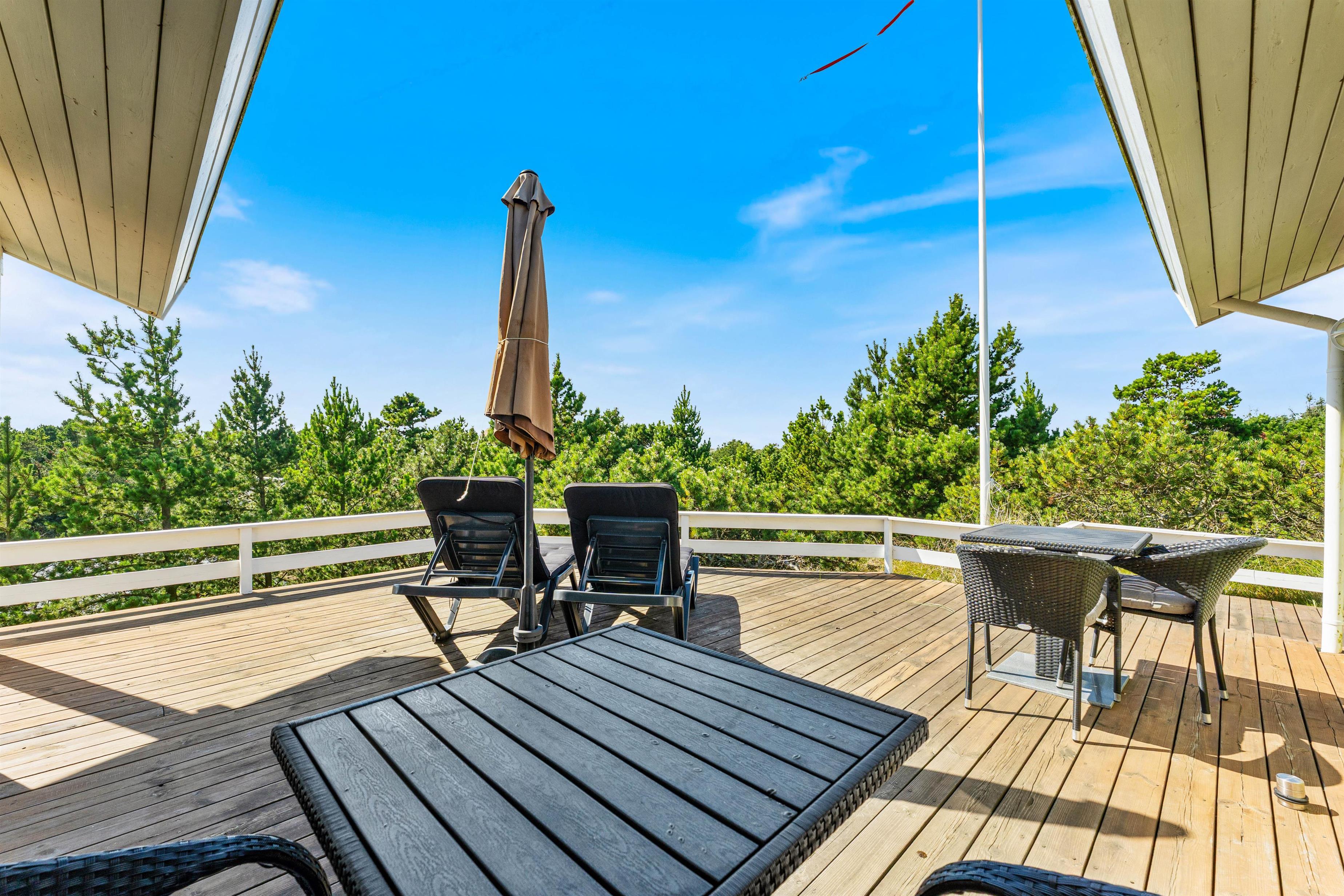 Stil bilen i carporten, inden I tager trappen op til feriehuset. Når I ankommer på terrassen, er feriestemningen sat! Her er udsigten slående, og I kan rigtigt fornemme områdets duft af Vesterhavet og fyrretræer. Terrassen bliver hurtigt omdrejningspunkt for dagens mange aktiviteter. Den er delvist overdækket og praktisk indrettet, så der altid er et hjørne til liggestolene med læ og sol, samtidig med at I har det store udsyn over området.