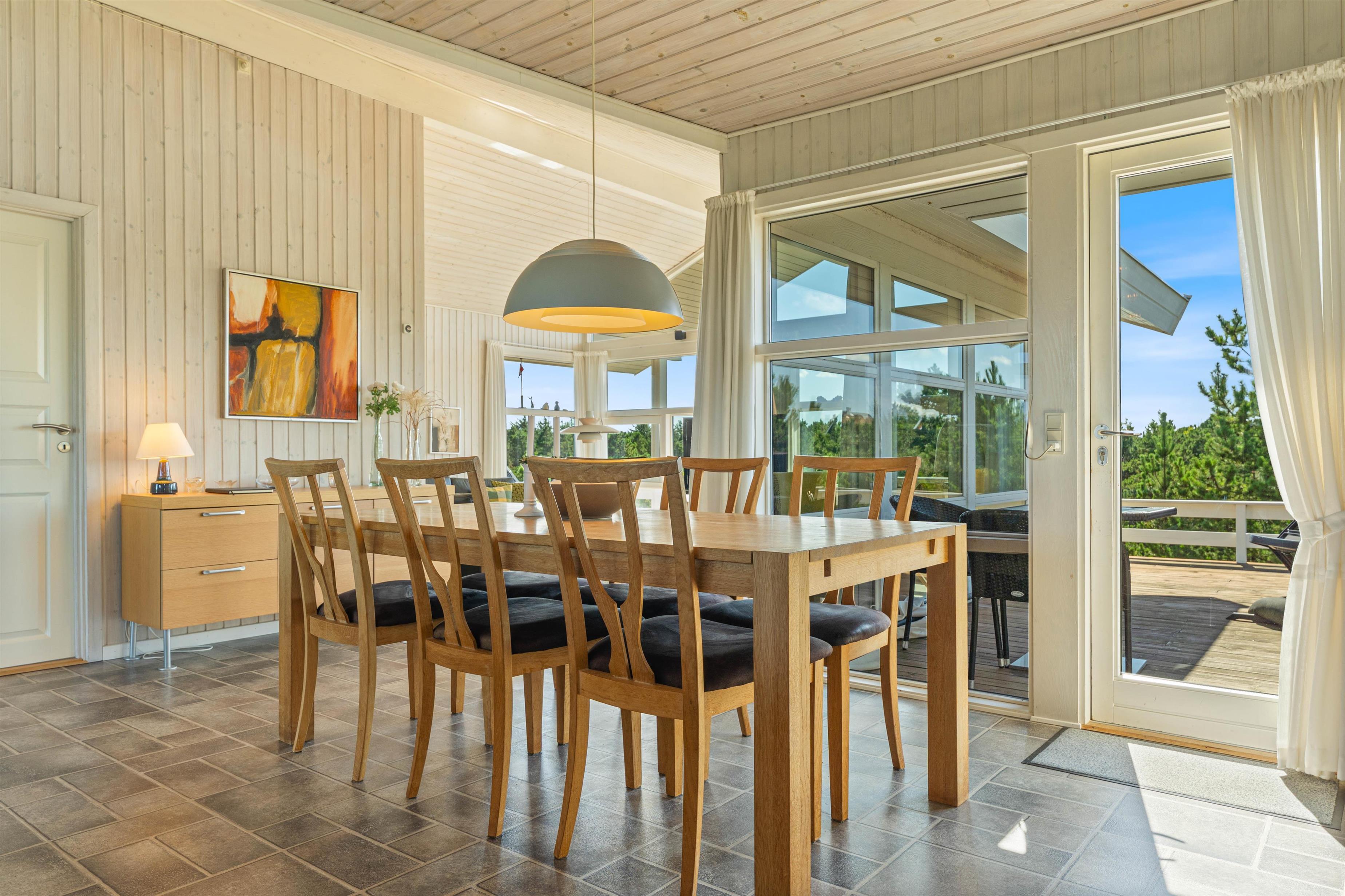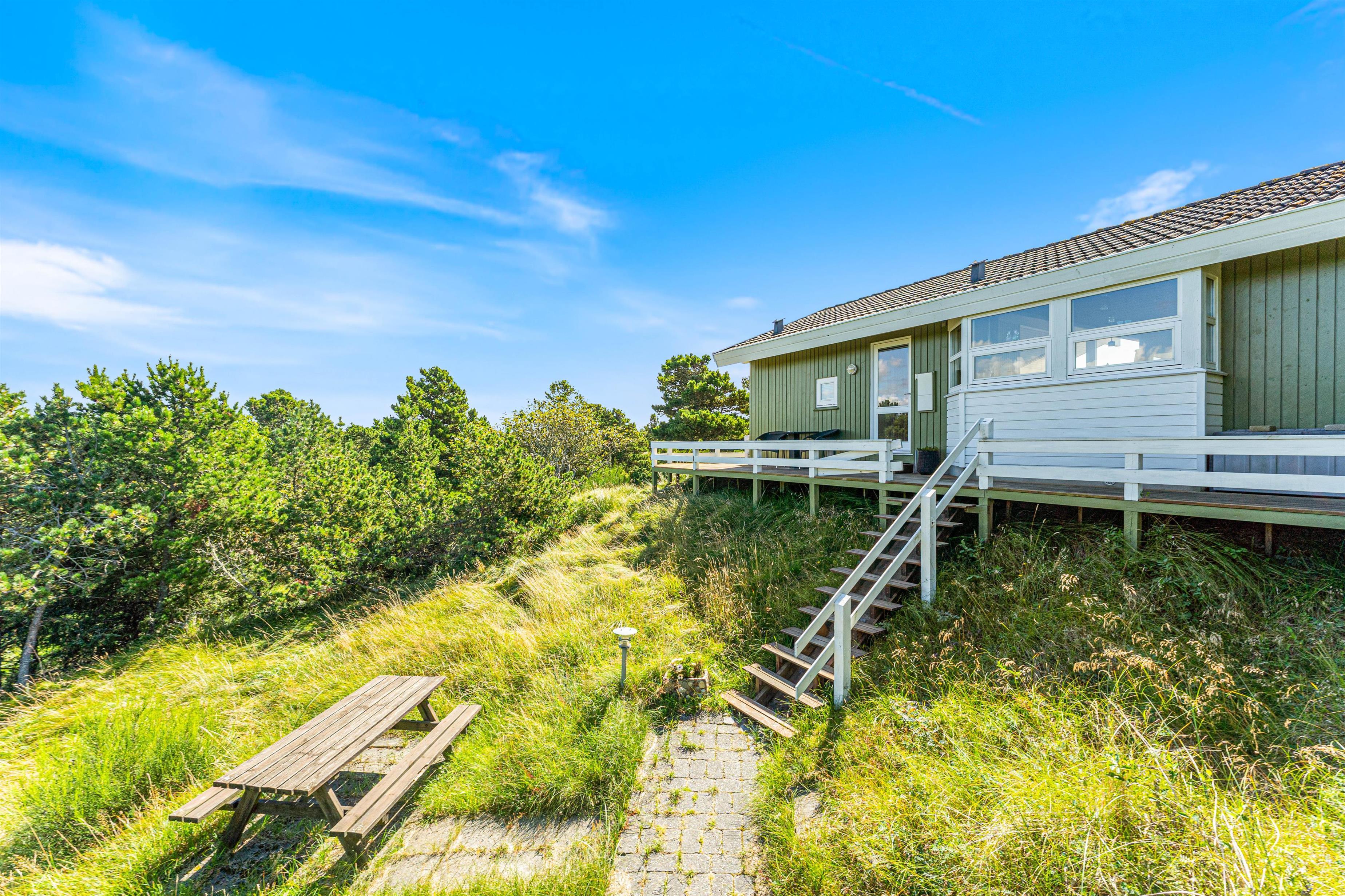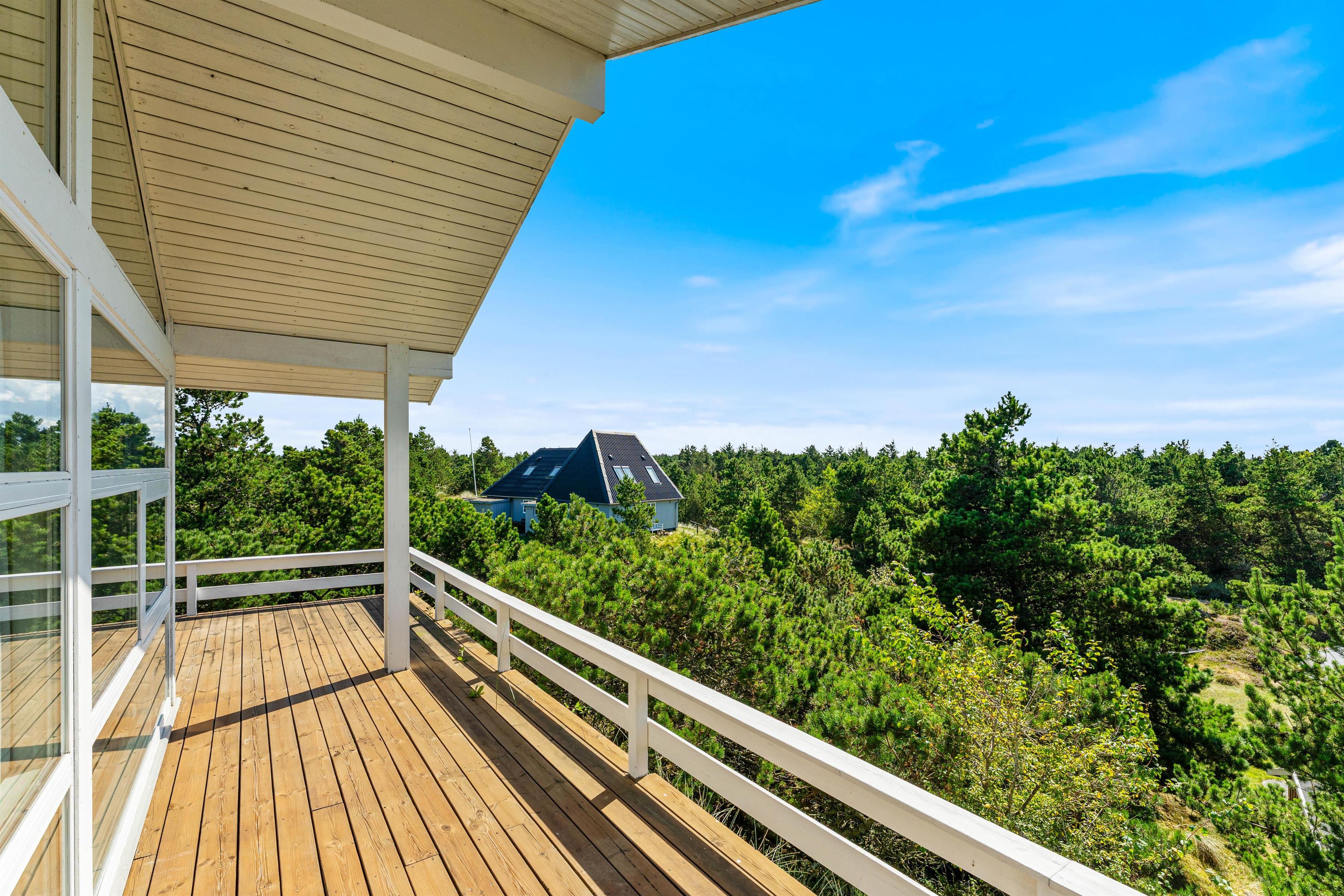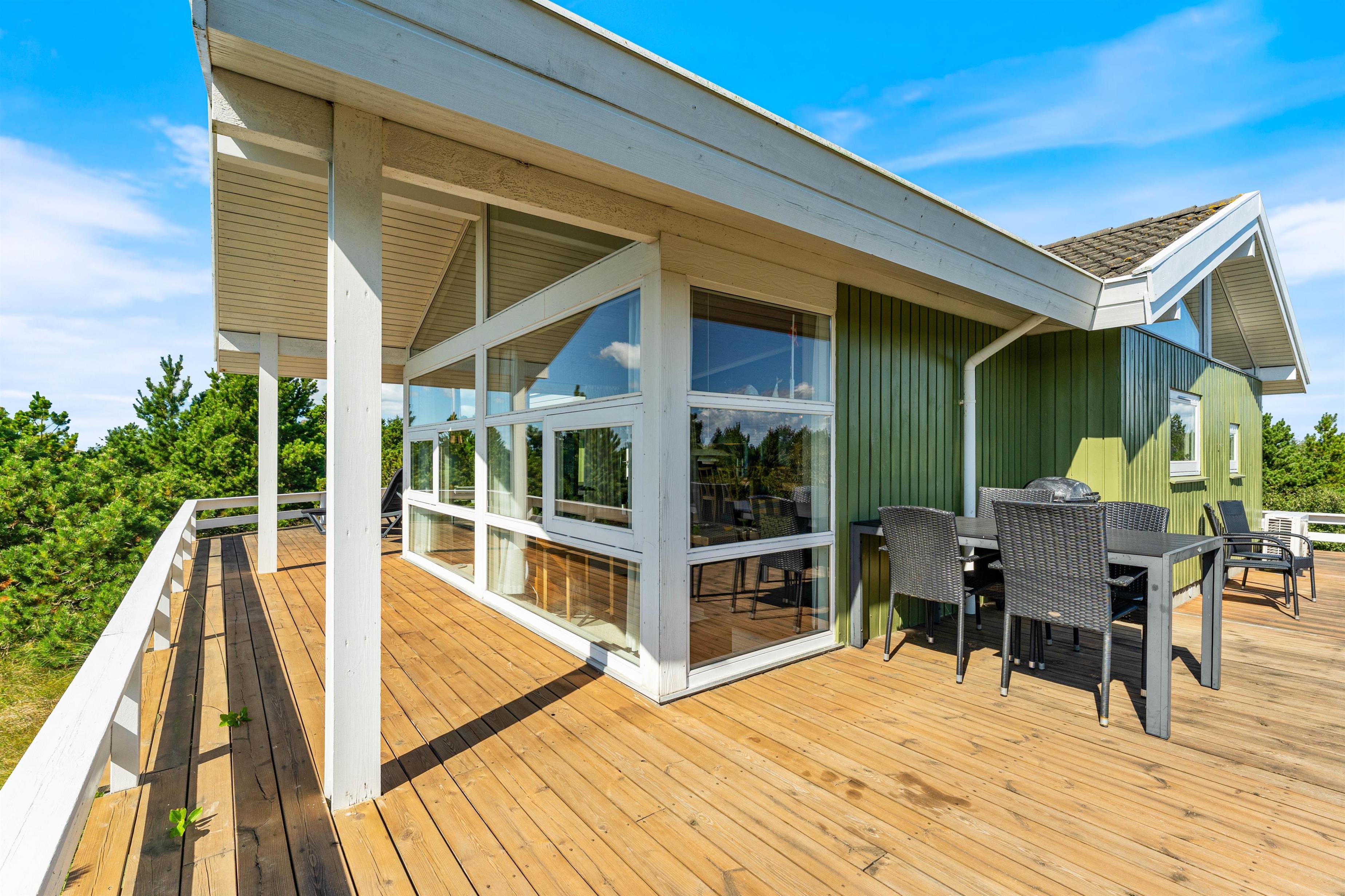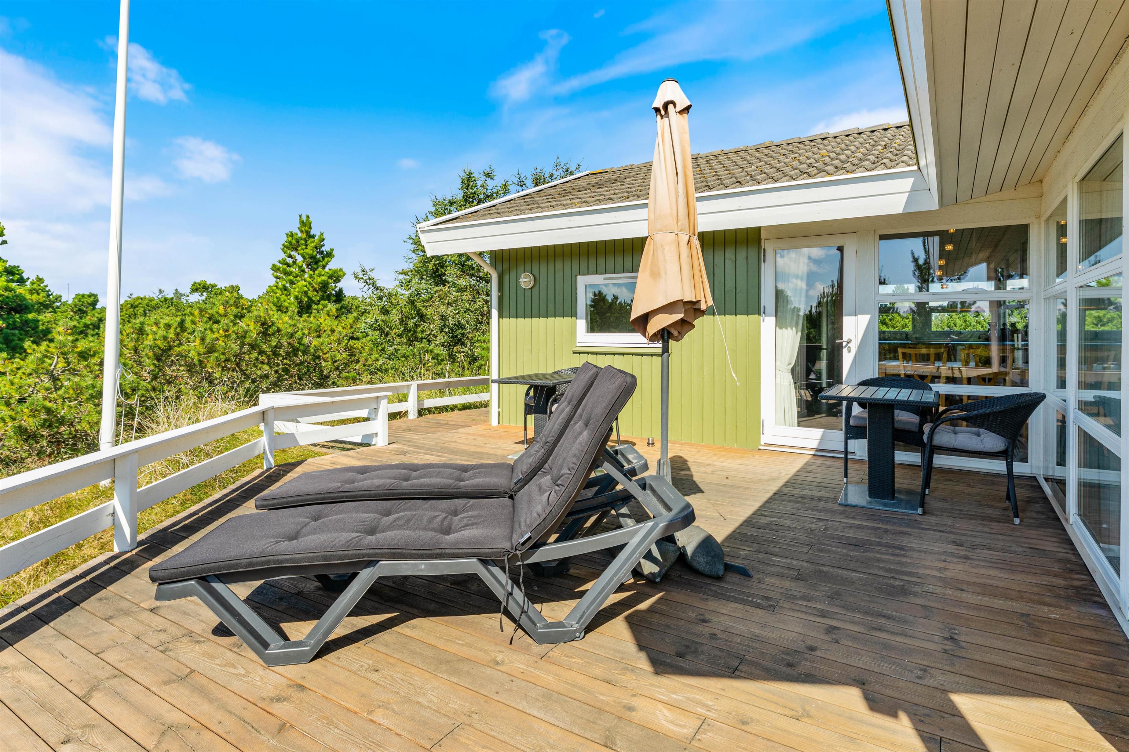 Stil bilen i carporten, inden I tager trappen op til feriehuset. Når I ankommer på terrassen, er feriestemningen sat! Her er udsigten slående, og I kan rigtigt fornemme områdets duft af Vesterhavet og fyrretræer. Terrassen bliver hurtigt omdrejningspunkt for dagens mange aktiviteter. Den er delvist overdækket og praktisk indrettet, så der altid er et hjørne til liggestolene med læ og sol, samtidig med at I har det store udsyn over området.